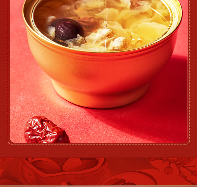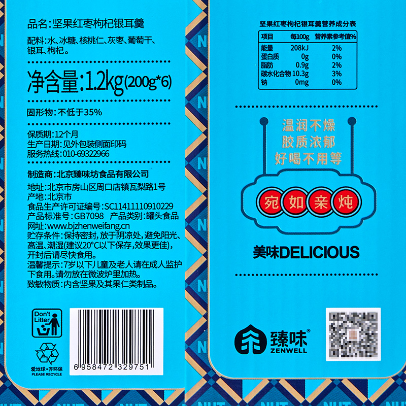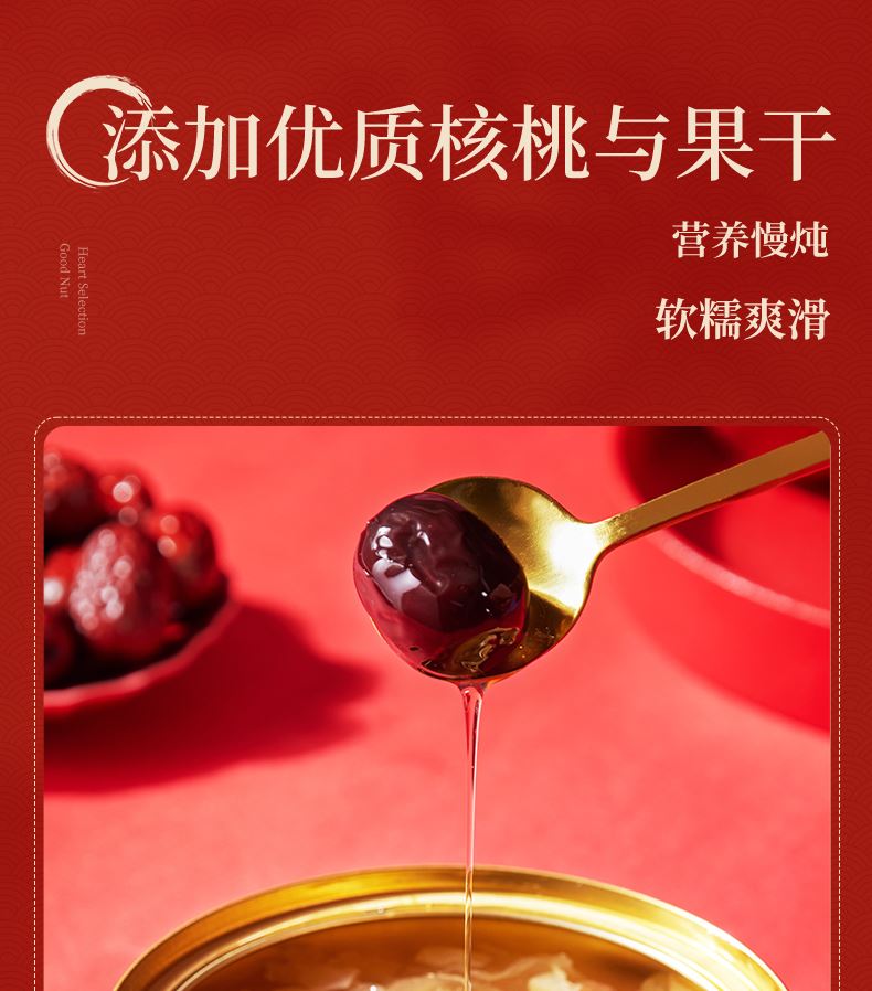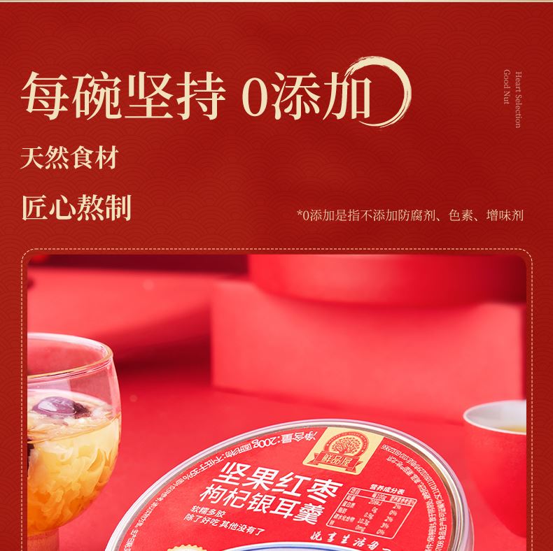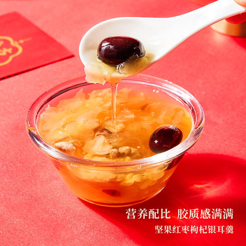 200g坚果红枣枸杞银耳羹*6 添加优质核桃与果干, 搭配泡发后的胶质银耳, 营养慢炖,软糯爽滑, 每碗坚持0添加,独立包装开盖即食, 轻松享受,健康滋养。
