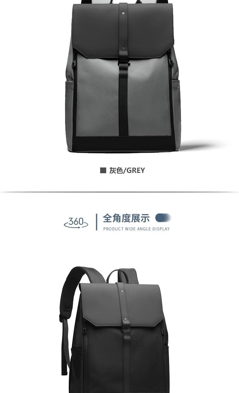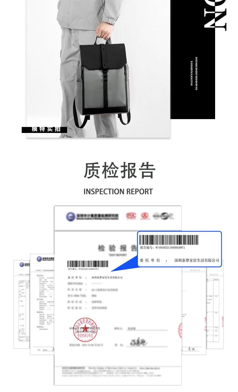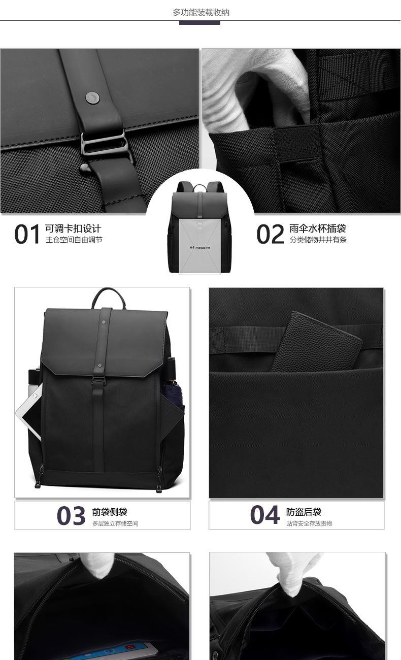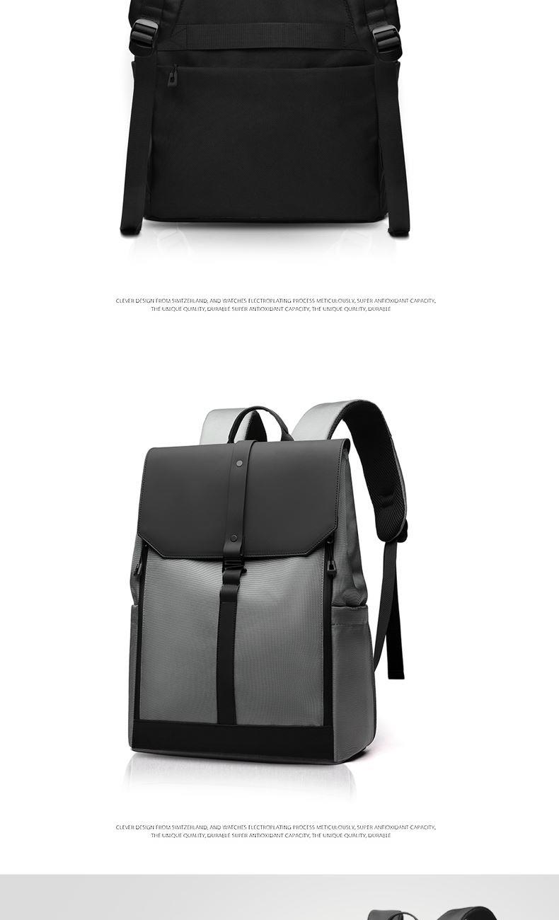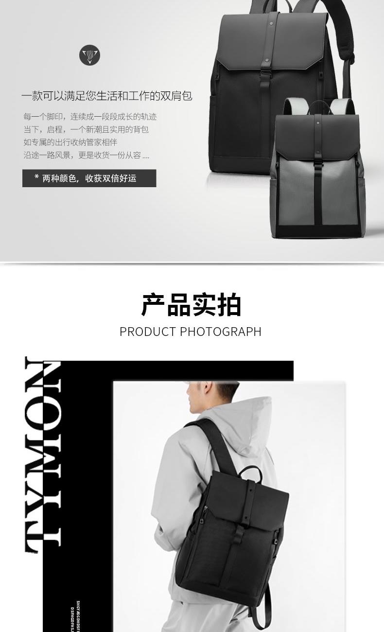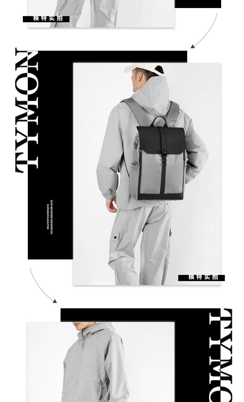 材质:牛津布+PU 里衬:聚酯纤维 尺寸:42*30*16cm 颜色:黑色/灰色 货号:TM-8022 1、青春潮酷先锋设计,防泼水撞色双拼面料; 2、敞开式大开口主仓;拉链+纽扣+挂扣三重封口; 3、自由可调节挂扣遮盖,主仓容量自行切换; 4、内外十个科学分仓,独立防撞电脑专用夹层; 5、网状肩带透气不易累,拉杆绑带搭配行李箱; 6、双侧水杯雨伞插袋,贴背证件仓全程安全护航。