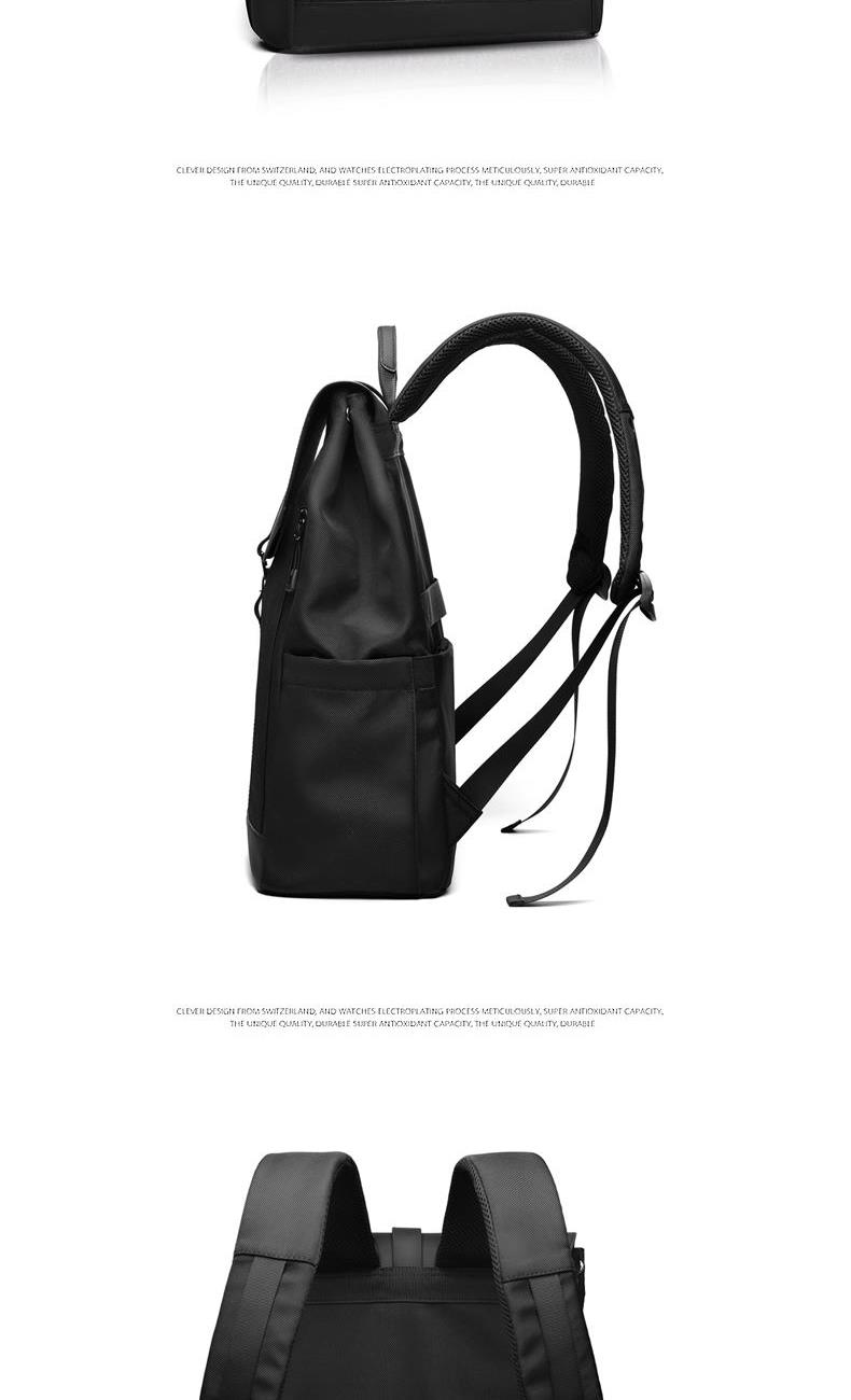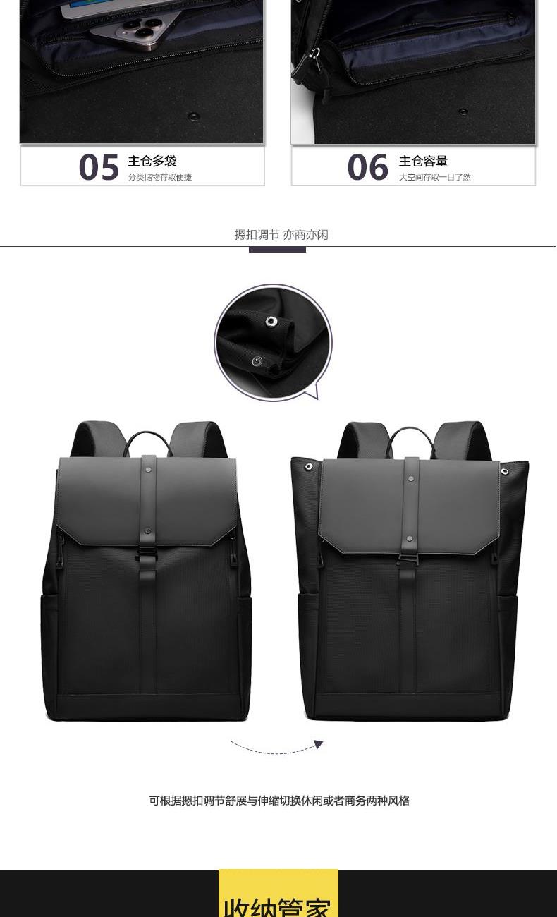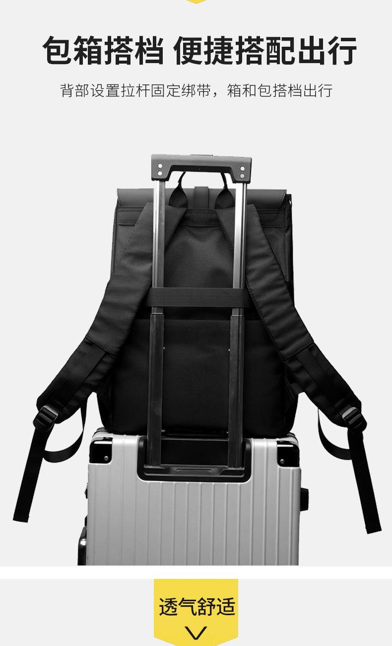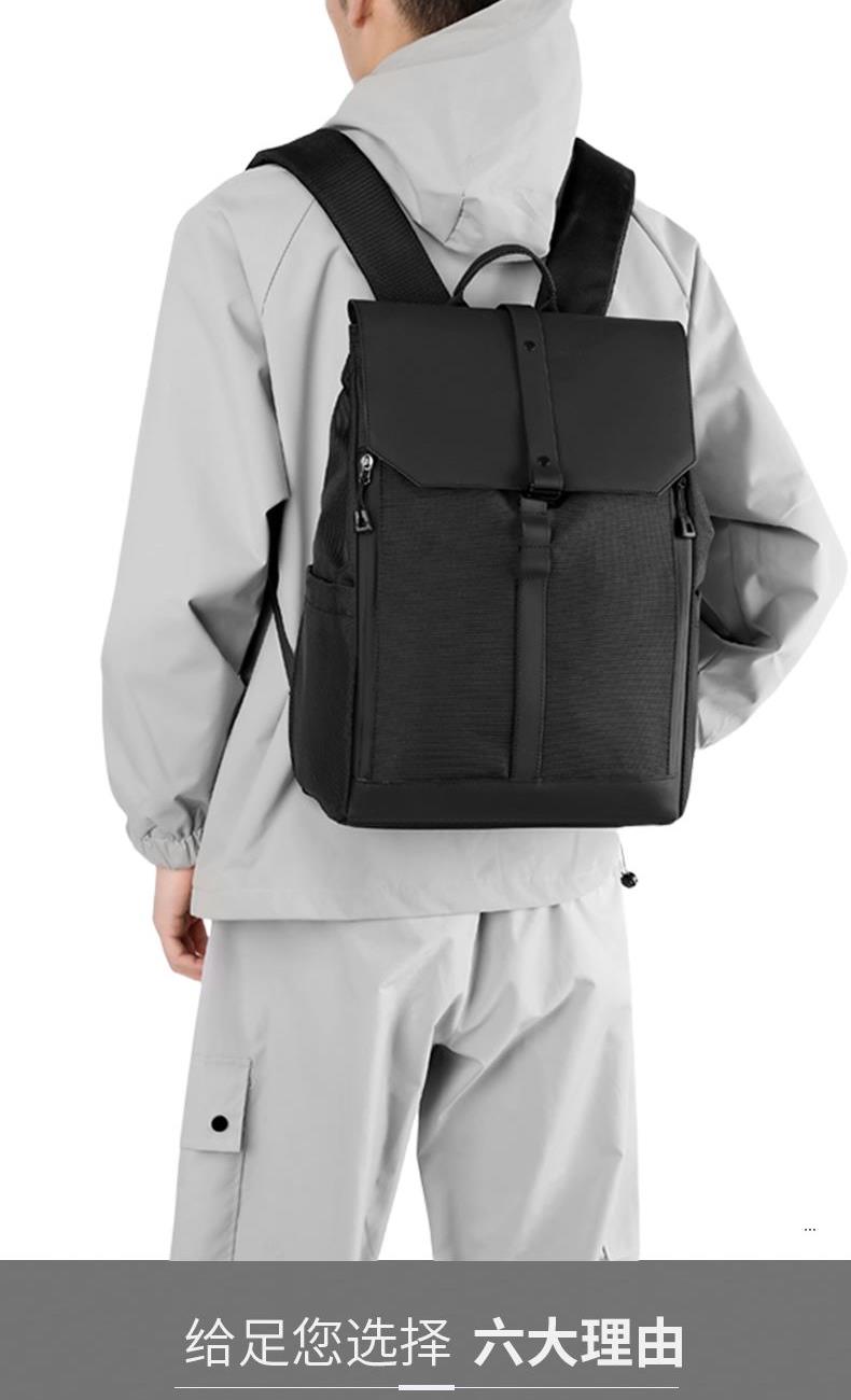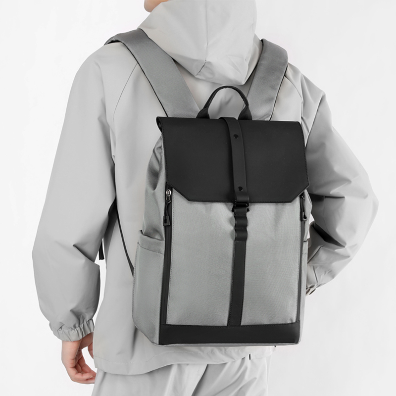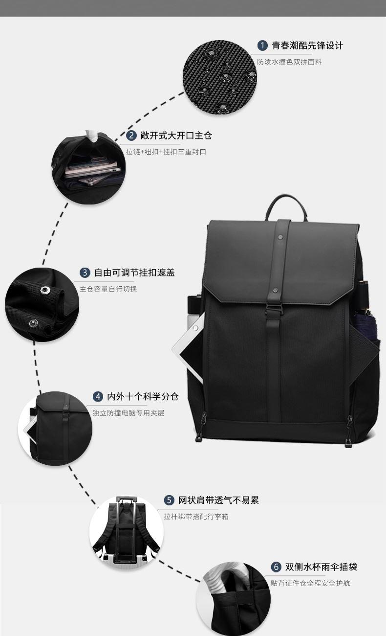 材质:牛津布+PU 里衬:聚酯纤维 尺寸:42*30*16cm 颜色:黑色/灰色 货号:TM-8022 1、青春潮酷先锋设计,防泼水撞色双拼面料; 2、敞开式大开口主仓;拉链+纽扣+挂扣三重封口; 3、自由可调节挂扣遮盖,主仓容量自行切换; 4、内外十个科学分仓,独立防撞电脑专用夹层; 5、网状肩带透气不易累,拉杆绑带搭配行李箱; 6、双侧水杯雨伞插袋,贴背证件仓全程安全护航。