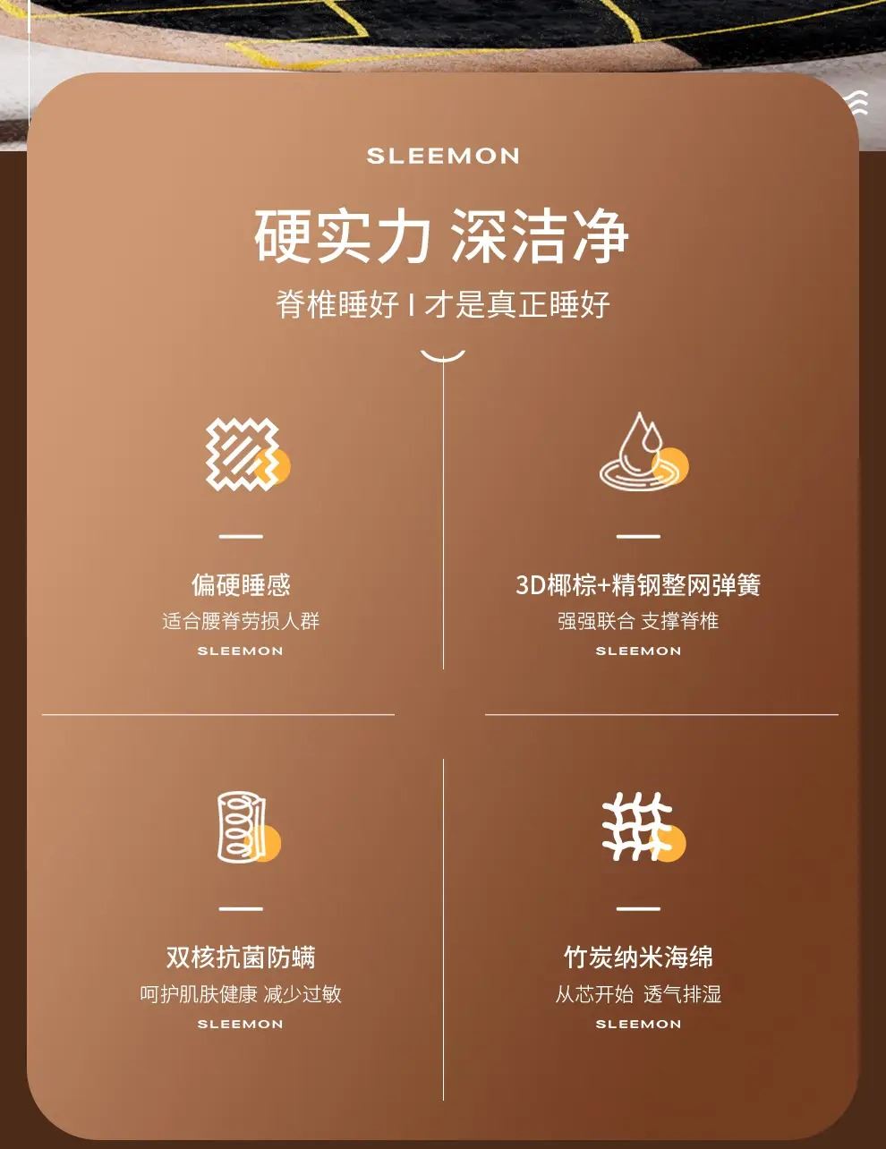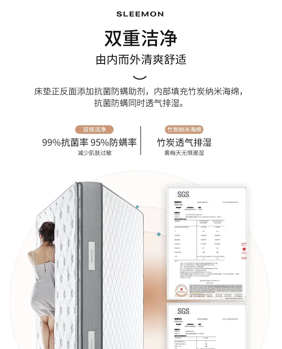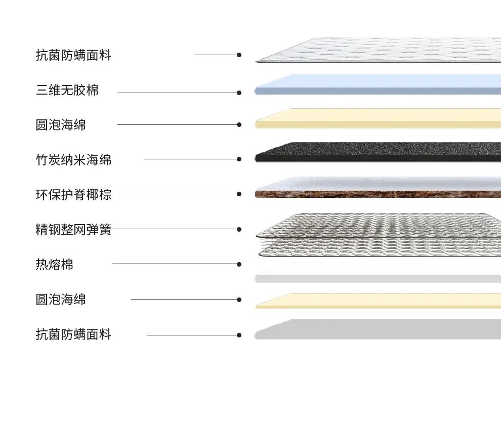 1、强效护脊:软硬适中偏硬,零胶3D椰棕护脊层强力支撑脊椎,减少腰酸背痛,适配老人、儿童、发育期人群及偏爱硬床垫者;弹簧腰部加密设计额外承托腰部,分散身体压力。 2、经久耐用:采用高锰碳素钢整网弹簧,经高温定型、百万次耐久性及滚压测试,经久耐用不易塌陷,可应对儿童蹦跳等使用场景。 3、舒适透气:圆泡海绵搭配纳米竹炭海绵,弹性佳、贴合身体且透气排湿。 4、呵护健康:表层为特级针织面料,细菌抑制率 99.9%,并强效防止螨虫繁殖,打造洁净睡眠环境。 面料:亲肤针织面料 核心材质:零胶3D椰棕、纳米竹炭海绵 弹簧:高锰碳素钢整网弹簧 包装方式:双倍加厚牛皮纸盒 规格尺寸:150*200*22cm
