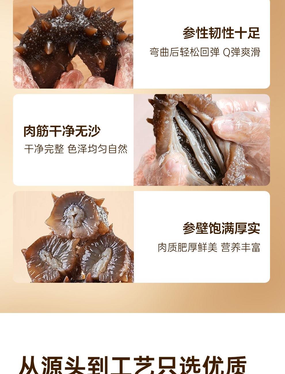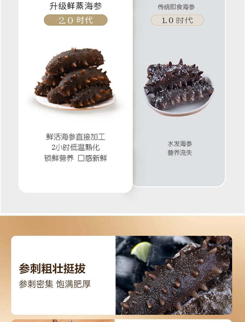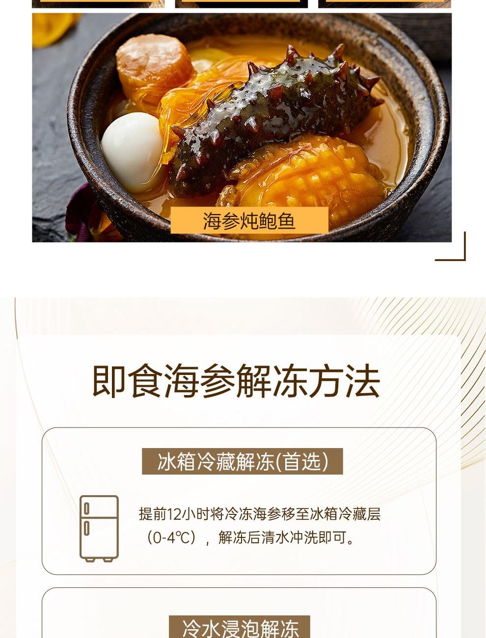 规格:500克/(8-12头) 卖点: 京润堂大连即食海参选自黄金海域北纬39°的辽参,海域环境好,水质清洁、温度适宜,海参品质高。选取参龄5年以上的辽参,富含多种营养成分,如高蛋白含量,海参粘多糖, 维生素和多种微量元素,具有调节体质、抗疲劳、抗肿瘤等潜在功效。