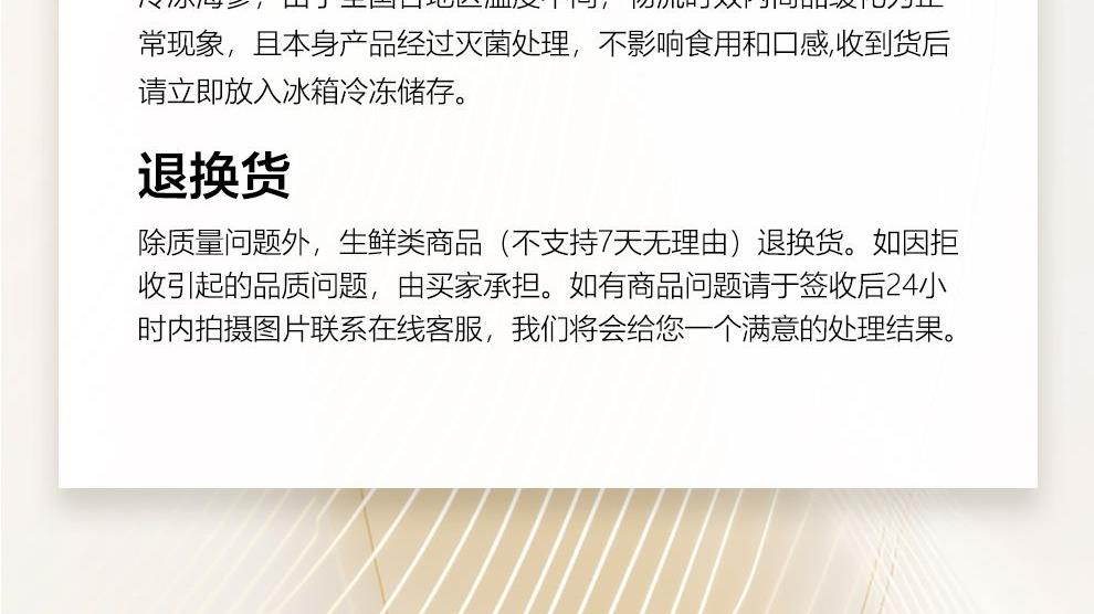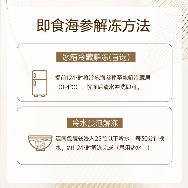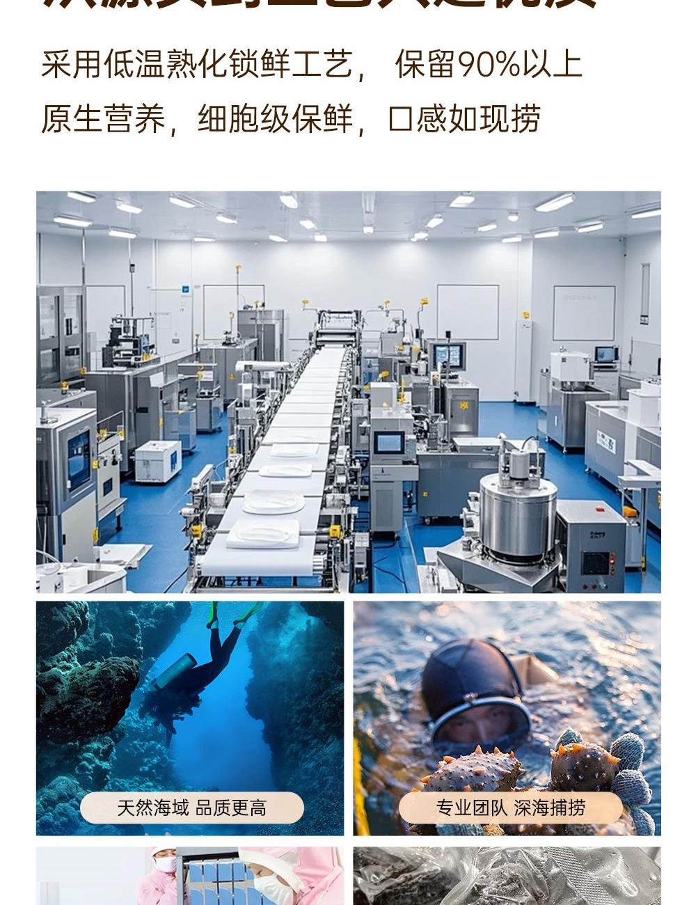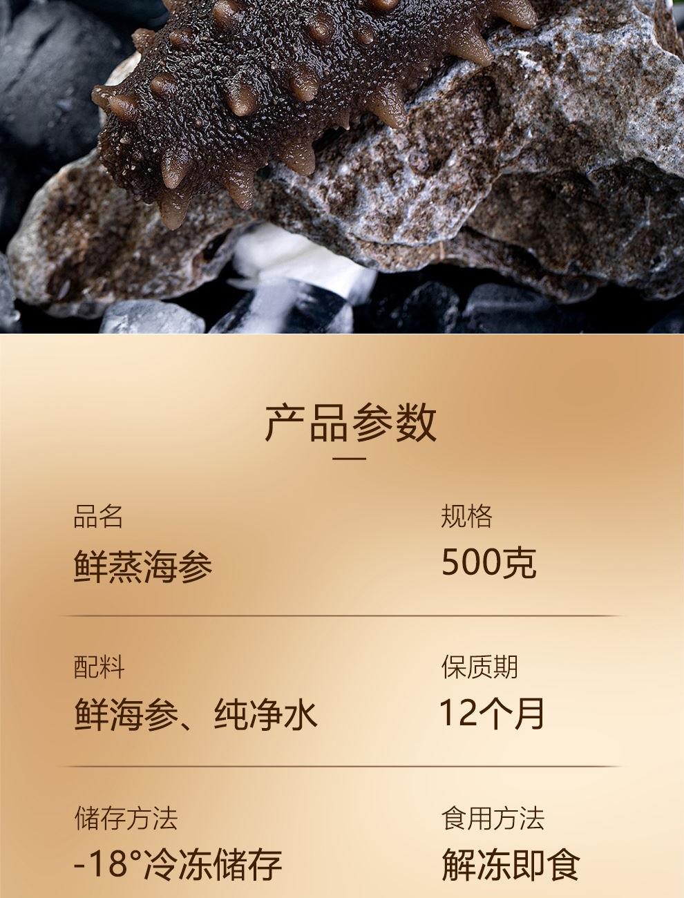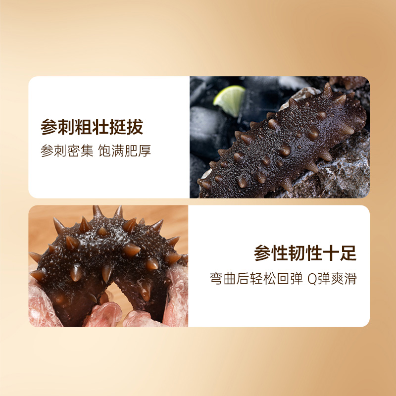 规格:500克/(8-12头) 卖点: 京润堂大连即食海参选自黄金海域北纬39°的辽参,海域环境好,水质清洁、温度适宜,海参品质高。选取参龄5年以上的辽参,富含多种营养成分,如高蛋白含量,海参粘多糖, 维生素和多种微量元素,具有调节体质、抗疲劳、抗肿瘤等潜在功效。