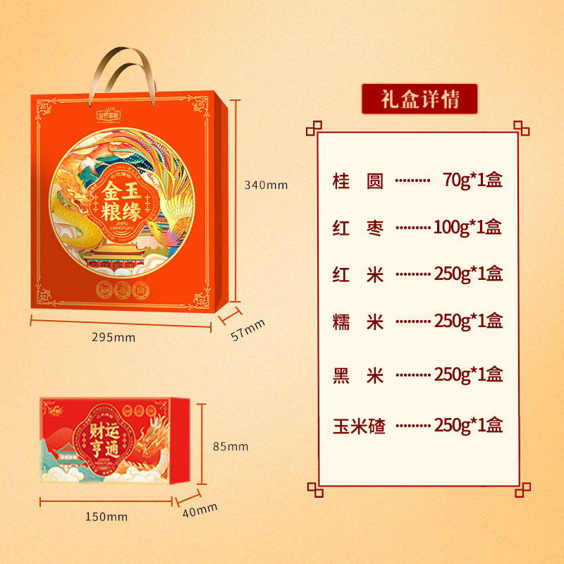 产品规格配置:糯米250g、红米250g、玉米碴250g黑米250g、红枣100g、桂圆70g 手尺寸:34*29.5*5 盒尺寸:32*4.7*28.5cm 箱重量:20.1kg 箱尺寸:50*39*39 箱体积:0.076方