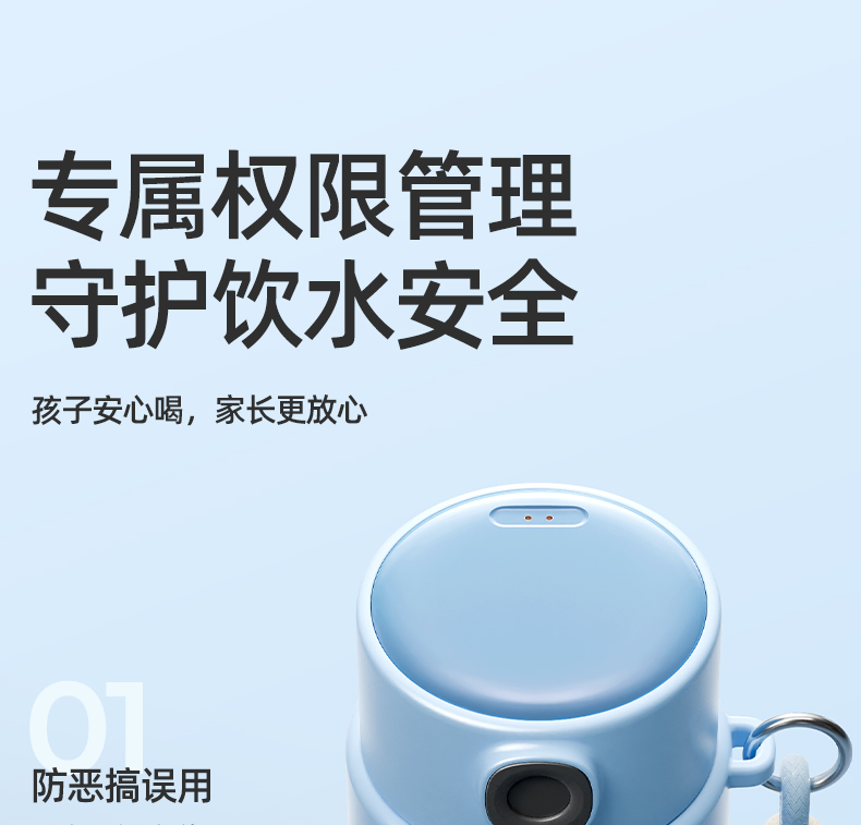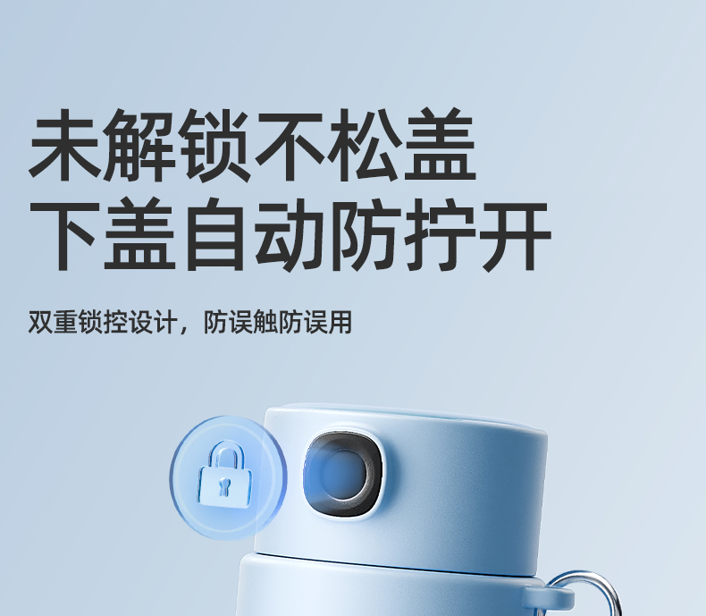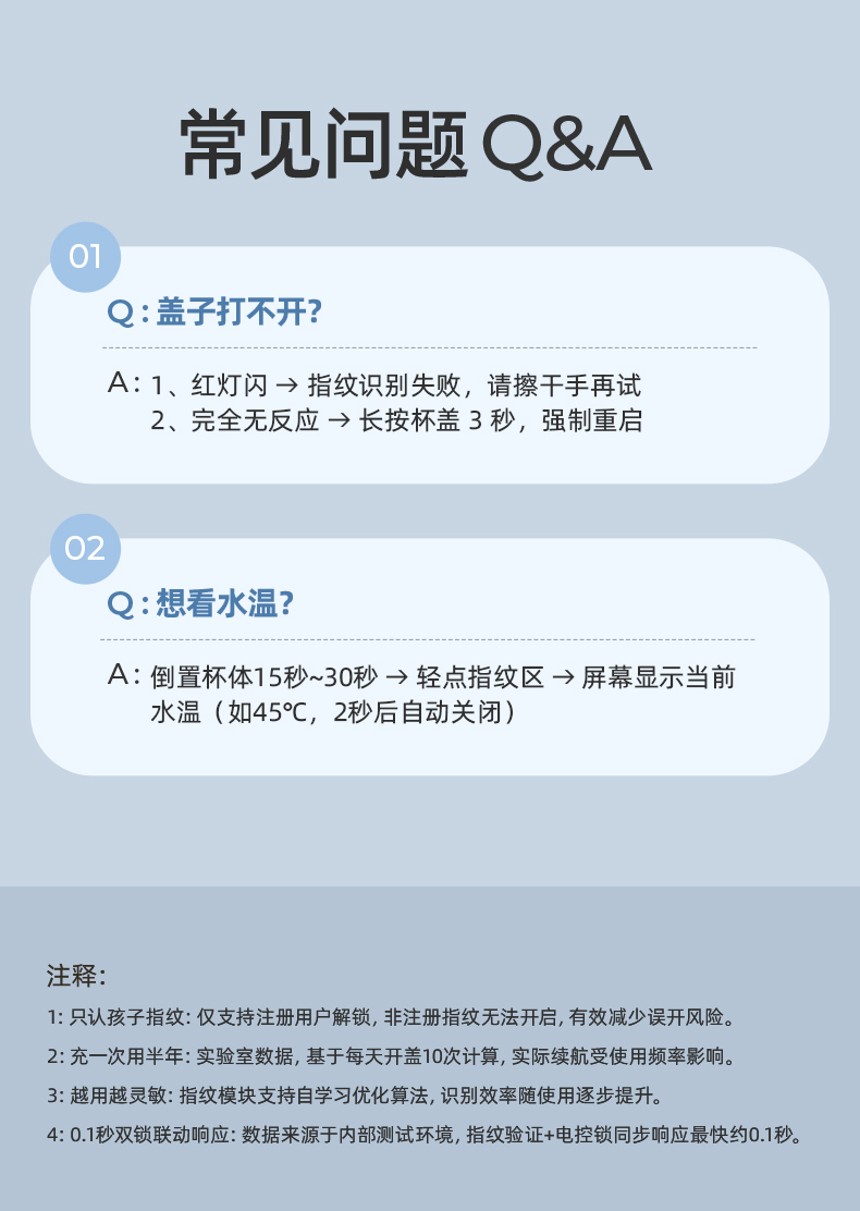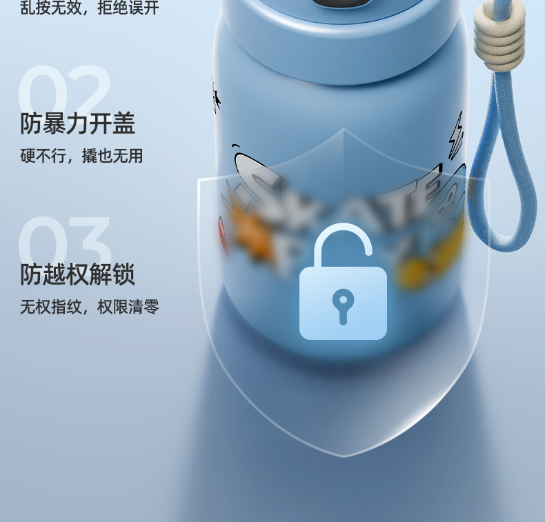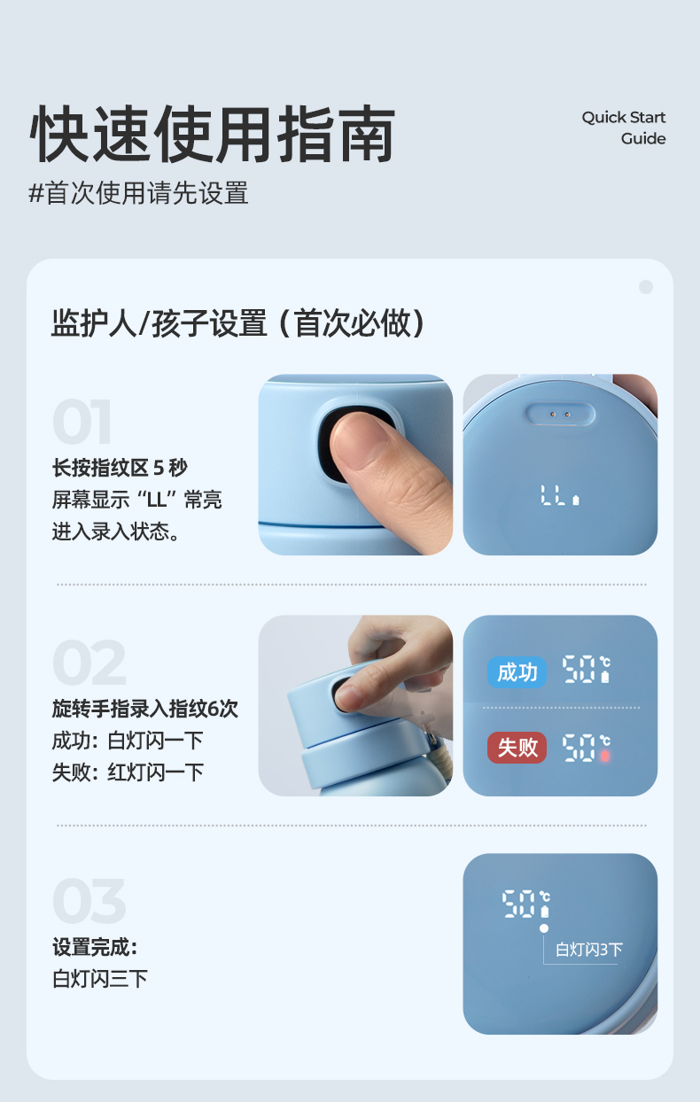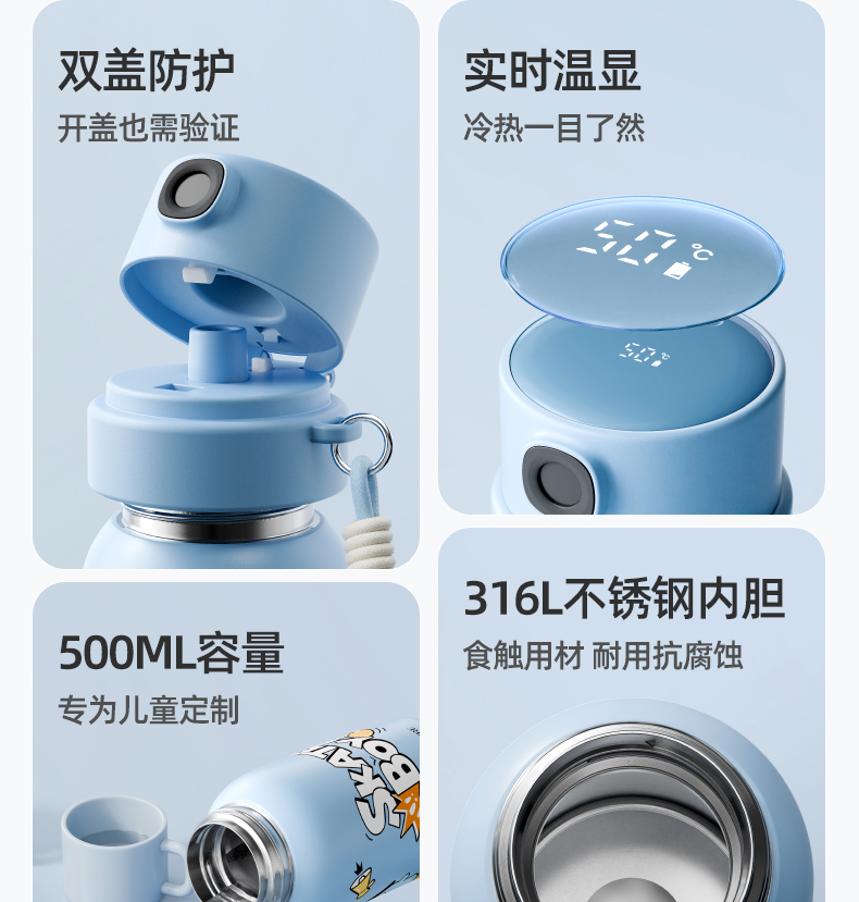 主要材质:316不锈钢内胆 电压:5V 容量:500ml 颜色:蒙德里灰、莱茵特粉、纳贝里蓝 1.指纹开锁,保护儿童饮水安全 2.316L不锈钢内胆,材质安全放心 3.盖子数显显示,能看内部水温 4.上盖不开锁,盖子拧不开 5.磁吸充电 6.双层不锈钢+抽真空,15h长效保温