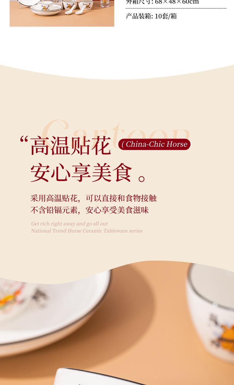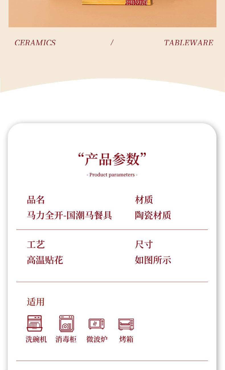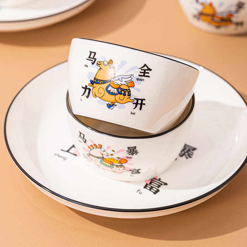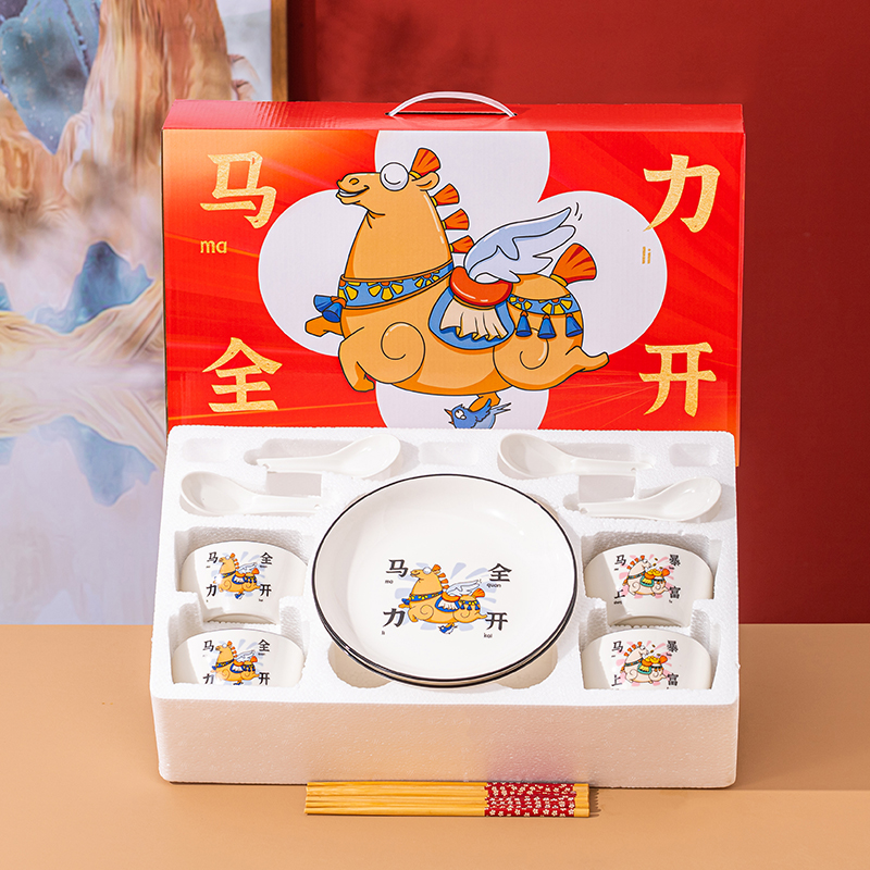产品组成:整套=4碗4勺4筷4盘 产品材质:强化瓷 产品规格:陶瓷碗=口径10.5cm,高度6cm;盘子直径20.5cm, 高3.5cm;二针勺=长12.5cm;筷子22.5cm 彩盒尺寸:48×12×29cm 外箱毛重:30kg 外箱尺寸:68×48×60cm -------- “活力十足+财运满满”双buff叠满的礼品套装! 「翼马踏燕」纹样灵动鲜活,仿佛骏马振翅带风,踏出满室生机;不是老气的纹样,反而有点卡通新国风那味儿,摆桌上直接拉满视觉张力;让人新的一年活力十足,马力全开。 「元宝驮马」图案精致讨喜,圆润金元宝衬着矫健骏马,一眼见财气。马上驮的金元宝更绝,画得圆滚滚还带点小俏皮,像刚从“财富星球”运回来的,看着就超有范!