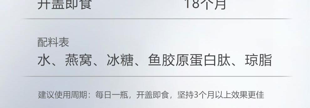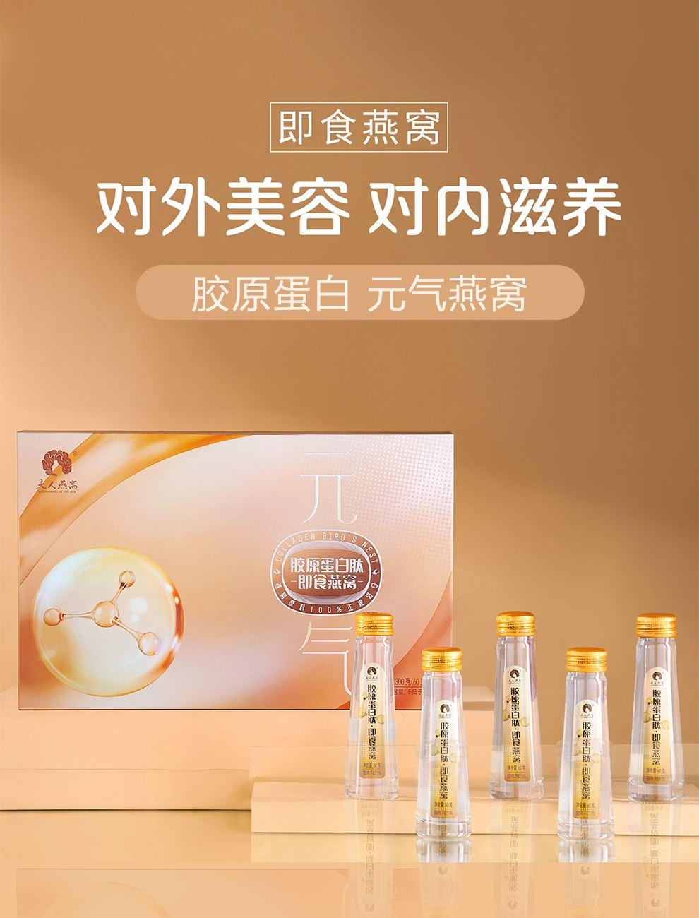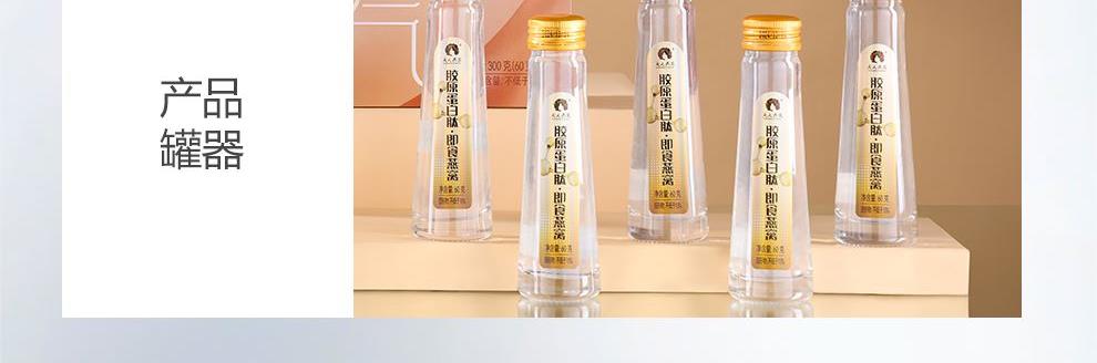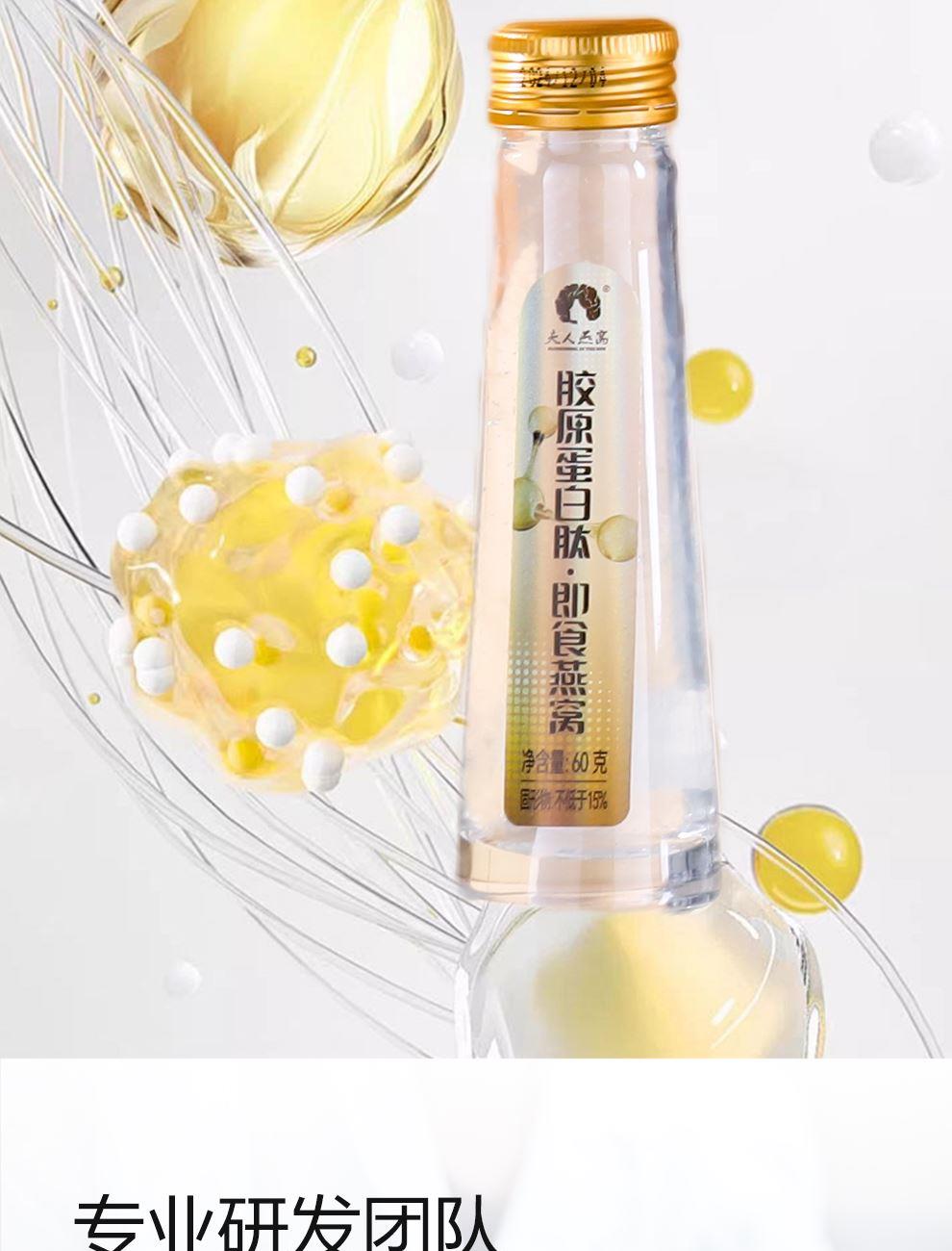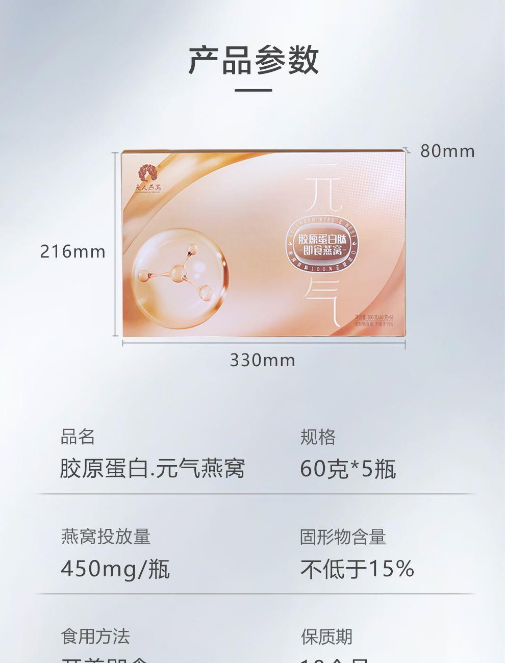 规格:300克(60克*5瓶)、燕窝固形物不低于15% 卖点: 夫人燕窝精选马来西亚、 印尼森林雨季燕盏121℃,1140秒数控科学炖煮 保留燕窝营养 爽滑口感 坚持 0添加 0色素 0防腐剂 孕妈和宝宝也可以放心享用