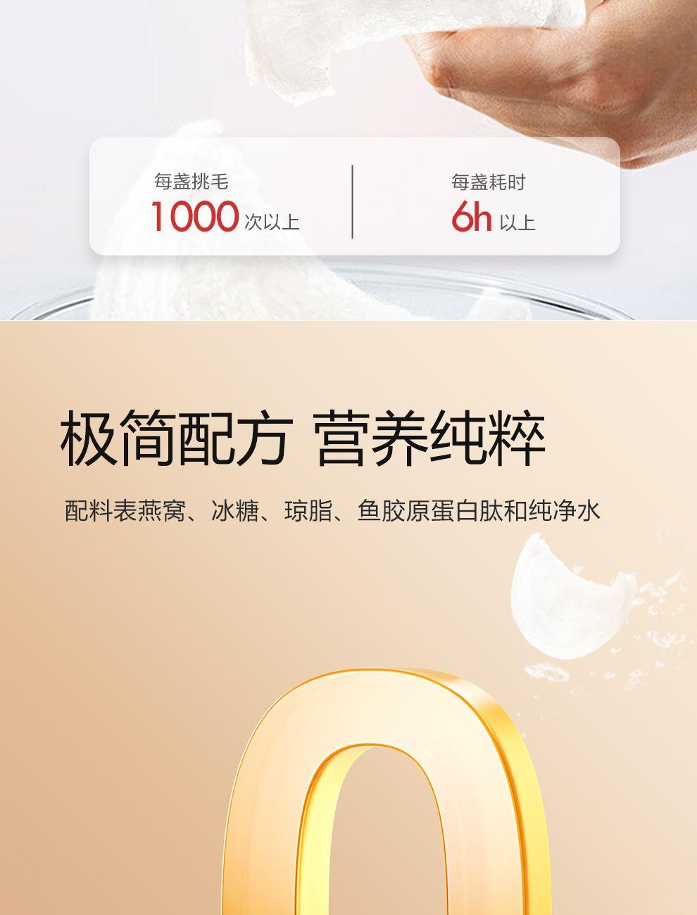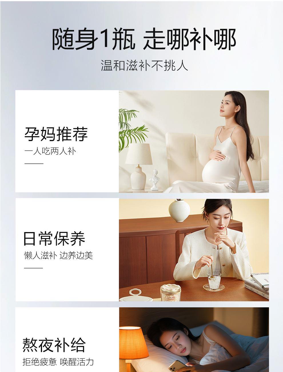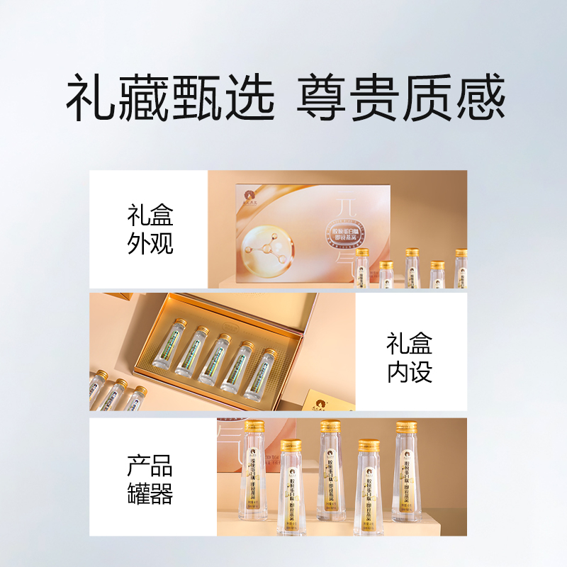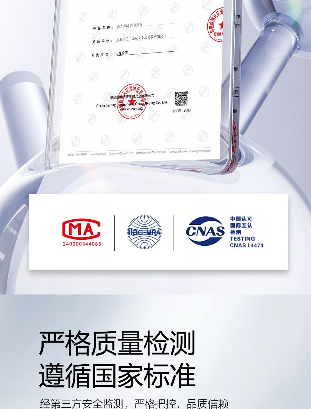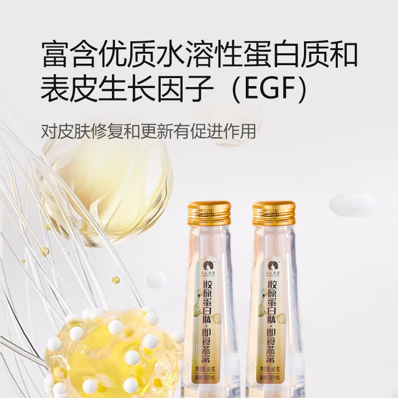 规格:300克(60克*5瓶)、燕窝固形物不低于15% 卖点: 夫人燕窝精选马来西亚、 印尼森林雨季燕盏121℃,1140秒数控科学炖煮 保留燕窝营养 爽滑口感 坚持 0添加 0色素 0防腐剂 孕妈和宝宝也可以放心享用