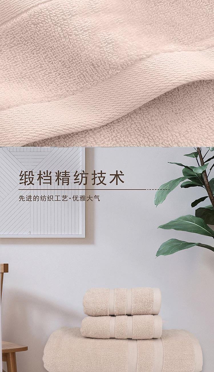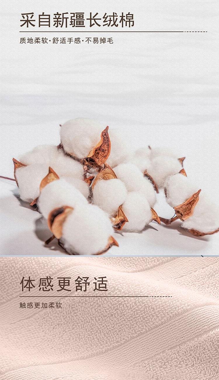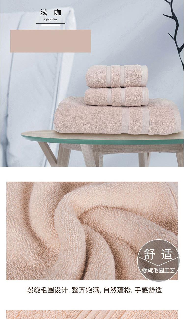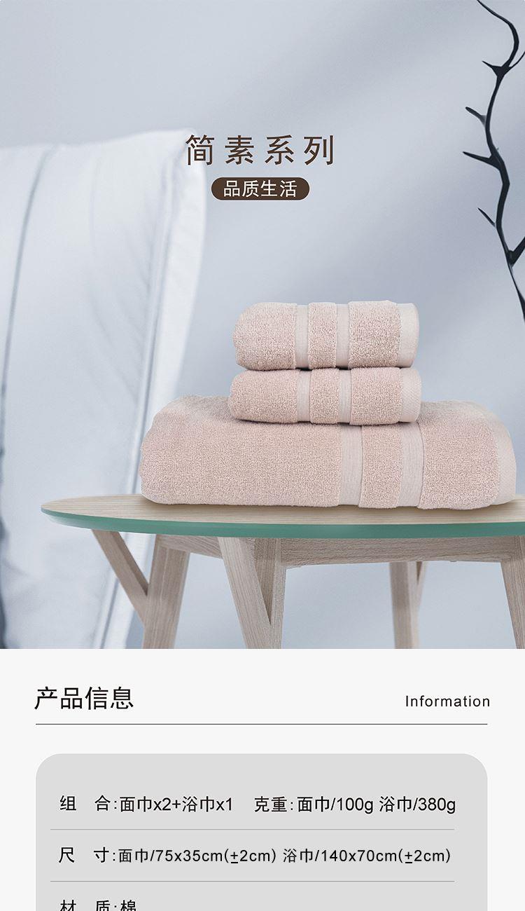 【面巾】×2+【浴巾】×1 面巾克重:100g 面巾规格:75*35 cm (±2cm) 浴巾克重:380g 浴巾规格:140*70cm (±2cm) 【材 质】棉 1.选用新疆长绒棉,质地柔软,手感舒适,不易掉毛 2.螺旋毛圈设计,整齐饱满,自然蓬松 3.缎档精纺工艺,采用先进的纺织工艺,优雅大气 4.加宽加厚锁边设计,更加整洁美观,结石耐用