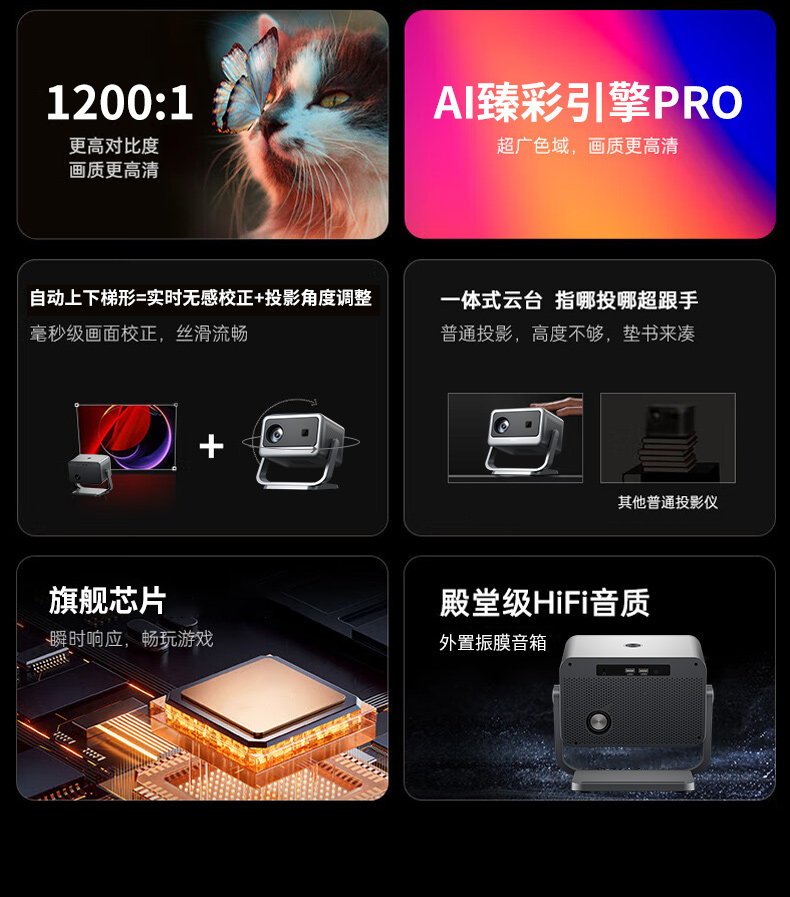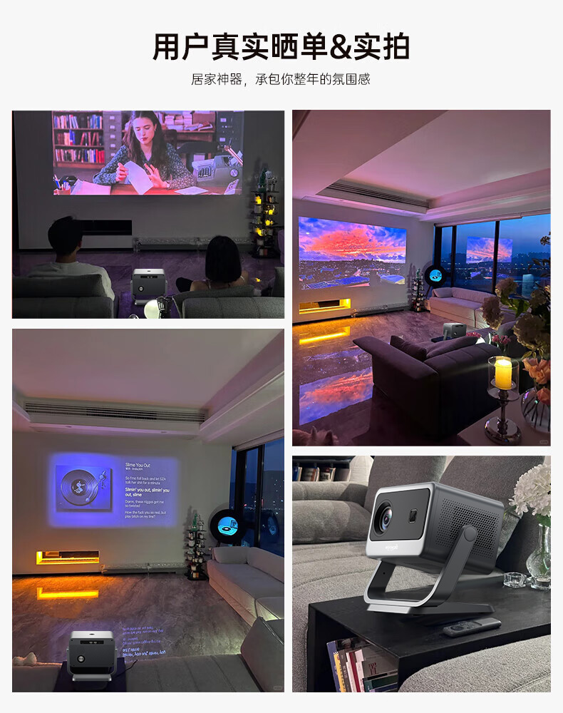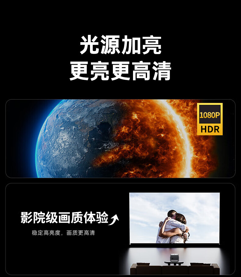 颜 色:灰色 系统版本:9.0安卓语音版 蓝 牙:5.3 投影技术:3.5“LCD显示 投影比:16:9 支持高分辨率:1920*1080P 对焦:电动对焦 梯形矫正:自动上下校正 亮度: 300ANSI Lumens 投影尺寸:30-150英寸 对比度:2000:1 输入电压:110V-240V(±10%) 毛重:1850g 产品尺寸:211*152*216mm Ai智能语音控制系统,老人孩子都可操作 支持侧投四点梯形矫正,电动对焦,随心摆放更灵活 支持苹果安卓手机同屏/投屏,内置安卓系统海量影片可在线观看便携设计,携带无负担,支持1080高清播放,内置独立音箱,可多种设备链接,手机/平板/U盘/移动硬盘/网络盒子等,漫反射原理,呵护眼睛健康
