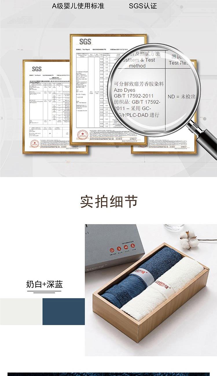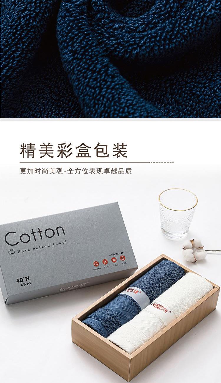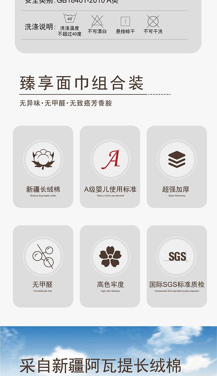 【面巾】×2 面巾克重:110g 面巾规格:75*35 cm (±2cm) 【材 质】新疆长绒棉 1.选用新疆长绒棉,质地柔软,手感舒适,不易掉毛 2.螺旋毛圈设计,整齐饱满,自然蓬松 3.缎档精纺工艺,采用先进的纺织工艺,优雅大气 4.加宽加厚锁边设计,更加整洁美观,结石耐用