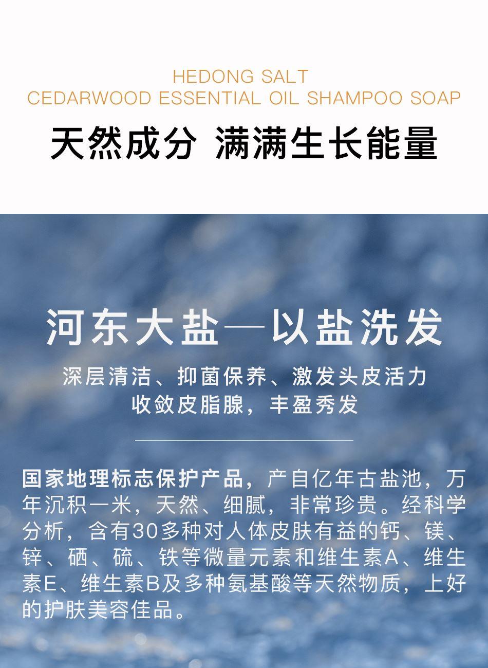 雪松精油葡萄籽油乳木果油河东大盐皂 修护受损毛囊,激发活力,丰盈蓬松 头发健康配方,改善厚重大油头促进头皮健康,清爽无残留。 一皂可多用