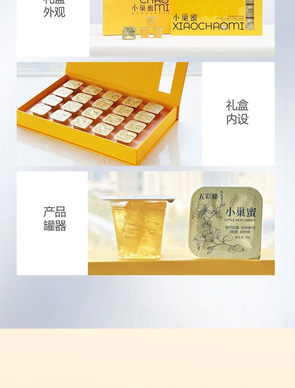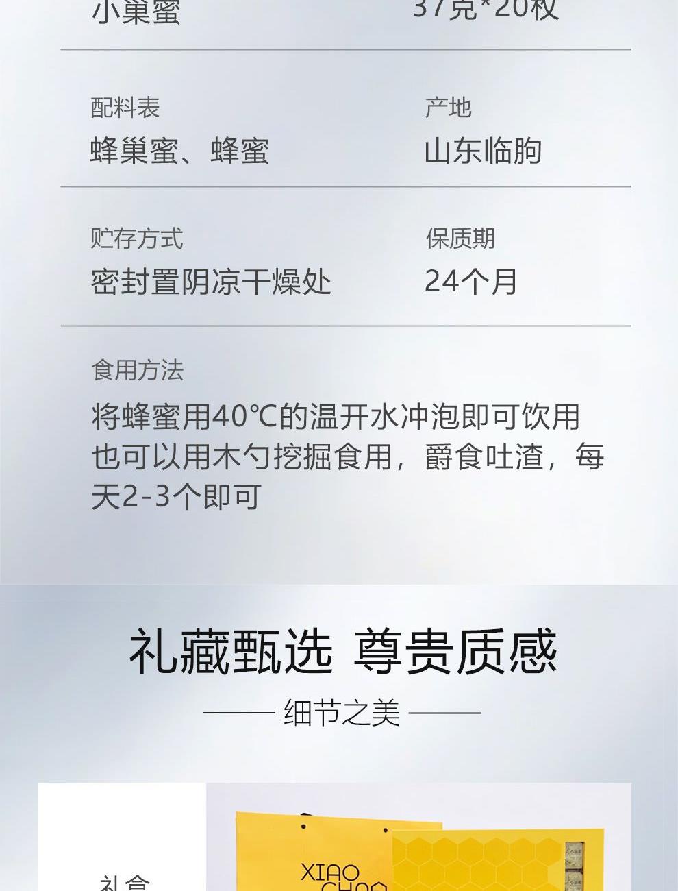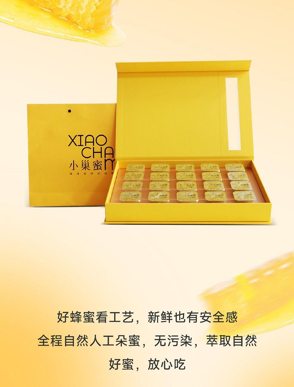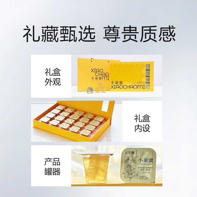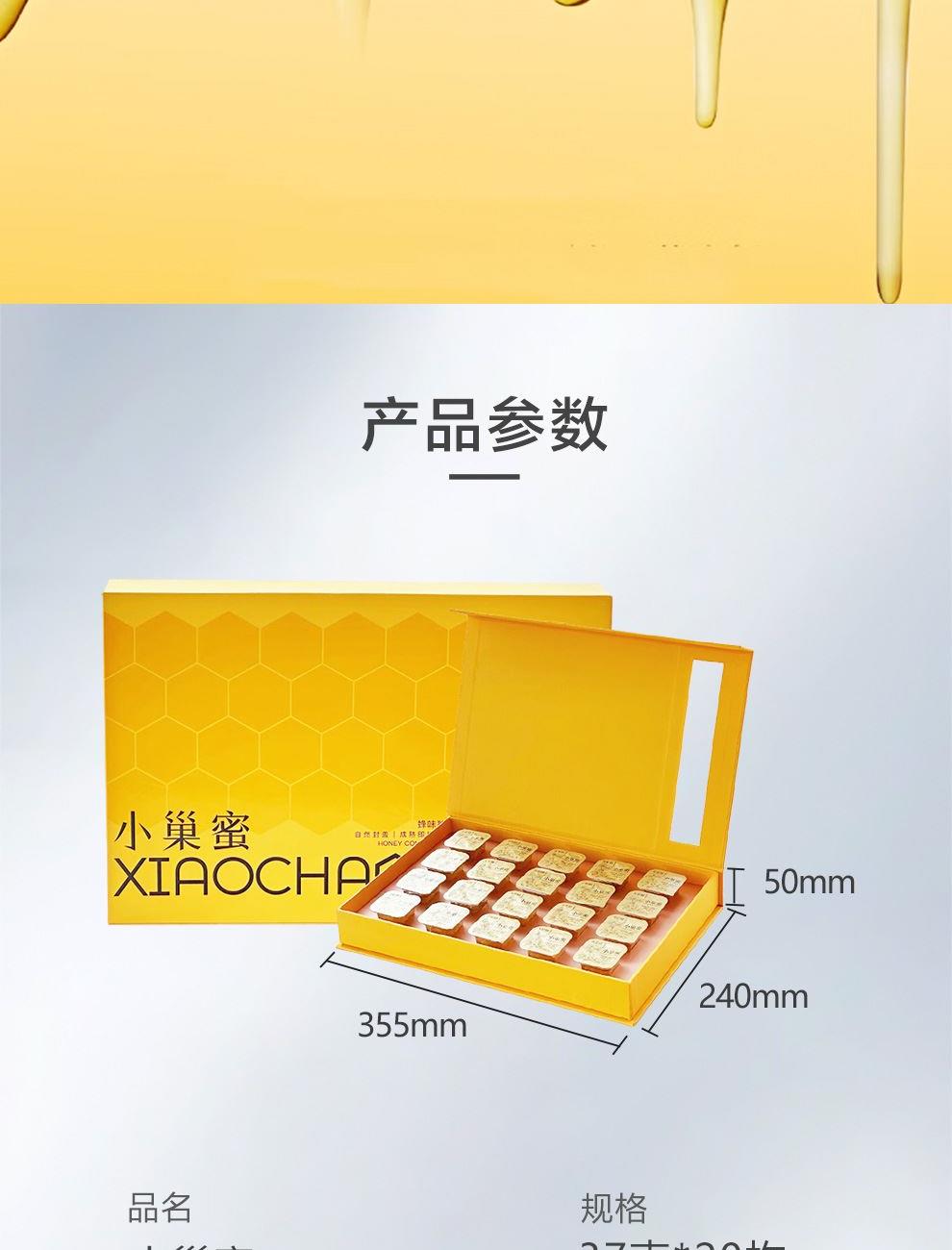 规格:720克(30克*24颗) 卖点: 小巢蜜核心的卖点之一是其近乎零加工的生产工艺。与普通分离蜜相比,巢蜜是蜜蜂自然酿制成熟并封上蜡盖的蜜脾,未经人为的分离和加工,保留了蜂蜜的原始状态。这种工艺极大程度避免了加工过程中营养成分的流失,特别是对温度敏感的生物酶类物质。