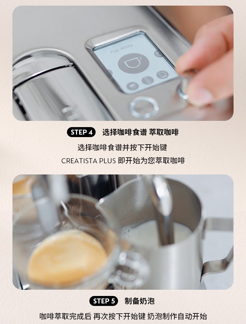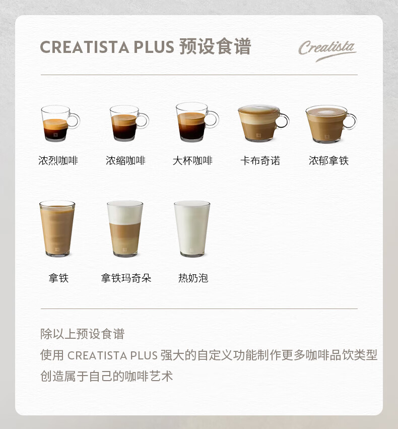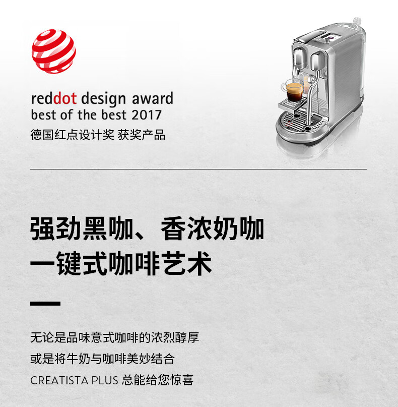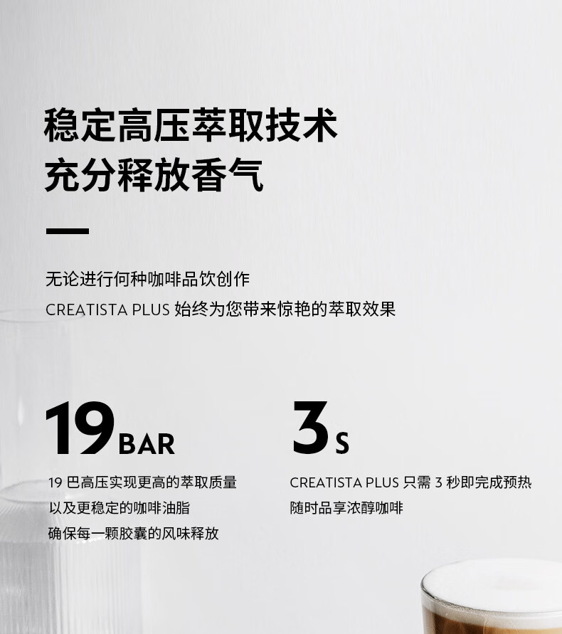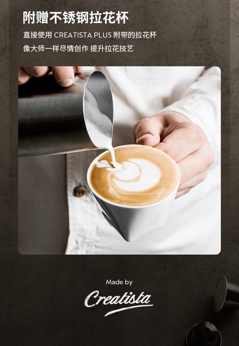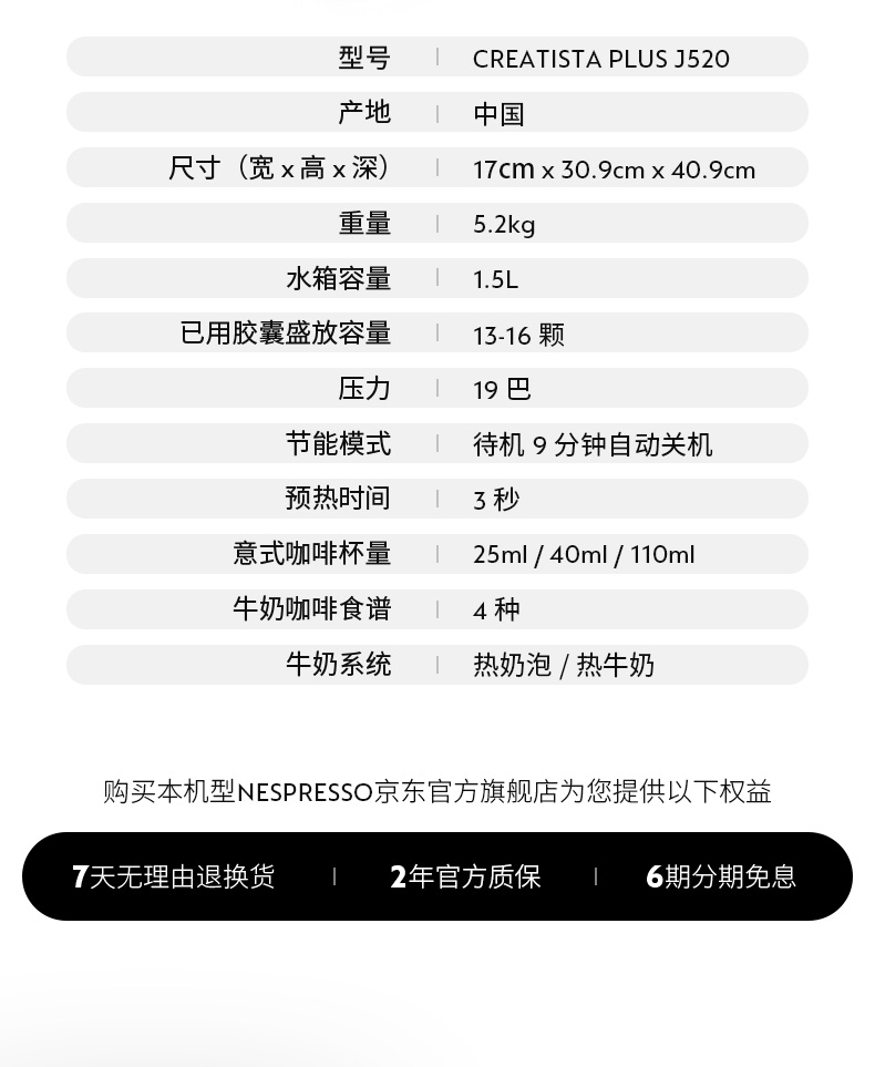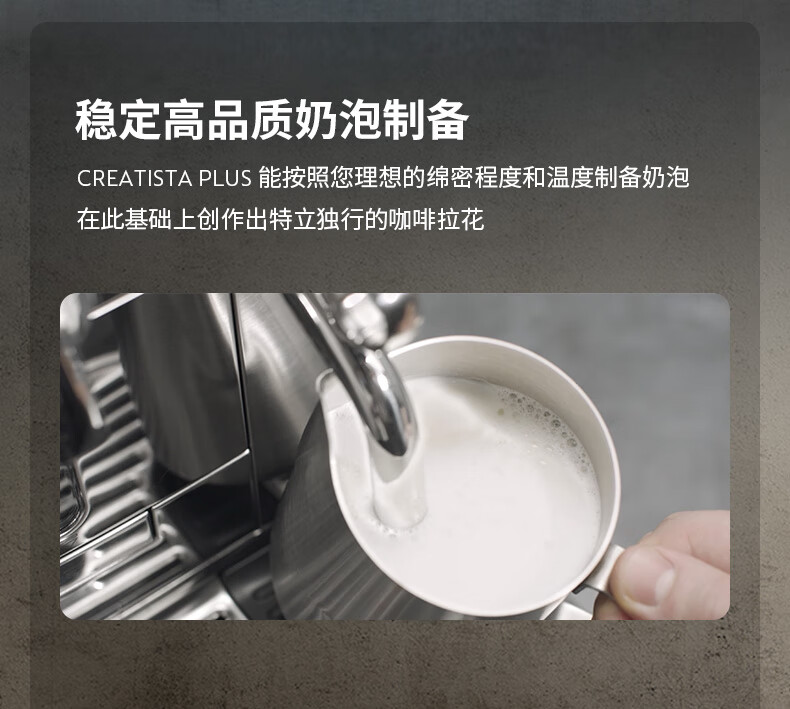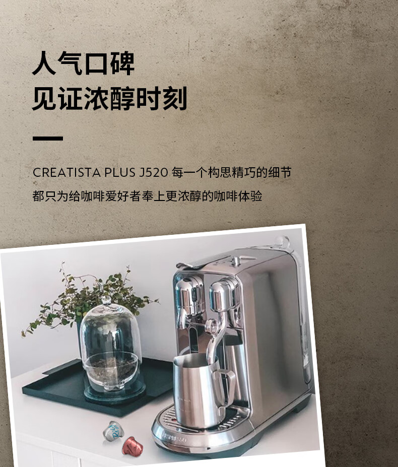 型号:J520 电源线长:1.2m 额定电压:220V 额定功率:2300W 产品尺寸:长170mm 宽409mm 高309mm 水箱容量:1.3-1.89L 泵浦压力:19Bar 制作口味:卡布奇诺 拿铁 意式浓缩 释放你的咖啡创作之魂大师般的拉花体验将质地细腻的牛奶化为线条与咖啡美妙融合CREATISTA PLUS 将这一切变得简单;稳定高压萃取技术充分释放香气;无论进行何种咖啡品饮创作CREATISTAPLUS始终为您带来惊艳的萃取效果