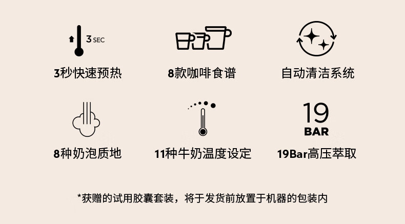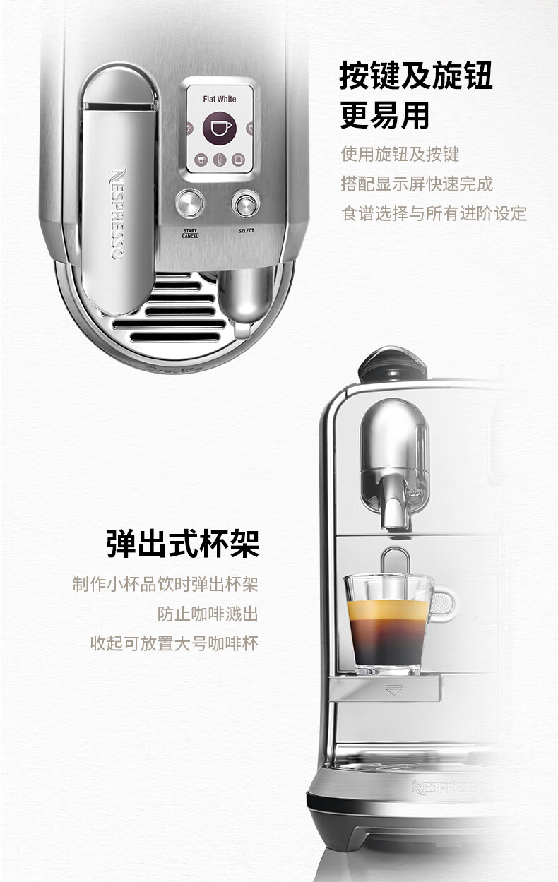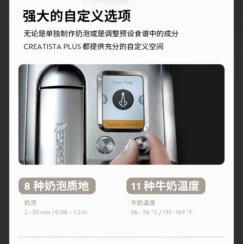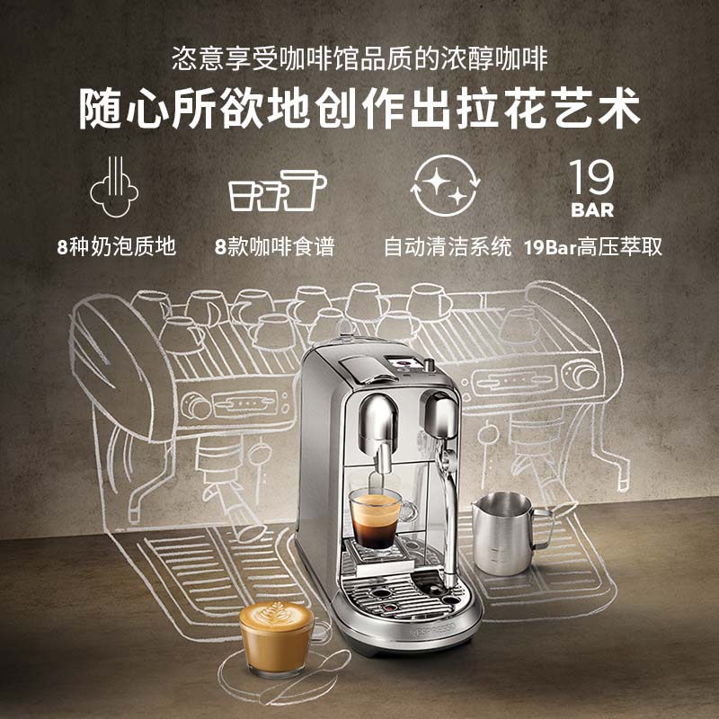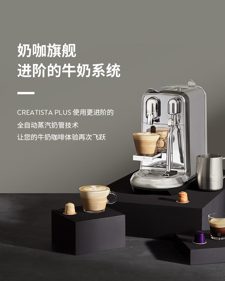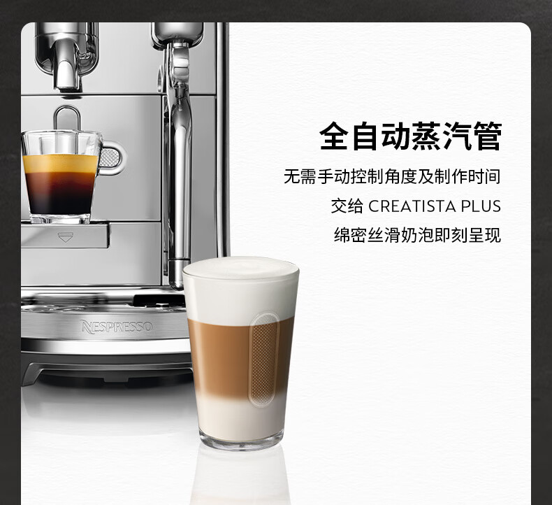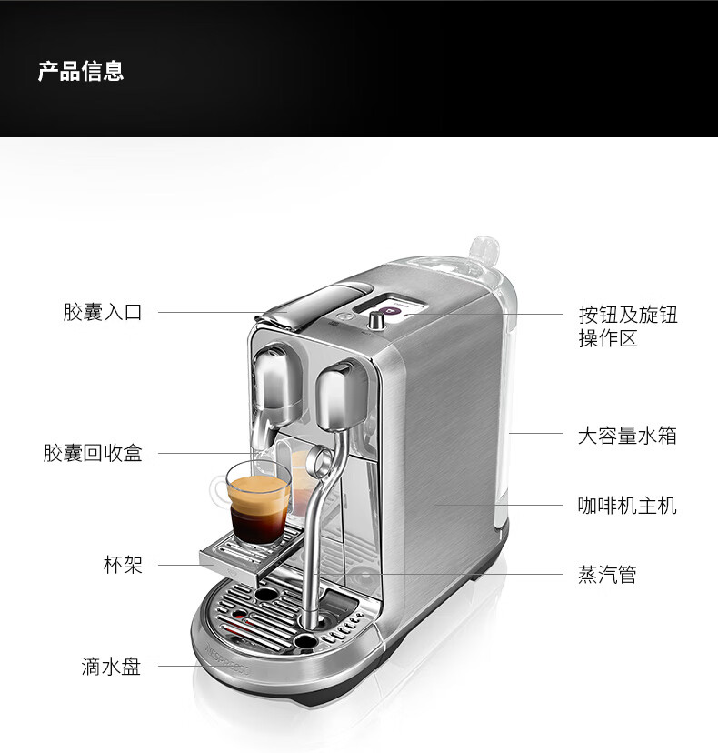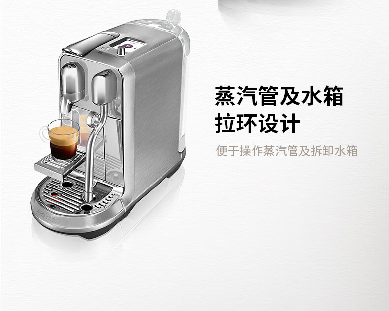 型号:J520 电源线长:1.2m 额定电压:220V 额定功率:2300W 产品尺寸:长170mm 宽409mm 高309mm 水箱容量:1.3-1.89L 泵浦压力:19Bar 制作口味:卡布奇诺 拿铁 意式浓缩 释放你的咖啡创作之魂大师般的拉花体验将质地细腻的牛奶化为线条与咖啡美妙融合CREATISTA PLUS 将这一切变得简单;稳定高压萃取技术充分释放香气;无论进行何种咖啡品饮创作CREATISTAPLUS始终为您带来惊艳的萃取效果