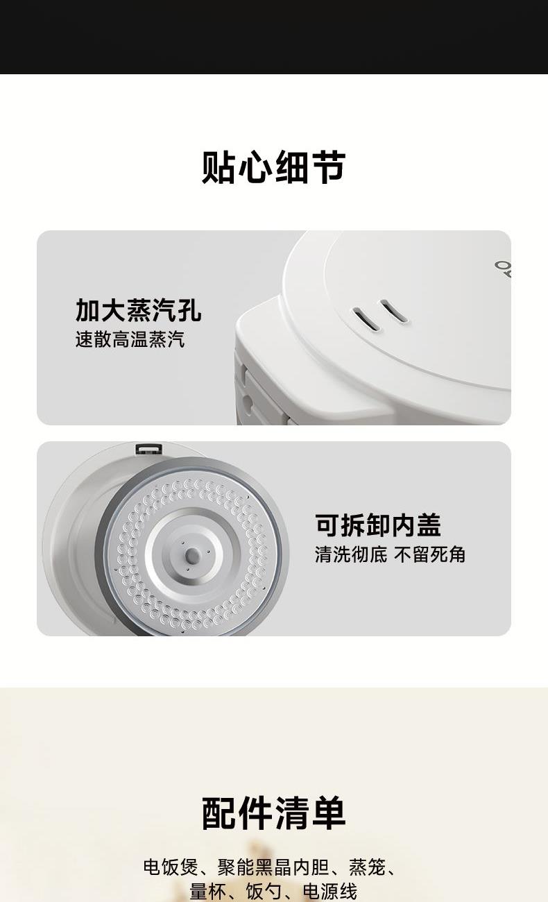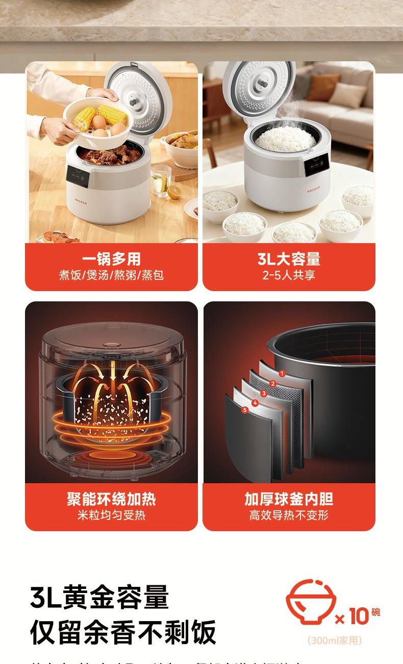 1、3.0L容量设计,满足3-5人之家的饭量; 2、超厚球釜内胆,碗型发热盘,让米粒充分均匀受热,米饭更香甜; 3、微压蒸煮技术,确保米饭软硬适中,让米饭颗颗饱满; 4、可拆卸内盖设计,清洗更方便; 5、触控面板,三键控制直观简易操作; 6、自主研发电控,控温,美味随 时享。 功率:500W 容量:3L 毛重:3.2kg 包装方式:单邮 包装尺寸:295*295*262mm