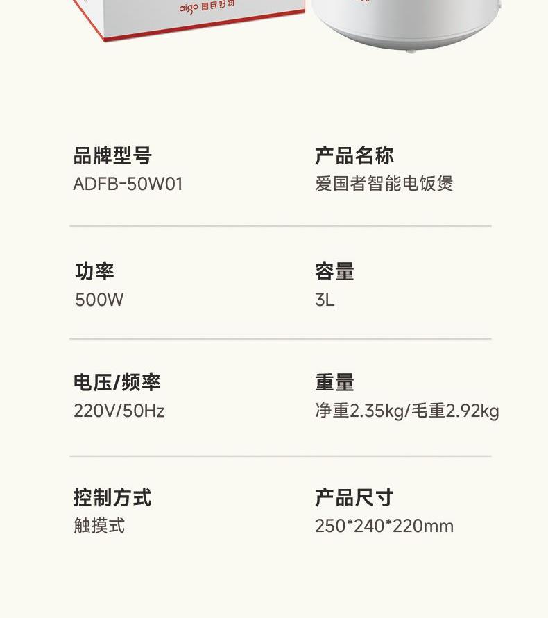 aigo爱国者电饭煲ADFB-50W01
