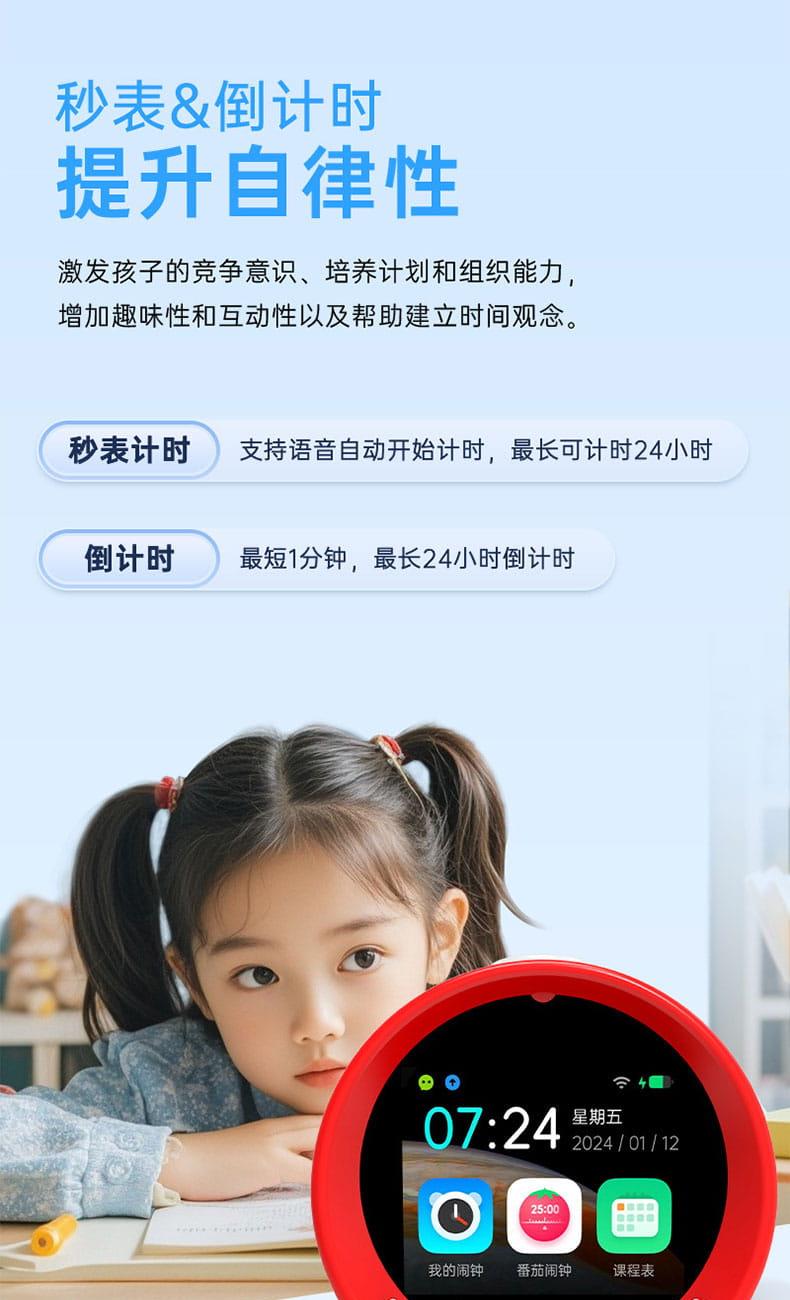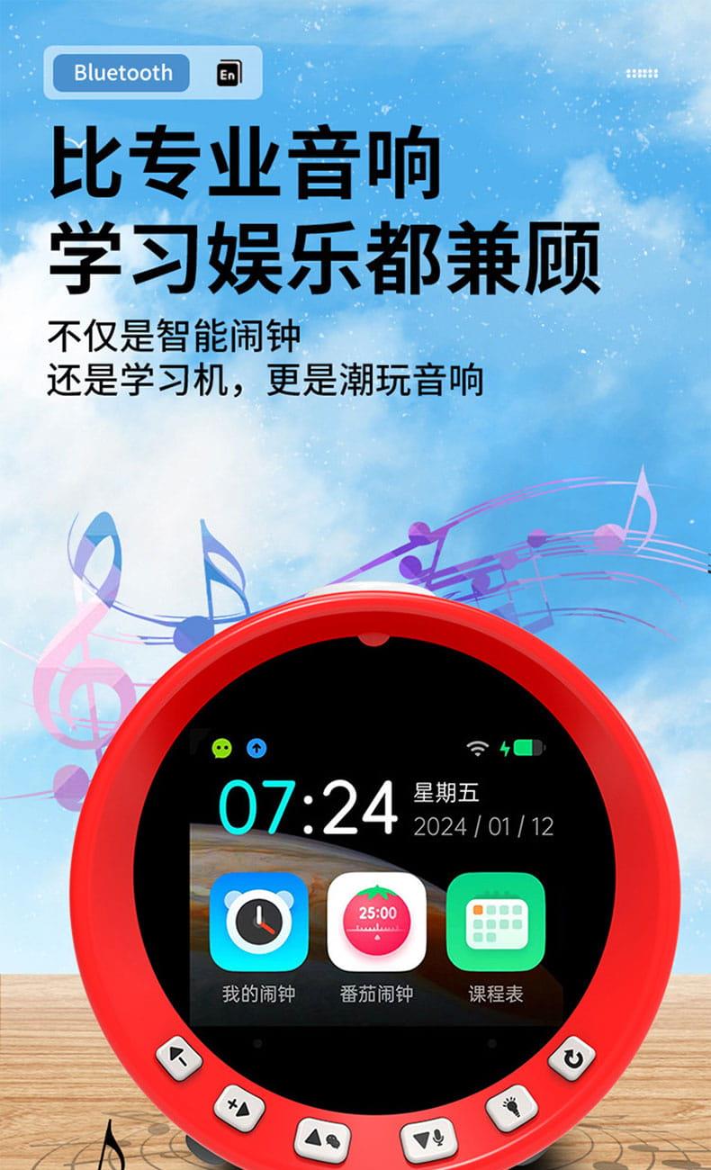 产品尺寸:150*150*100mm 电池容量:2000mAh 操作方式:单点触摸 连接方式:蓝牙、WIFI 产品颜色:红色 整套毛重:350g 整箱数量:60 智能语音交互,语音唤醒,智能问答,语音查词 番茄时间管理法,可设置50组闹钟 内置喜马拉雅少儿 K12全科教材在线同步学习