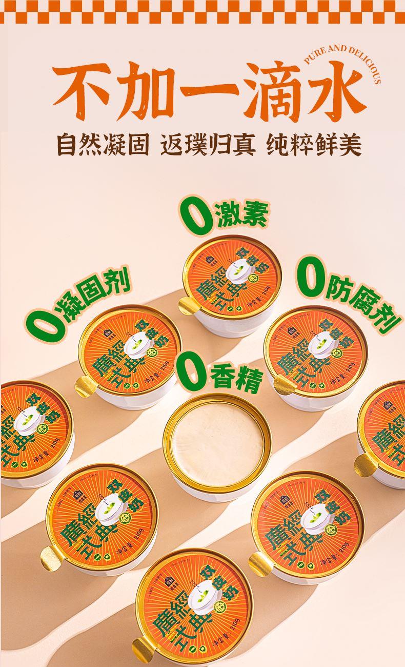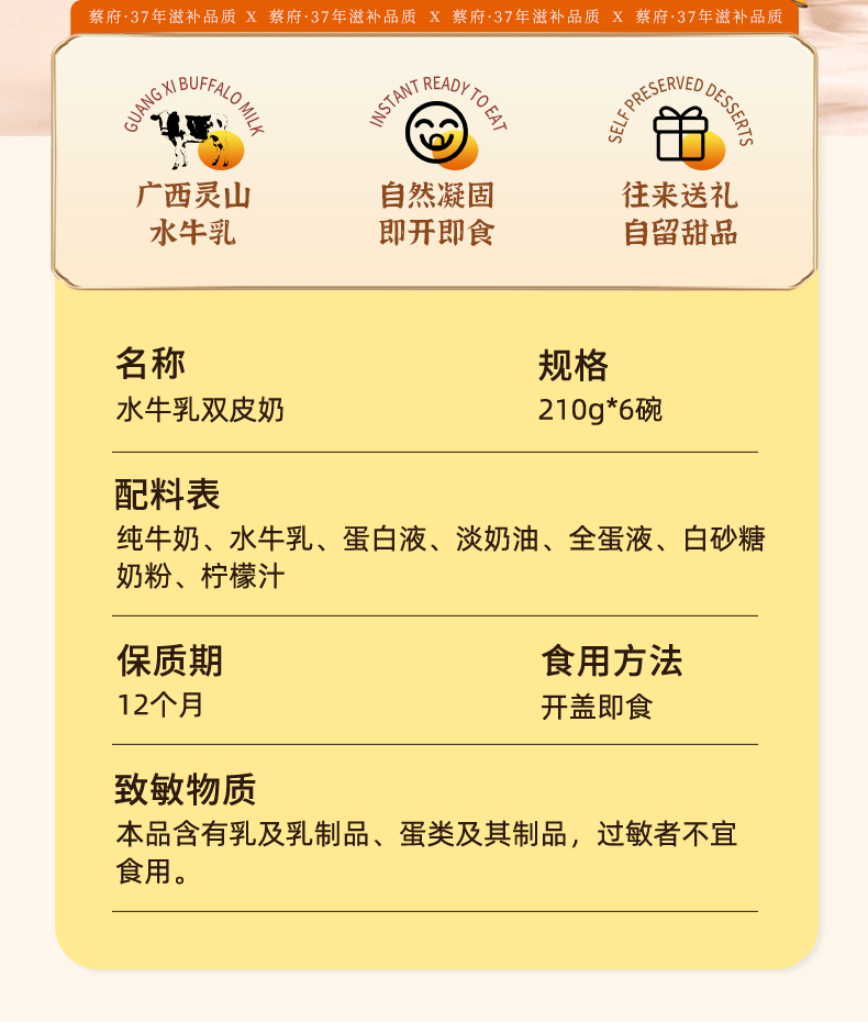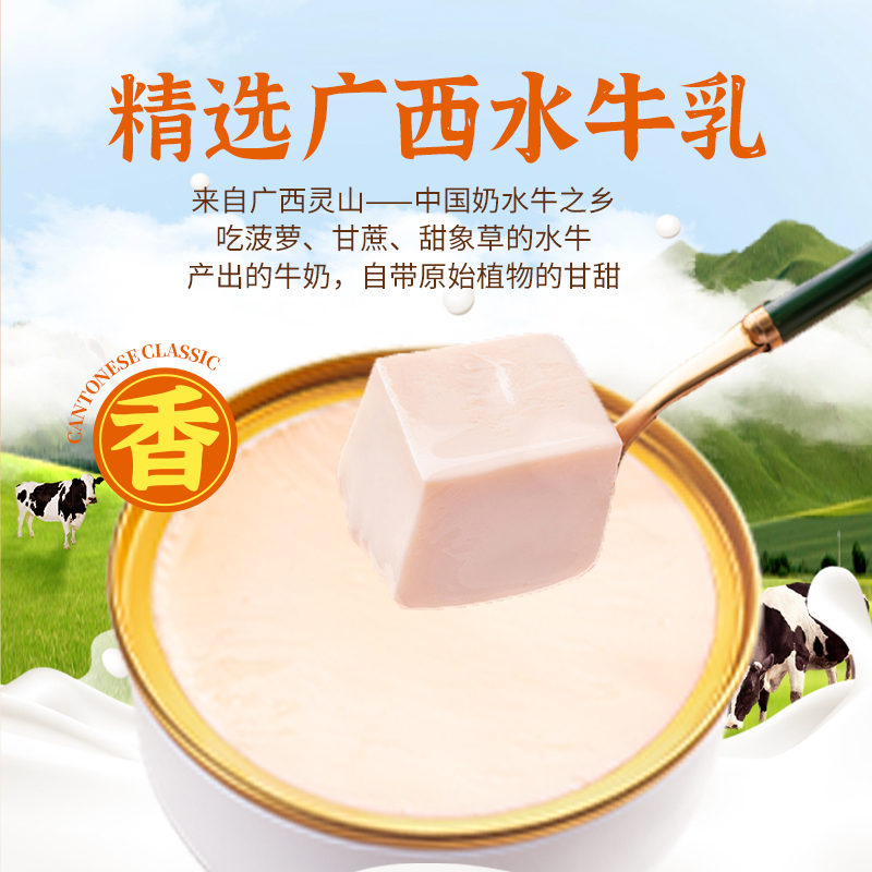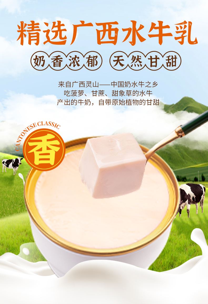 蔡府水牛乳双皮奶 规格:1.26kg(210g*6) 包装尺寸:30.5*18*12cm 蔡府水牛乳双皮奶,凝结老顺德风味与匠心巧思 创新:依托自有配方,历经1年多研制,保留老顺德双皮奶的地道特色,让经典味道在现代工艺中延续。 优质奶源:严选广西水牛乳,牛群以菠萝、甘蔗、甜象草为食,产出的牛奶自带原始植物的清甜,蛋白质含量更高,口感格外顺滑醇厚。 纯粹无添加:制作过程不加一滴水,依靠牛乳本身的特性自然凝固,不添加防腐剂、香精、凝固剂,每一口都是食材本真的纯净风味。 营养轻负担:乳制品添加量≥70%,在保证浓郁口感的同时,兼顾营养与健康,食用无负担。 地道口感:传统工艺赋予的自然奶香,入口鲜香嫩滑,每一口都是老顺德的经典滋味。 便捷享受:独立碗装设计,开盖即食,尤其推荐冷藏后食用,冰爽顺滑的口感更添风味