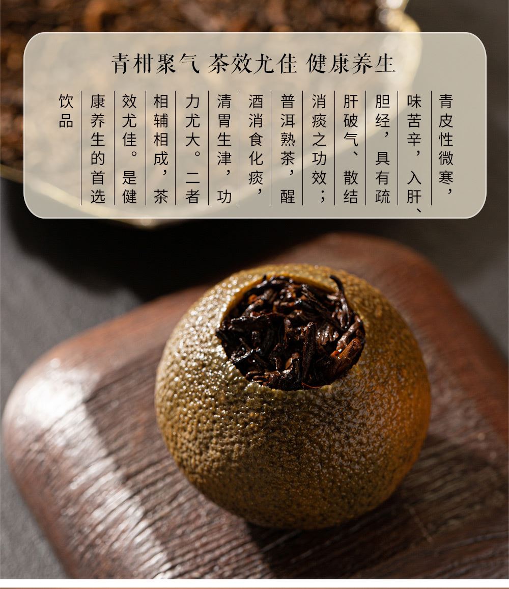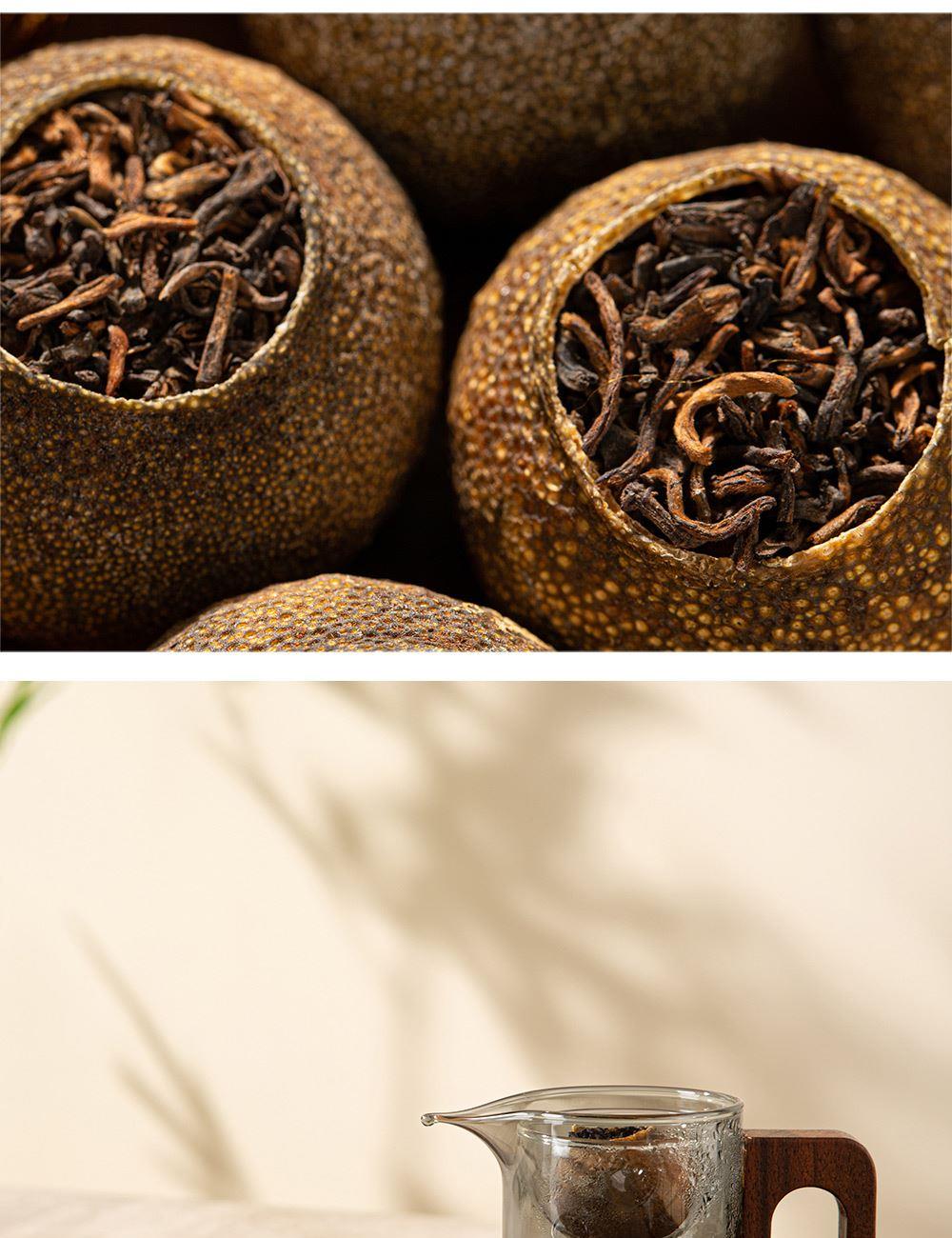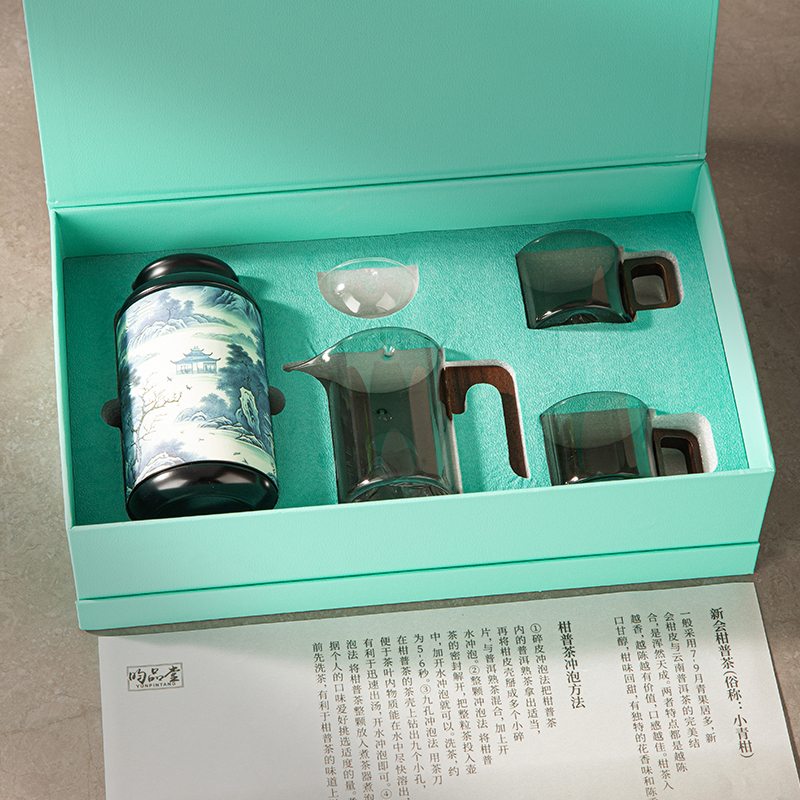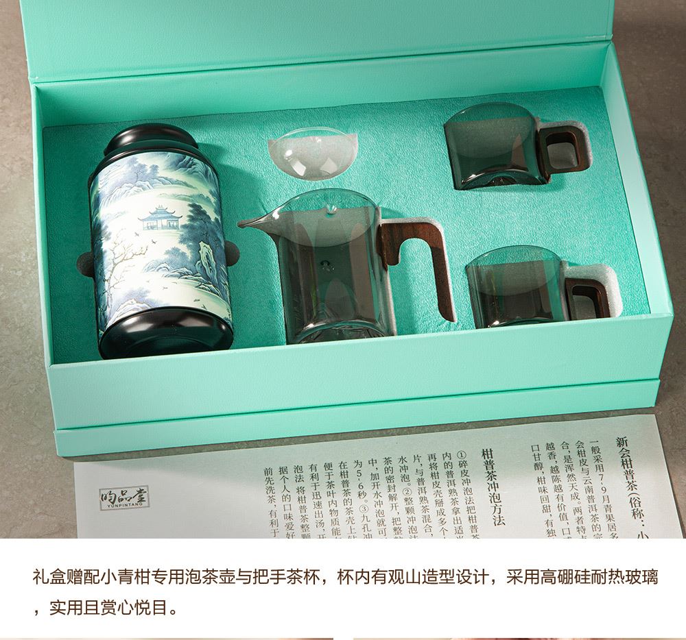 产地:广东新会 配置:天马核心产区柑皮+云南勐海熟普+观山茶具4件套(赠) 净含量:180g 毛重:1.5KG 1.采用广东新会核心产区-天马茶枝柑原料 2.从采收,洗选,开皮,杀青、填茶、贮存与陈化等每一个环节都坚持人手工制作,精心挑选,自然生晒。 3.新会小青柑性温,甘香醇陈,油包清晰,油室饱满,芳香浓郁,具有唤醒味蕾,改善食欲不振,消滞健胃。 4.云南熟普茶底干净醇厚,汤色透亮,清甜回甘,持久耐泡。 5.果皮厚实,油包粒大,冲泡经久不散,柑香味浓郁。 6.礼盒赠配小青柑专用泡茶壶与把手茶杯,杯内有观山造型设计,采用高硼硅耐热玻璃,实用且赏心悦目。