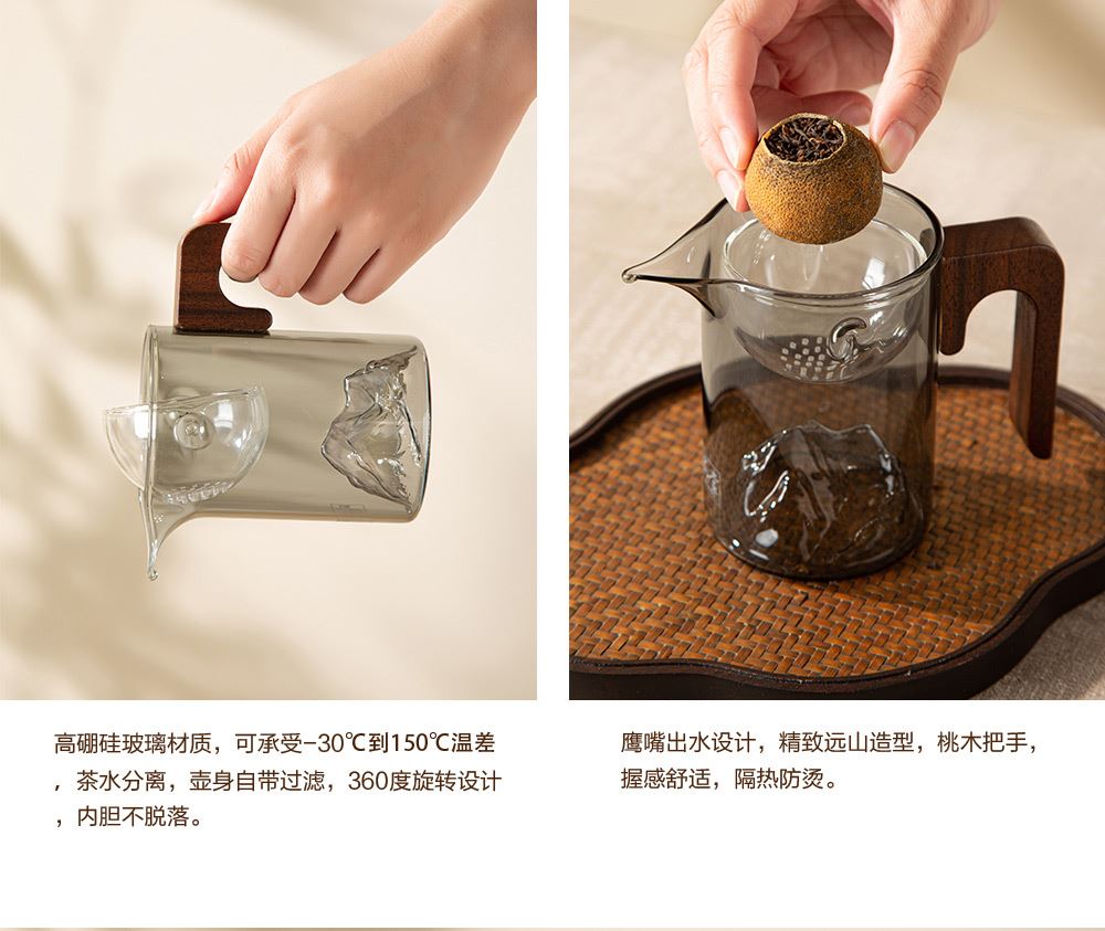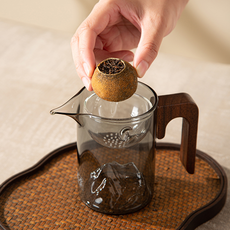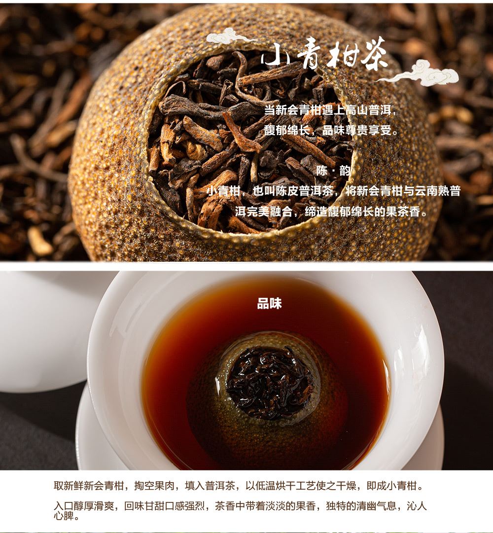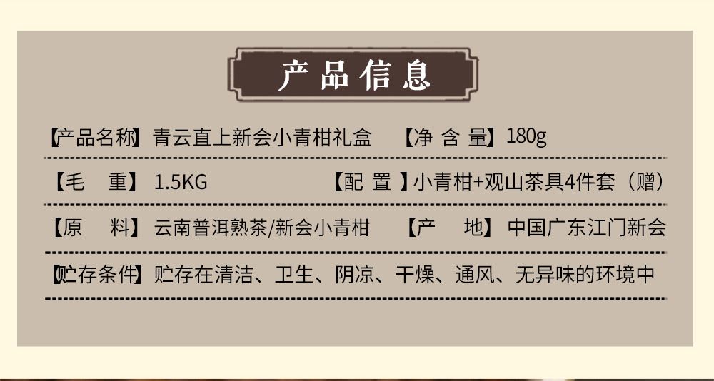 产地:广东新会 配置:天马核心产区柑皮+云南勐海熟普+观山茶具4件套(赠) 净含量:180g 毛重:1.5KG 1.采用广东新会核心产区-天马茶枝柑原料 2.从采收,洗选,开皮,杀青、填茶、贮存与陈化等每一个环节都坚持人手工制作,精心挑选,自然生晒。 3.新会小青柑性温,甘香醇陈,油包清晰,油室饱满,芳香浓郁,具有唤醒味蕾,改善食欲不振,消滞健胃。 4.云南熟普茶底干净醇厚,汤色透亮,清甜回甘,持久耐泡。 5.果皮厚实,油包粒大,冲泡经久不散,柑香味浓郁。 6.礼盒赠配小青柑专用泡茶壶与把手茶杯,杯内有观山造型设计,采用高硼硅耐热玻璃,实用且赏心悦目。