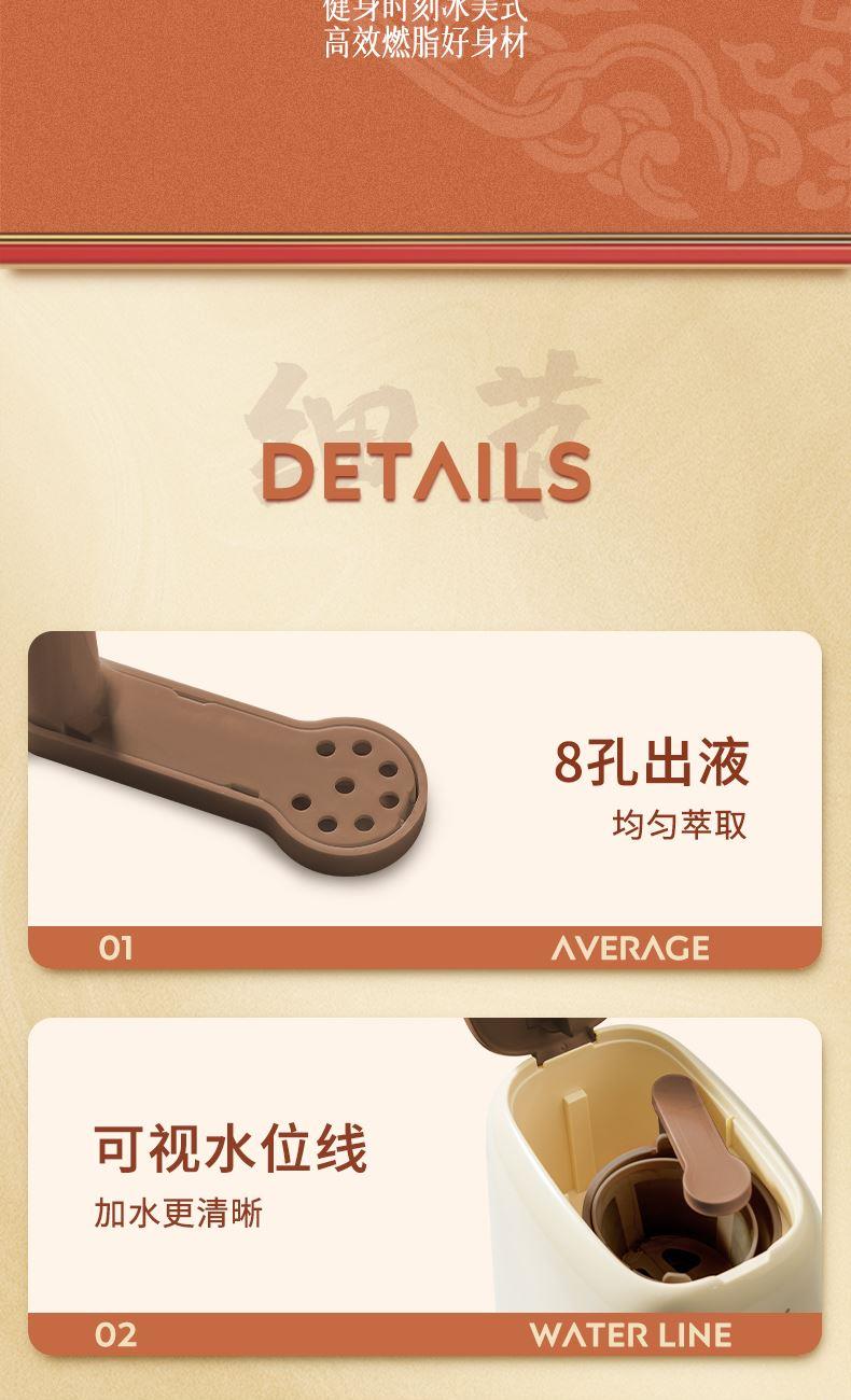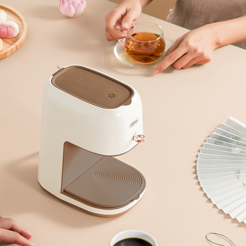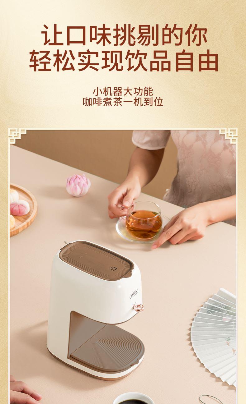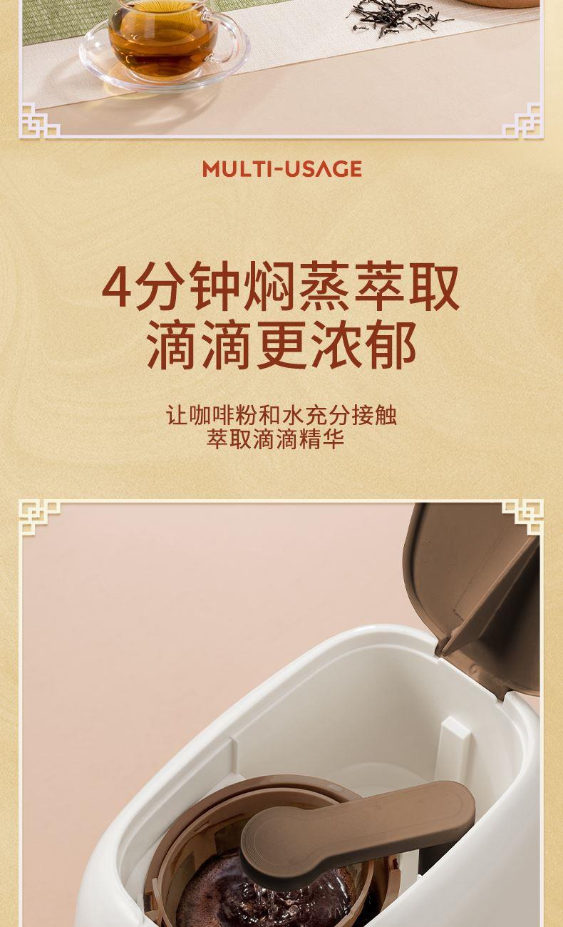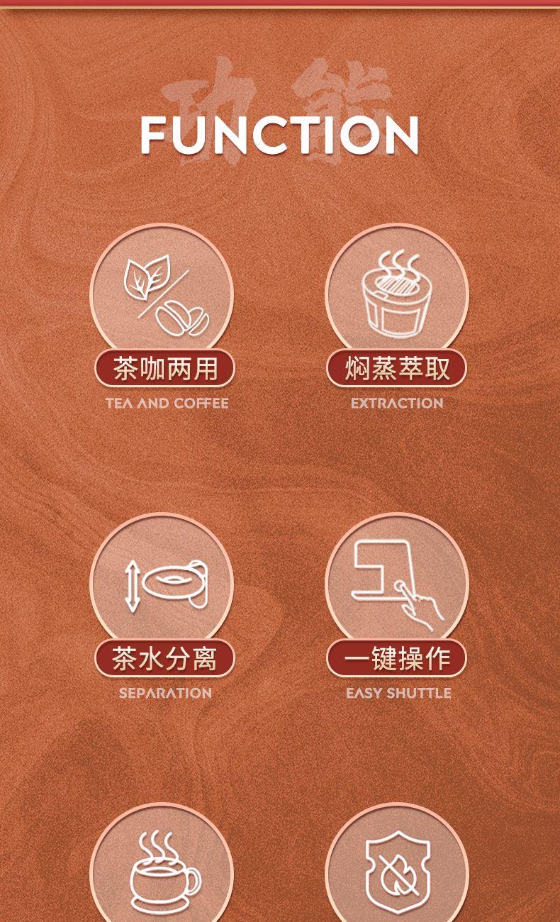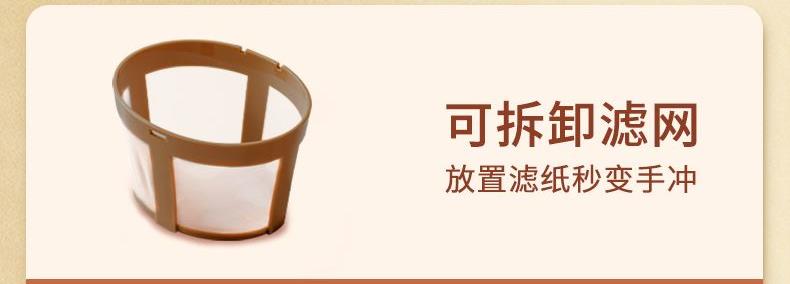 功率: 400W 容量:2.5L水箱 款式:滴漏式 美式咖啡机 符合金杯标准的250ml、15g咖啡粉单杯容量滴漏式美式咖啡机, 创新加入一键茶水分离功能,可存水保温,兼容煮茶泡茶和咖啡功能。 带尼龙滤网,也可使用滤纸,做完一杯后开关自动断开,防干烧; 出水温度100°,入杯温度大概65℃左右,总萃取时间4分钟内; 萃取滤网架可单独拿出放置在咖啡杯上,作为手冲滤架使用。