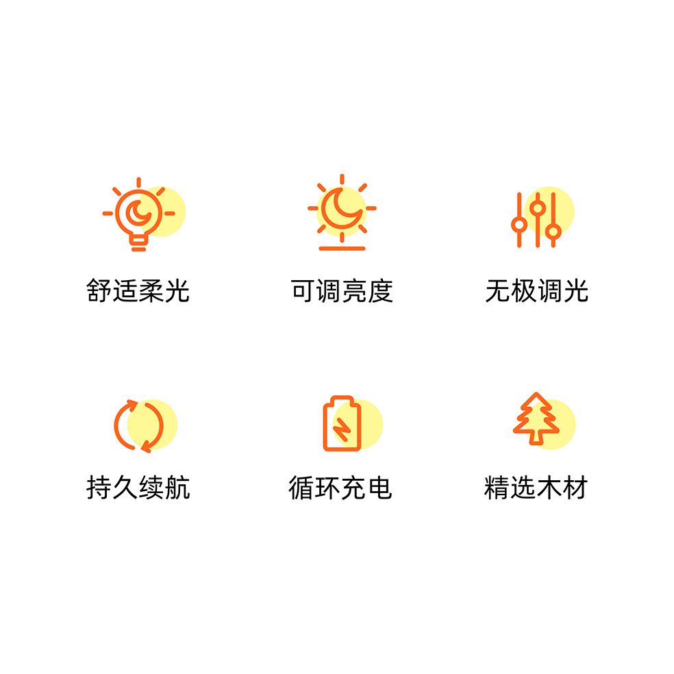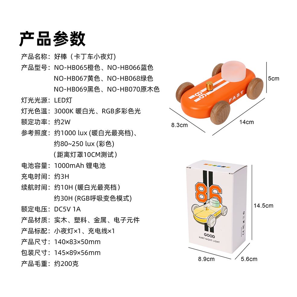 产品型号:NO-HB065橙色、NO-HB066蓝色、 NO-HB067黄色、NO-HB068绿色、 NO-HB069黑色、NO-HB070原木色 灯光色温:3000K 暖白光、RgB多彩色光 电池容量:1000mAh 额定电压:DC5V1A 产品材质:实木、塑料、金属、电子元件 产品标配:小夜灯*1、充电线*1 产品尺寸:140*83*50mm 包装尺寸:145*89*56mm 产品毛重:约200g
