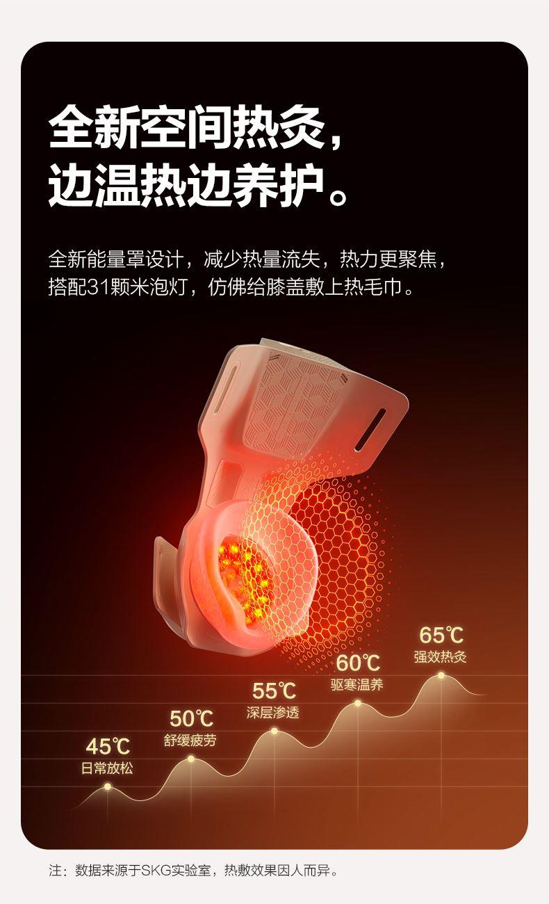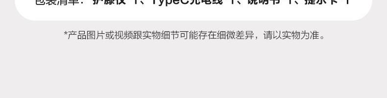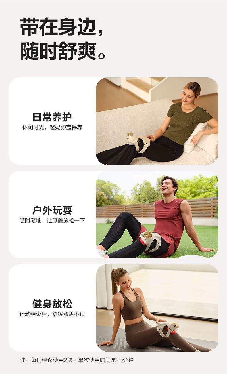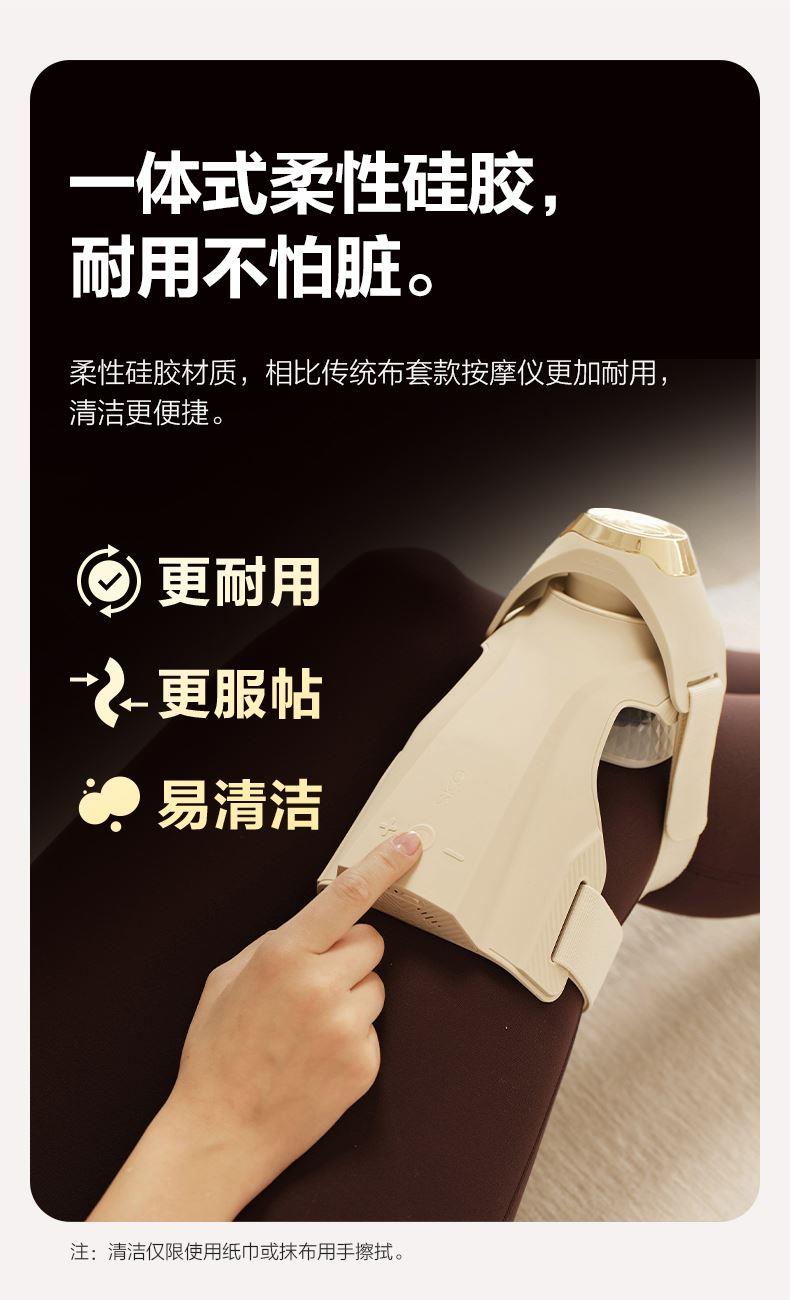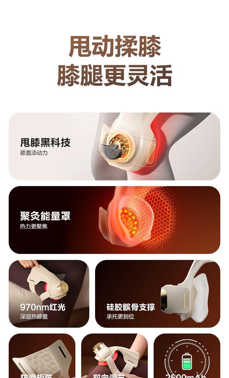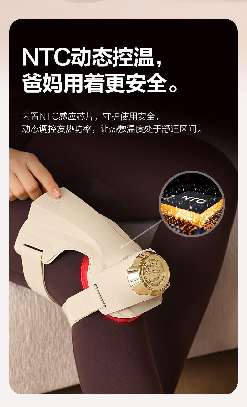 产品描述: 偏心轮马达,离心力放松髌骨 空间热灸技术 透明硅胶髌骨支撑,防护支撑 31颗米泡灯矩阵 NTC感应技术,智能控温 弹性面料,穿插式松紧带 一键操作,语音提示 产品参数: 机身材质:硅胶+发热膜+弹性布 电源电压:5V/5W 充电接口:Type-C 控制方式:机身按键 语音播报:有 电池容量:2500mAh锂电池 续航时间:80min 按摩时间:15分钟 按摩力度:5档 热敷档位:5档 温度挡位:45/50/55/60/65°C 单台毛重/净重:1.38/0.65kg 中箱尺寸:271*214*108mm