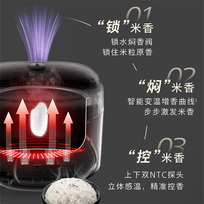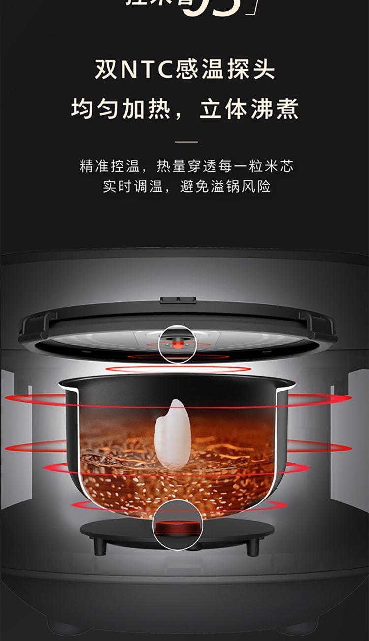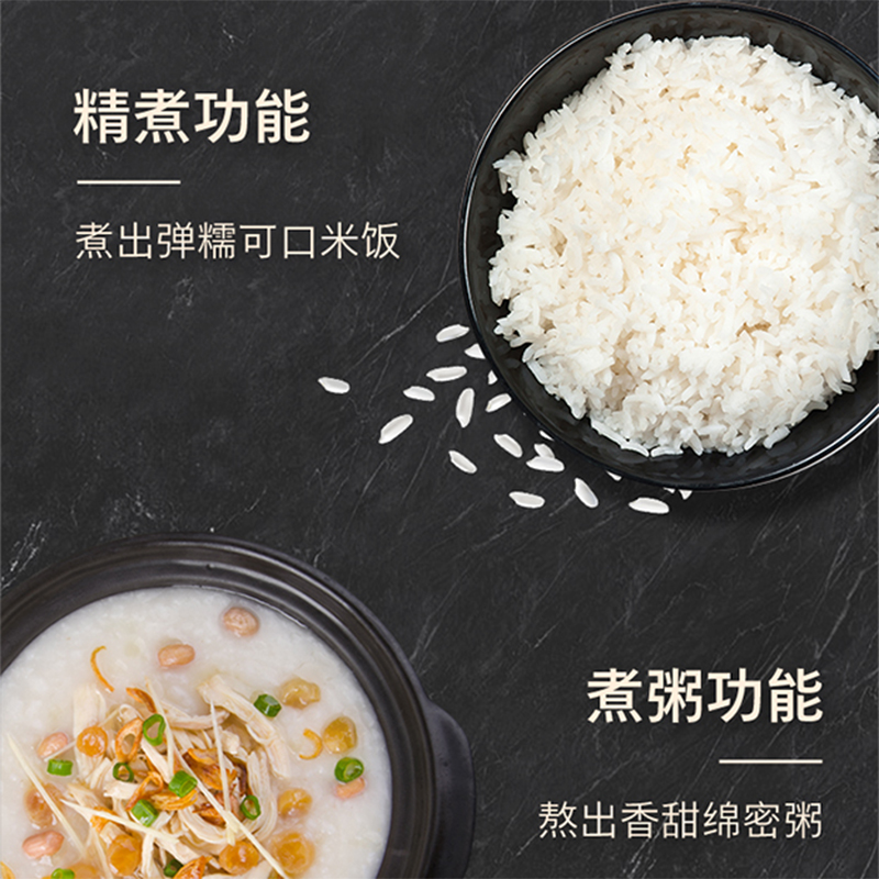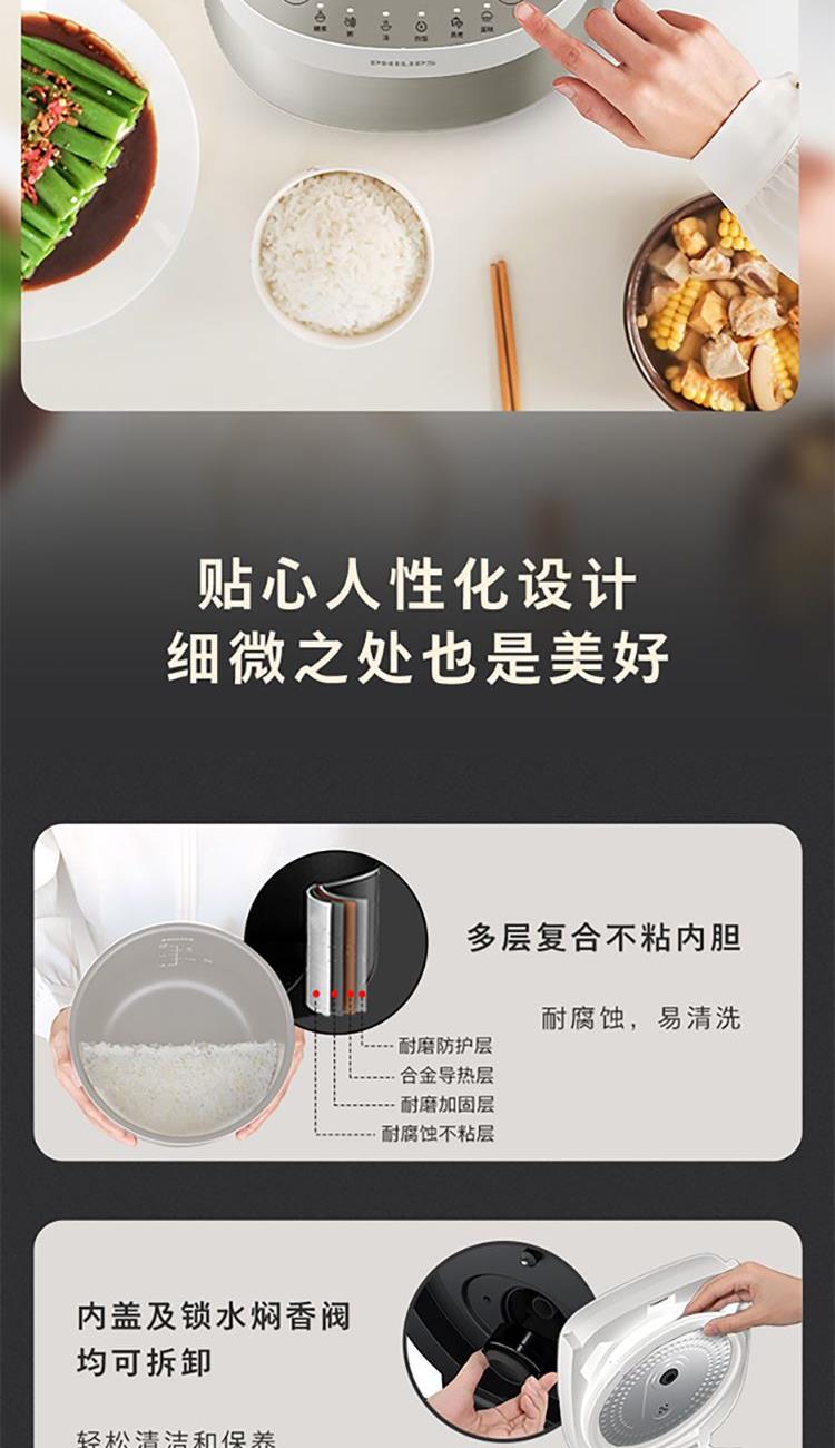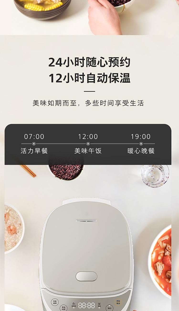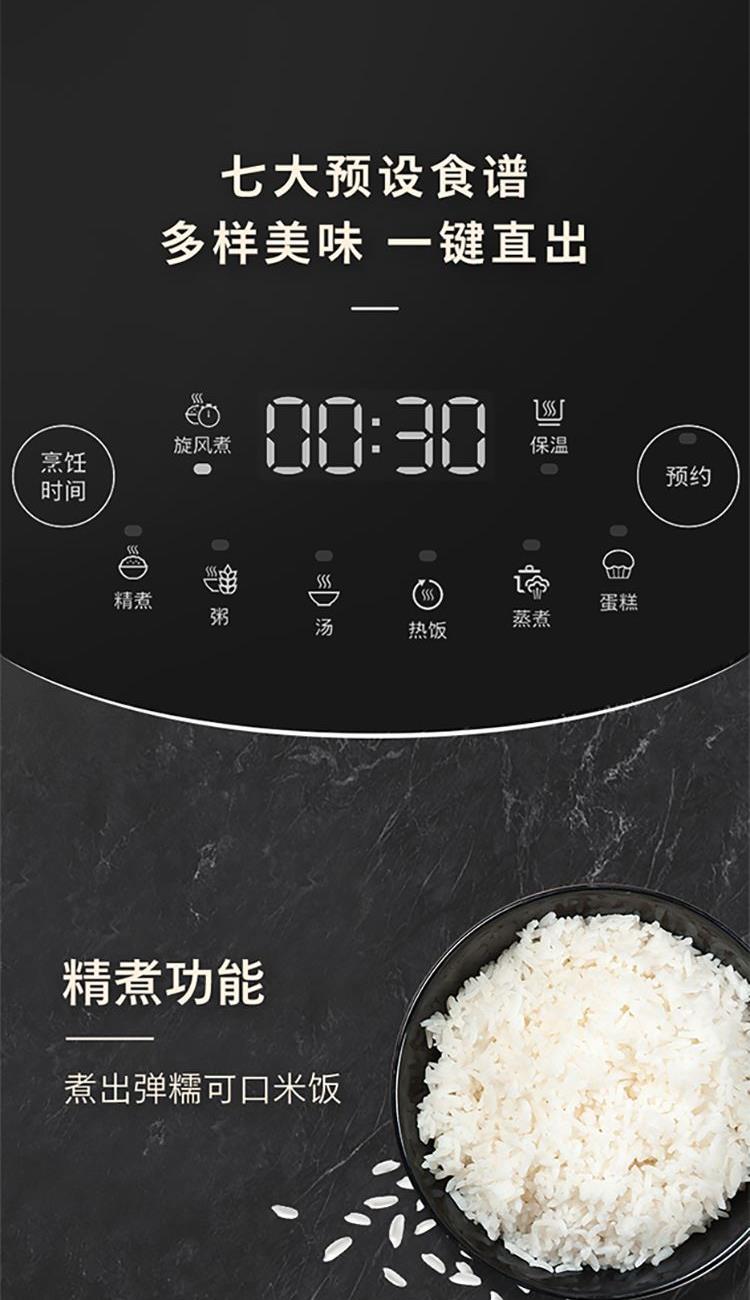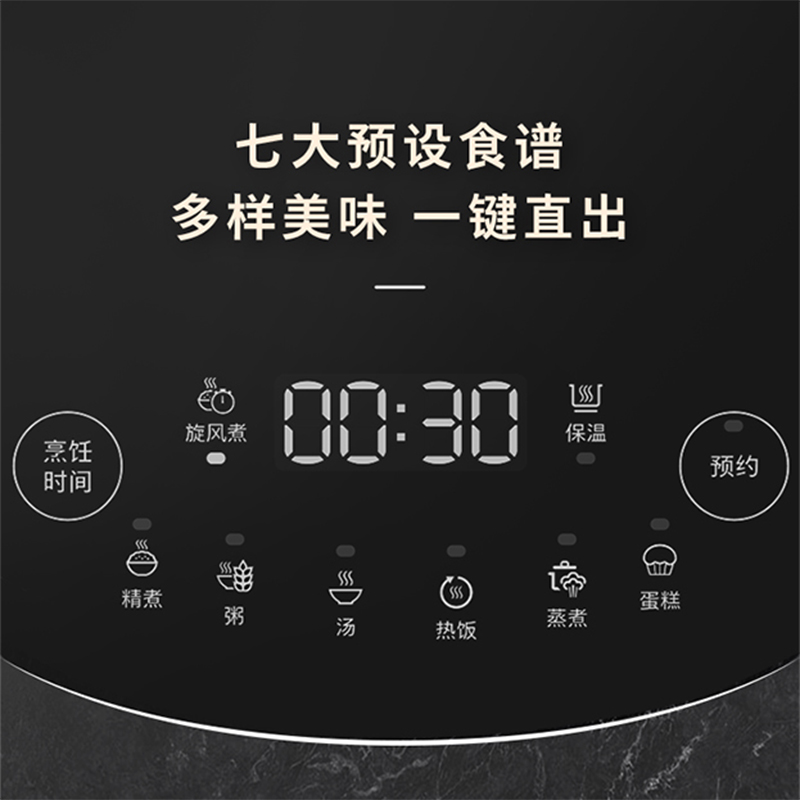 1.上下双NTC感温均匀加热,实时调温 2.24小时预约,12小时保温 3功能齐全旋风煮(30分钟),精煮,粥,汤,蛋糕,复热,蒸煮,保温 4.多层复合不粘内胆 5.操作便携,顶置按键面板 6.全新升级陶瓷釉内胆