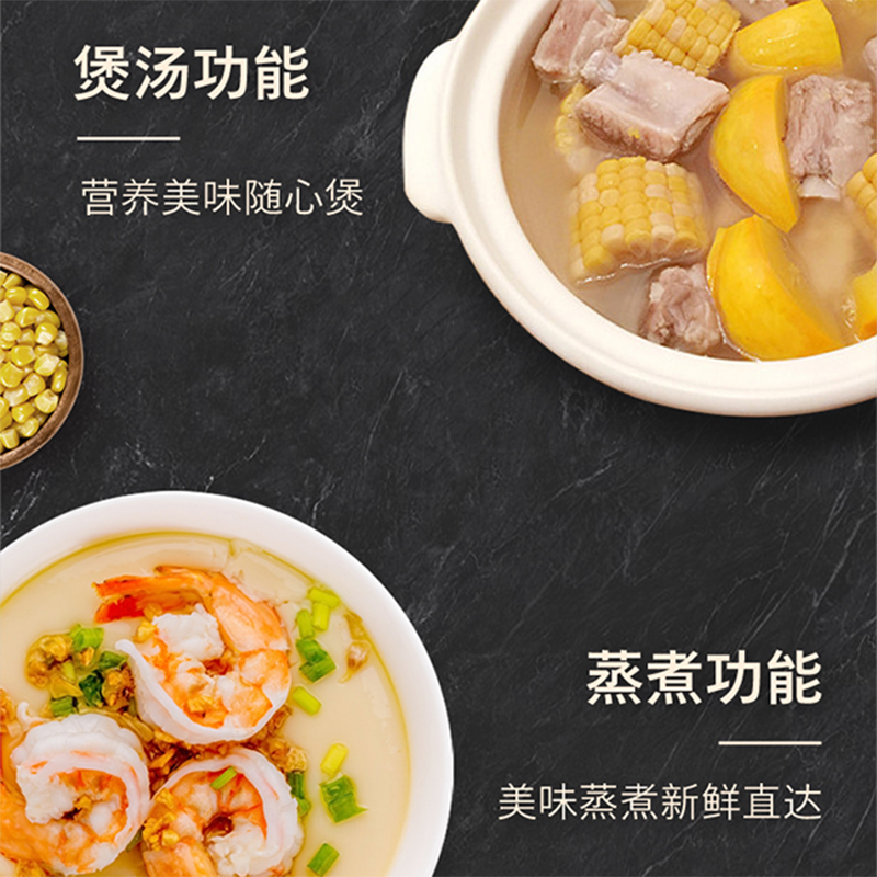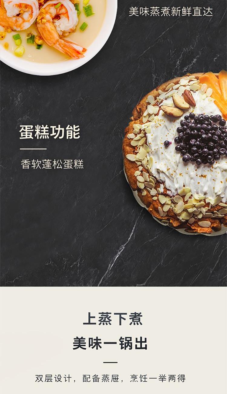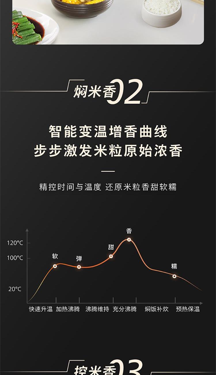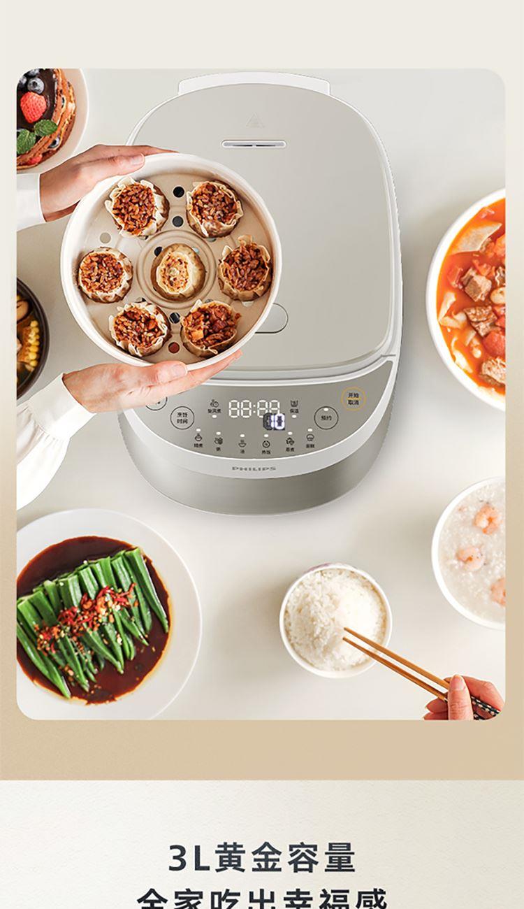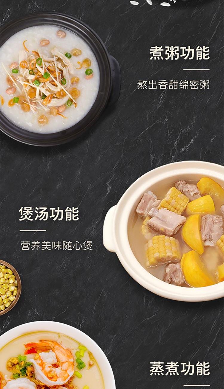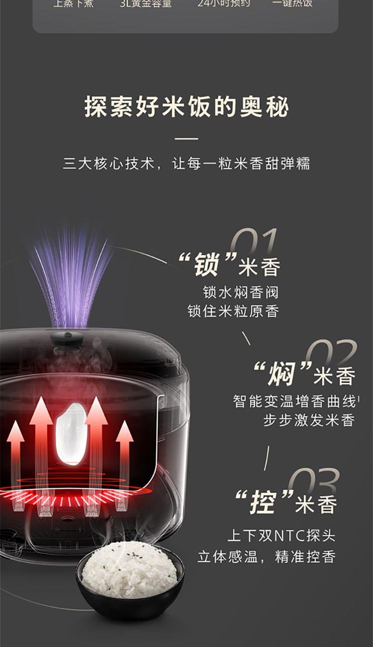 1.上下双NTC感温均匀加热,实时调温 2.24小时预约,12小时保温 3功能齐全旋风煮(30分钟),精煮,粥,汤,蛋糕,复热,蒸煮,保温 4.多层复合不粘内胆 5.操作便携,顶置按键面板 6.全新升级陶瓷釉内胆