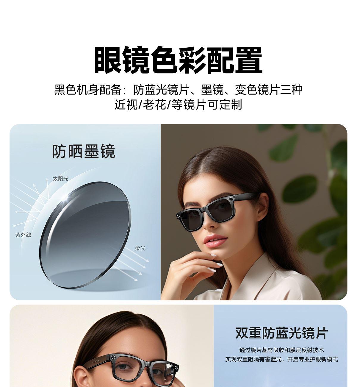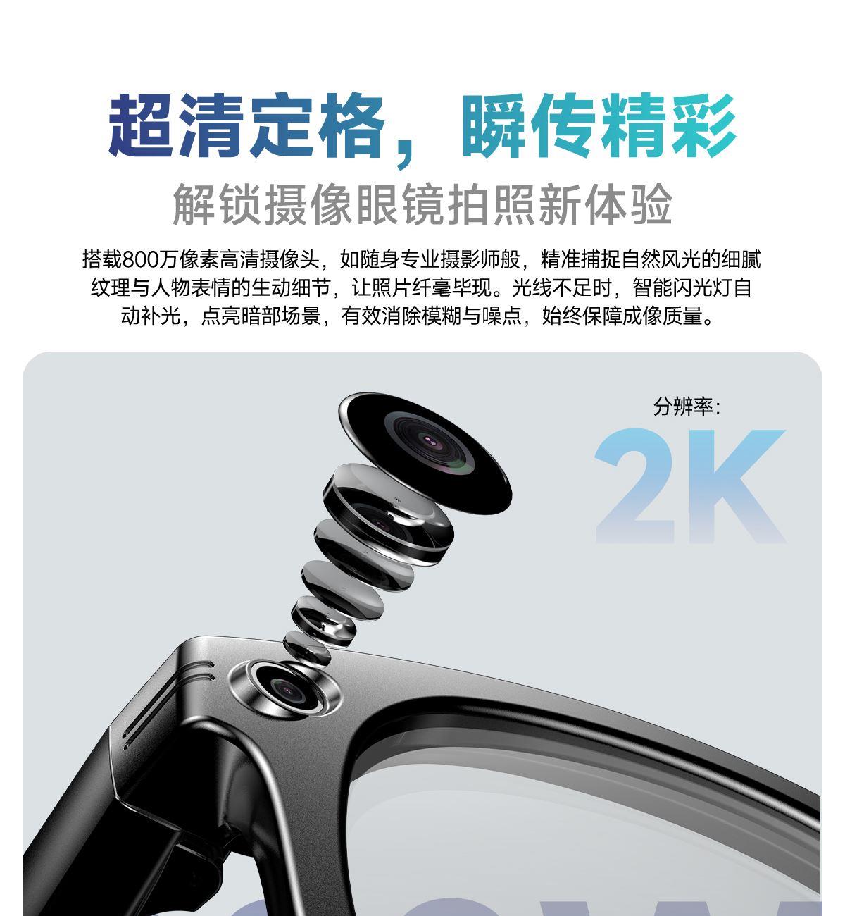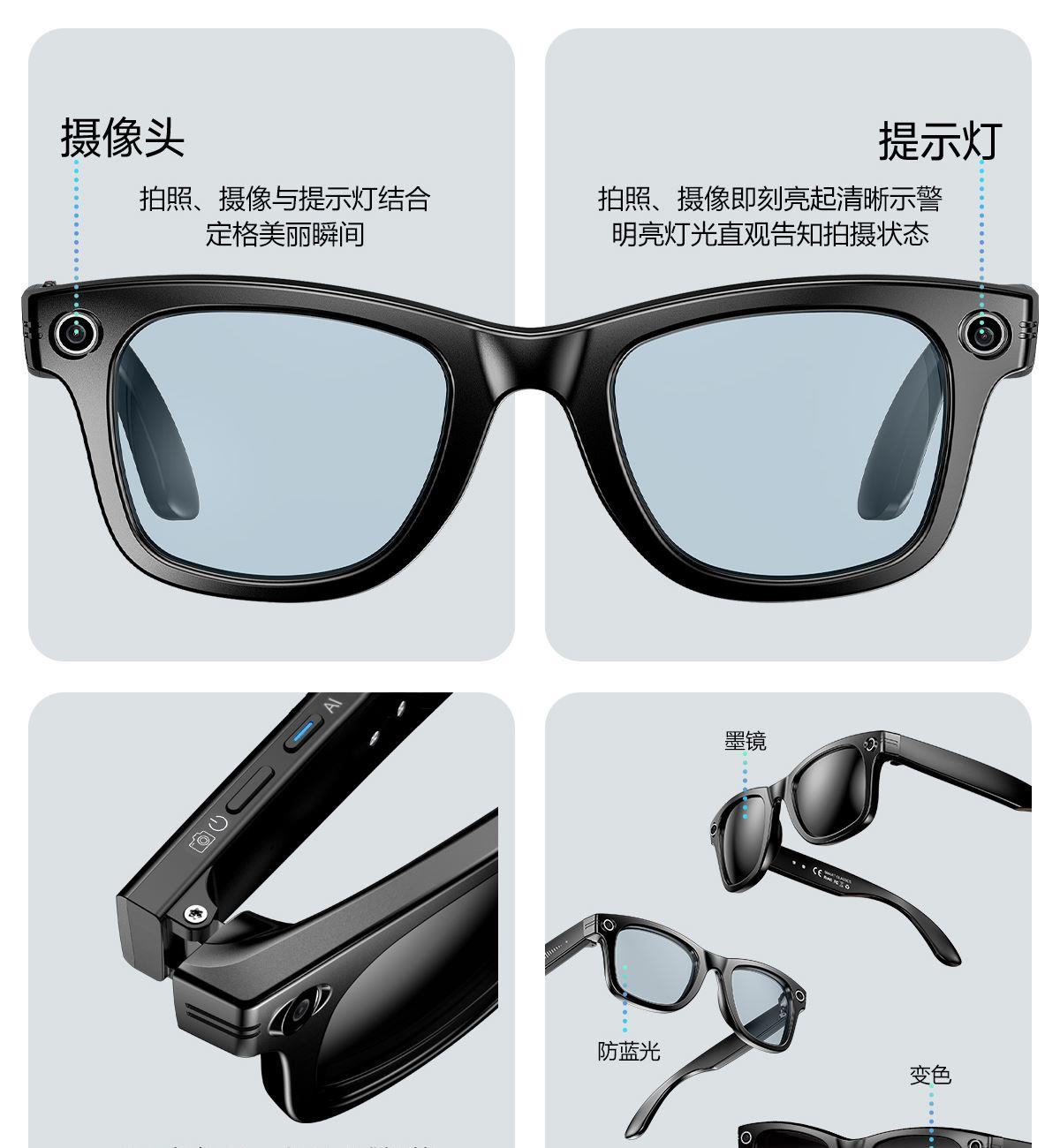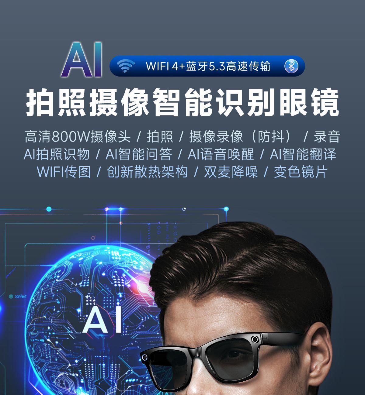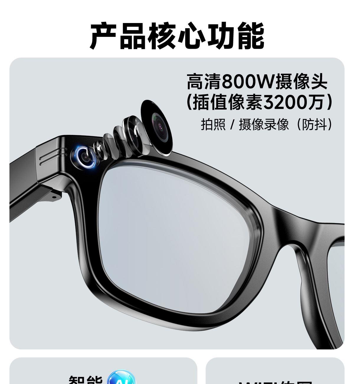 产品功能:高清800万摄像头(插值像素3200万),Ai语音唤醒,AI拍照识物,AI智能问答交互 、AI智能翻译,高清拍照和摄像录像(带防抖功能),录音,WIFI传图到手机(照片视频录音),滑动调节音量 ,佩戴检测,双麦克风降噪,通话降噪,智能语音助手、蓝牙通话、音乐播放(切换、暂停音乐欣赏)、续航持久、双物理按键+滑动触摸便捷操作、42g轻质整机重量佩戴舒适、可配置墨镜、蓝光、变色、近视等多种镜片,IP65防尘防水(点胶防水工艺),优化发热散热架构; APP语言:简体中文、繁体中文、乌克兰文、乌尔都文、俄文、克罗地亚文、匈牙利文、印地文、印度尼西亚文、土耳其文、希伯来文、希腊文、德文、意大利文、捷克语、斯洛伐克文、斯洛文尼亚文、日文、法语、波兰文、泰文、罗马尼亚文、英语、荷兰文、葡萄牙文、西班牙文、越南文、阿拉伯文、韩文、马来文