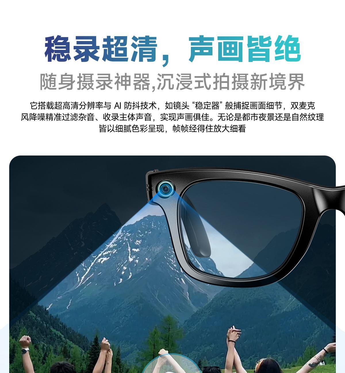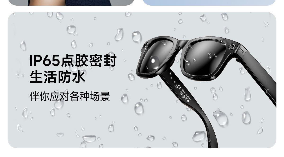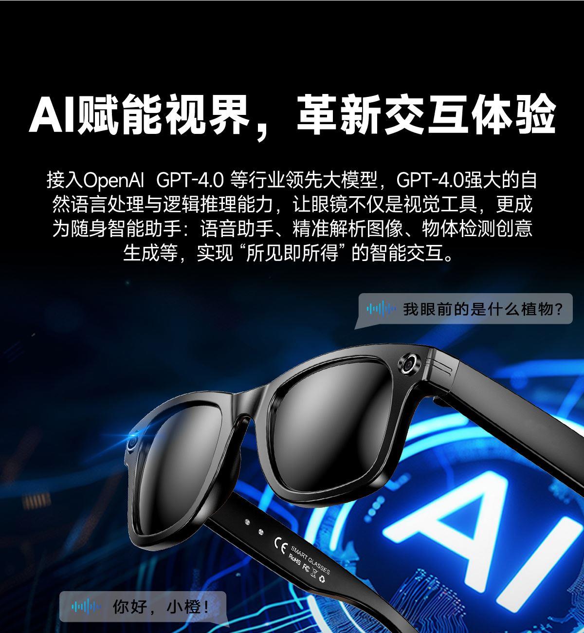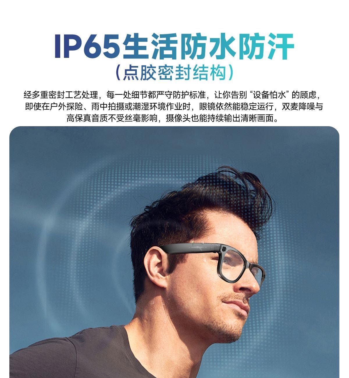 产品功能:高清800万摄像头(插值像素3200万),Ai语音唤醒,AI拍照识物,AI智能问答交互 、AI智能翻译,高清拍照和摄像录像(带防抖功能),录音,WIFI传图到手机(照片视频录音),滑动调节音量 ,佩戴检测,双麦克风降噪,通话降噪,智能语音助手、蓝牙通话、音乐播放(切换、暂停音乐欣赏)、续航持久、双物理按键+滑动触摸便捷操作、42g轻质整机重量佩戴舒适、可配置墨镜、蓝光、变色、近视等多种镜片,IP65防尘防水(点胶防水工艺),优化发热散热架构; APP语言:简体中文、繁体中文、乌克兰文、乌尔都文、俄文、克罗地亚文、匈牙利文、印地文、印度尼西亚文、土耳其文、希伯来文、希腊文、德文、意大利文、捷克语、斯洛伐克文、斯洛文尼亚文、日文、法语、波兰文、泰文、罗马尼亚文、英语、荷兰文、葡萄牙文、西班牙文、越南文、阿拉伯文、韩文、马来文