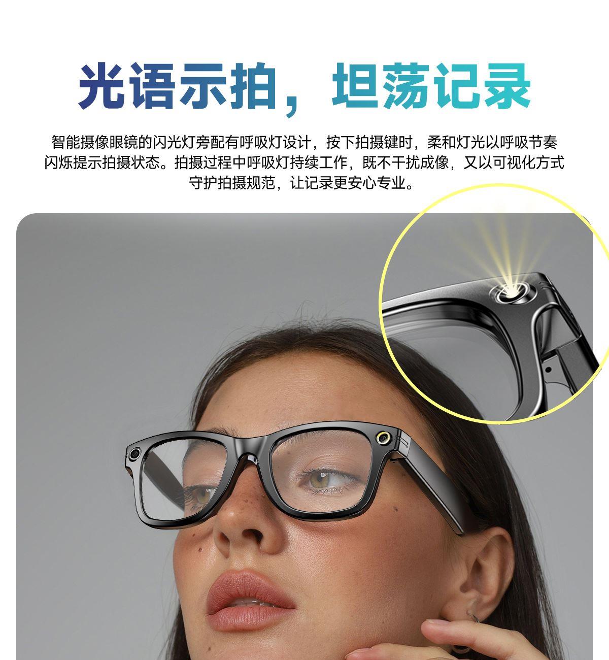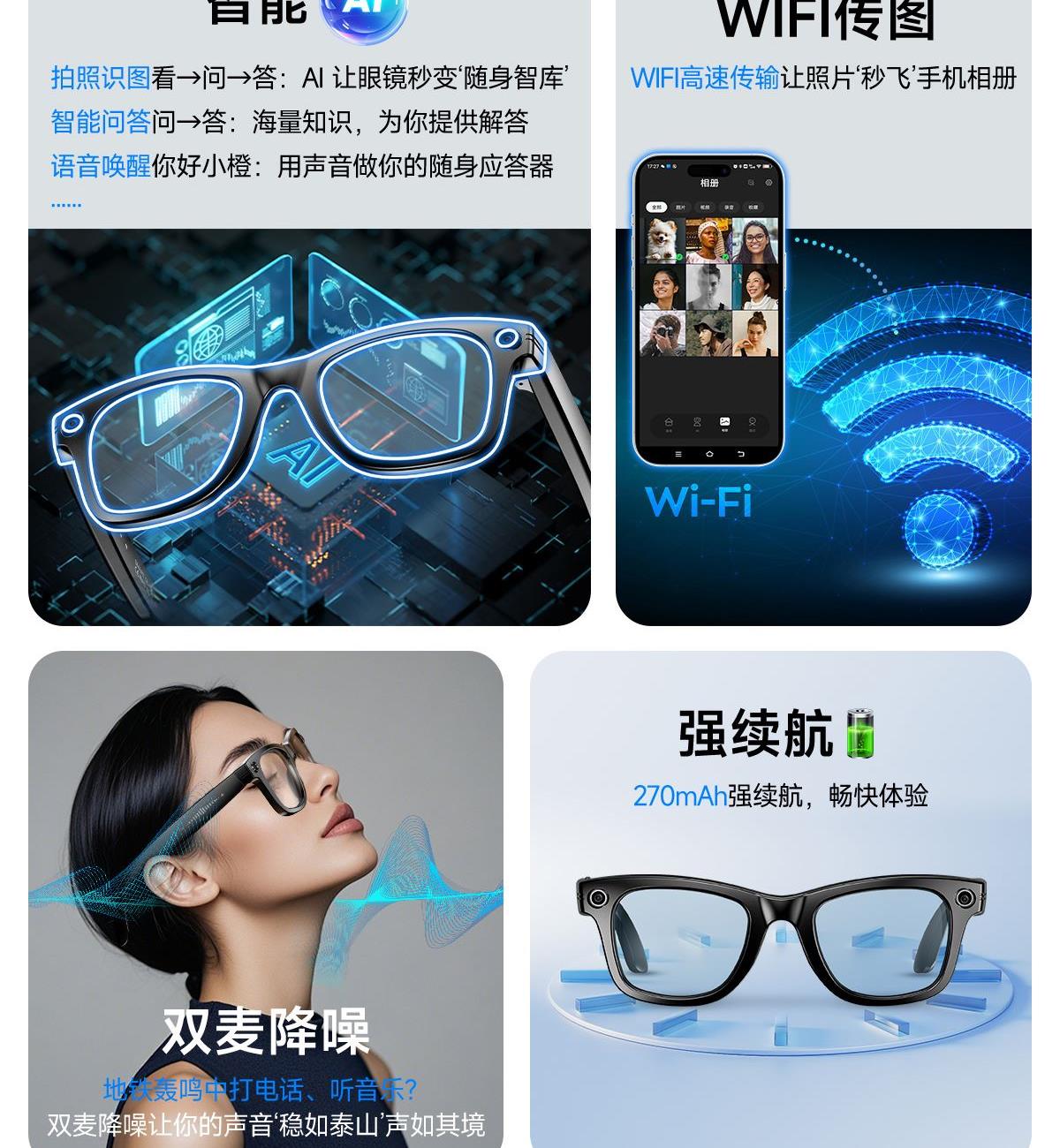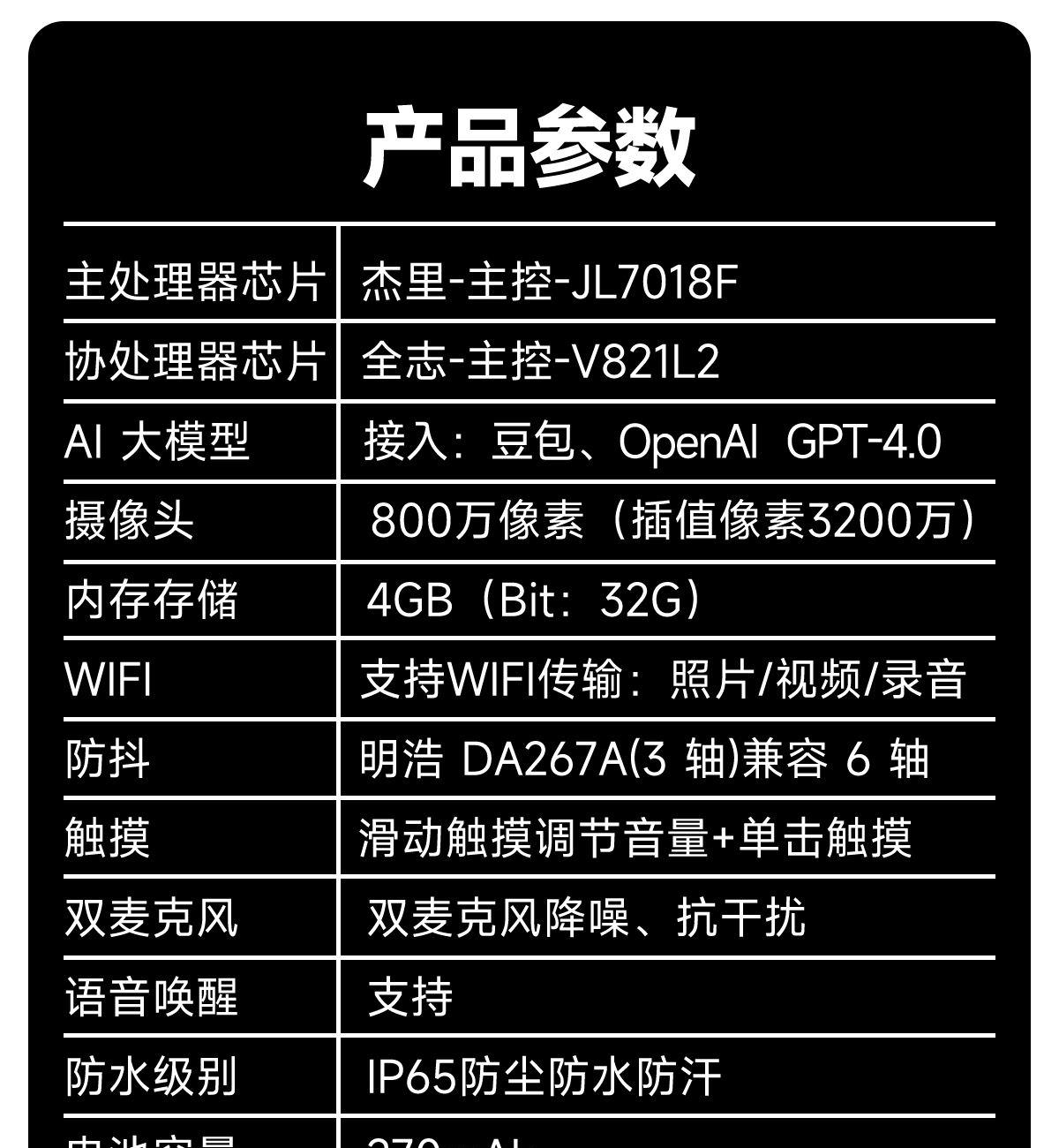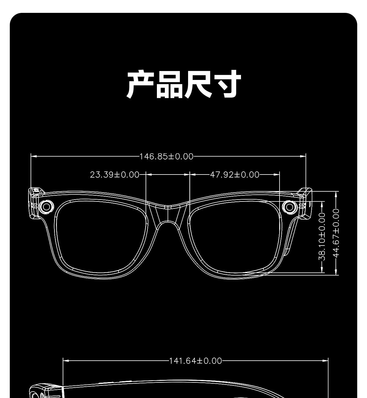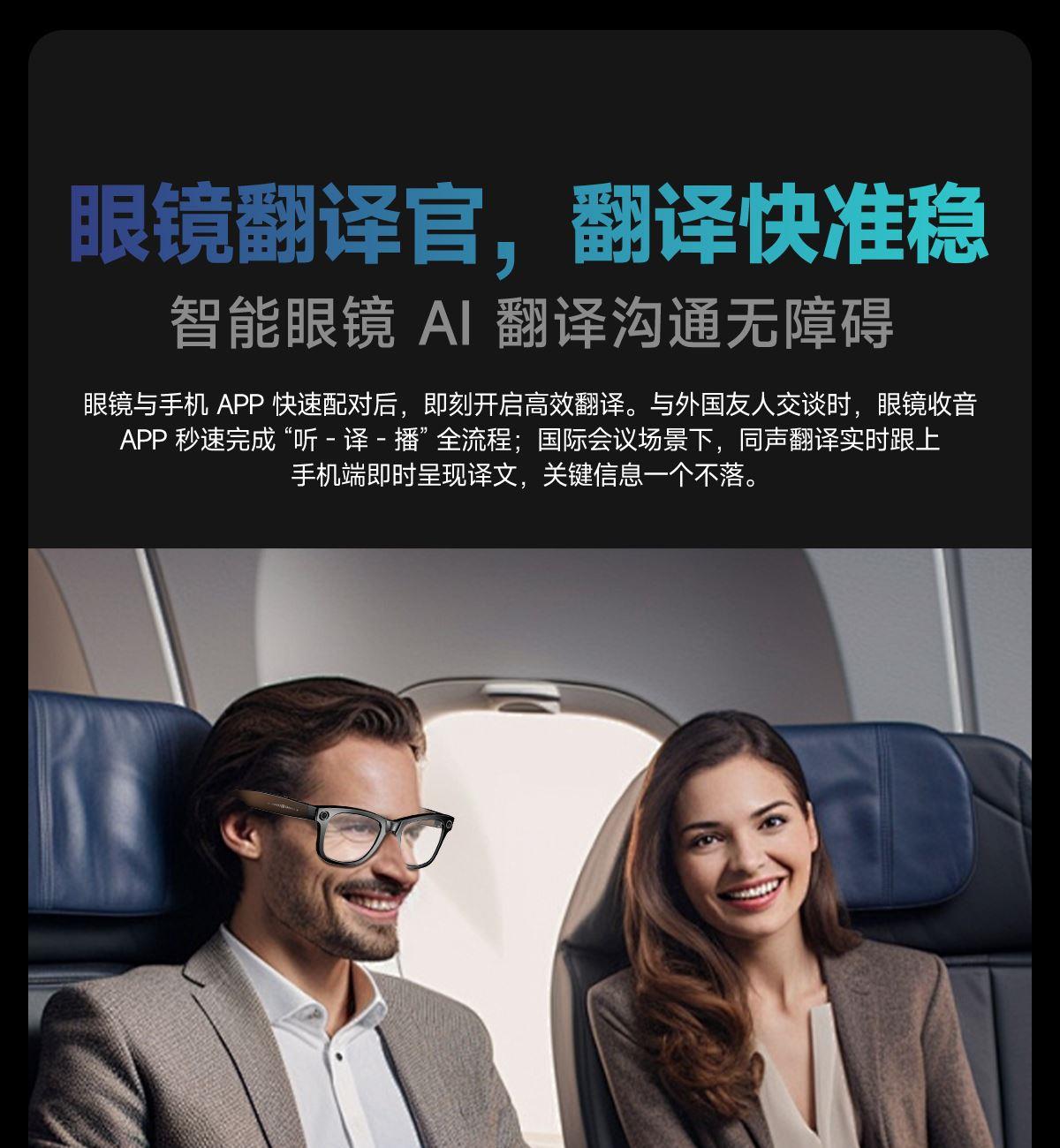 产品功能:高清800万摄像头(插值像素3200万),Ai语音唤醒,AI拍照识物,AI智能问答交互 、AI智能翻译,高清拍照和摄像录像(带防抖功能),录音,WIFI传图到手机(照片视频录音),滑动调节音量 ,佩戴检测,双麦克风降噪,通话降噪,智能语音助手、蓝牙通话、音乐播放(切换、暂停音乐欣赏)、续航持久、双物理按键+滑动触摸便捷操作、42g轻质整机重量佩戴舒适、可配置墨镜、蓝光、变色、近视等多种镜片,IP65防尘防水(点胶防水工艺),优化发热散热架构; APP语言:简体中文、繁体中文、乌克兰文、乌尔都文、俄文、克罗地亚文、匈牙利文、印地文、印度尼西亚文、土耳其文、希伯来文、希腊文、德文、意大利文、捷克语、斯洛伐克文、斯洛文尼亚文、日文、法语、波兰文、泰文、罗马尼亚文、英语、荷兰文、葡萄牙文、西班牙文、越南文、阿拉伯文、韩文、马来文