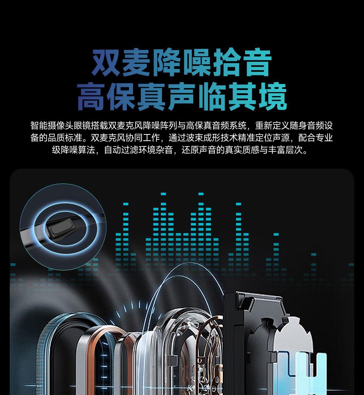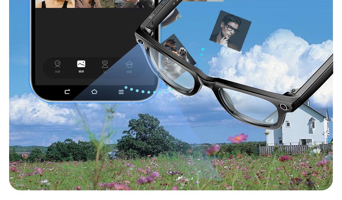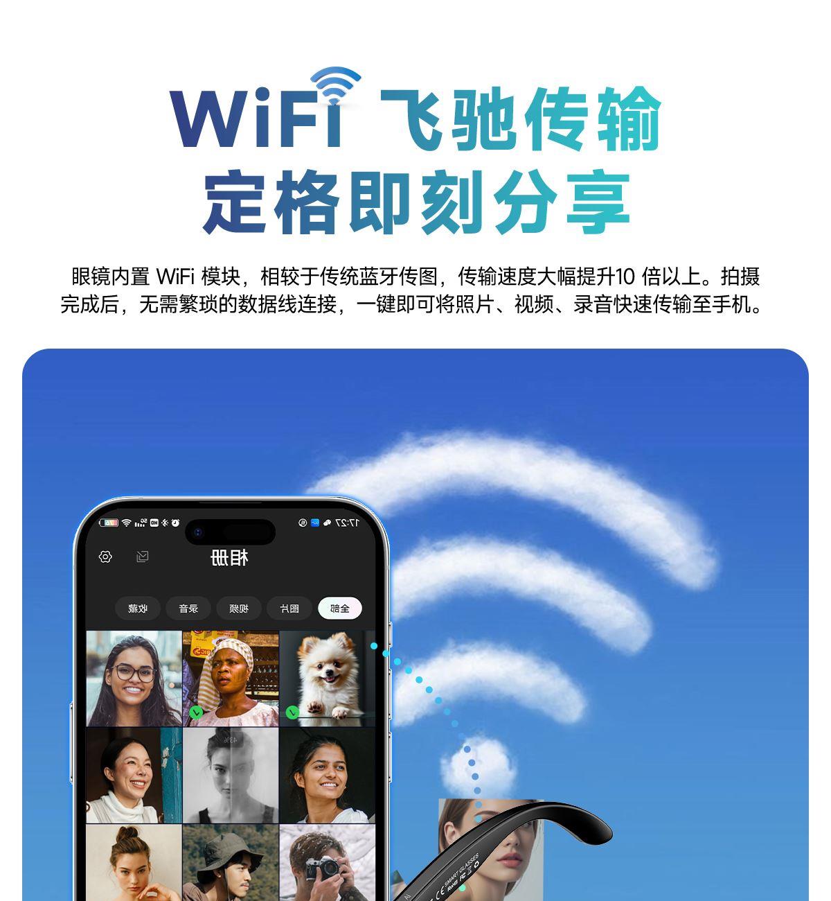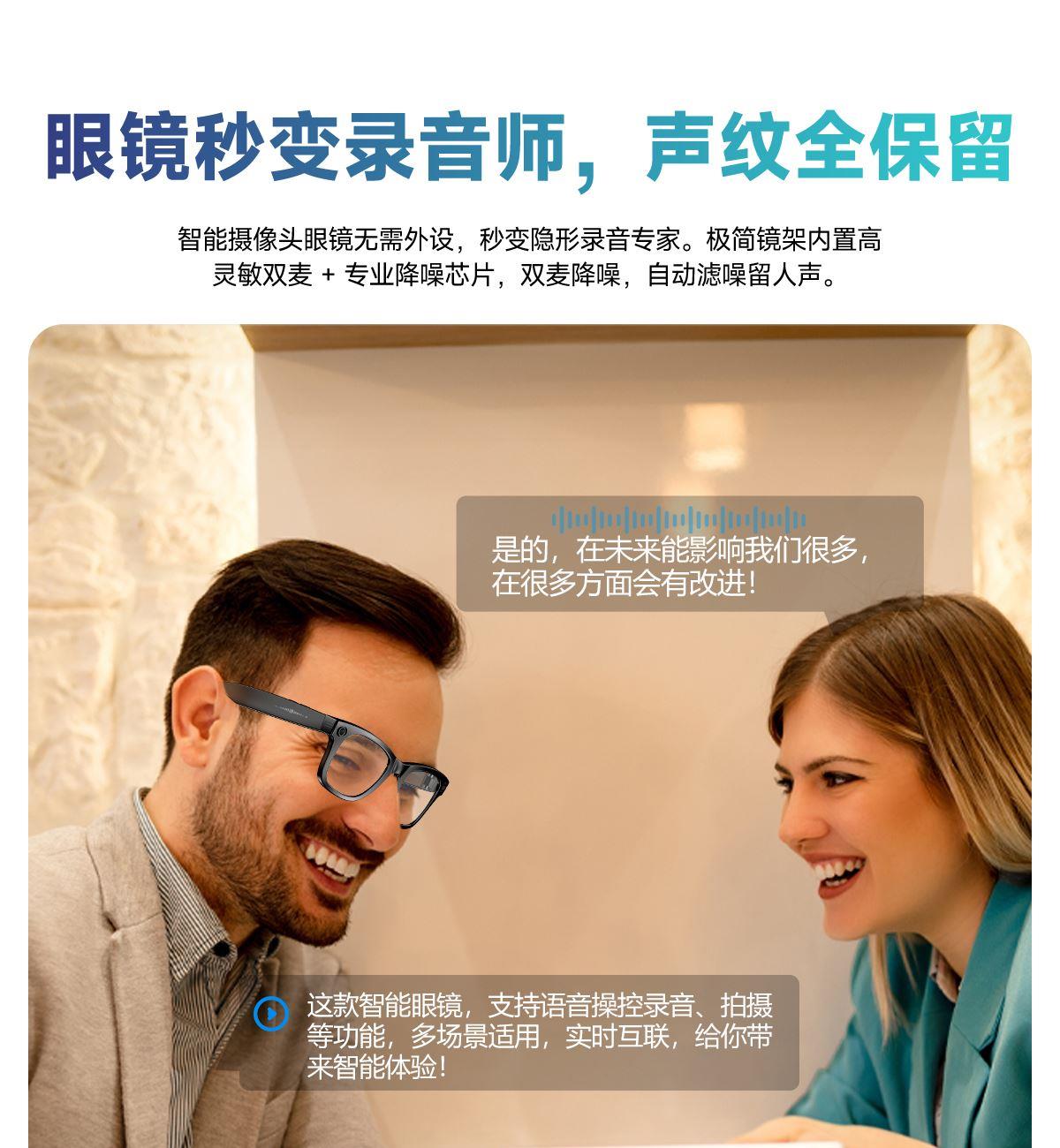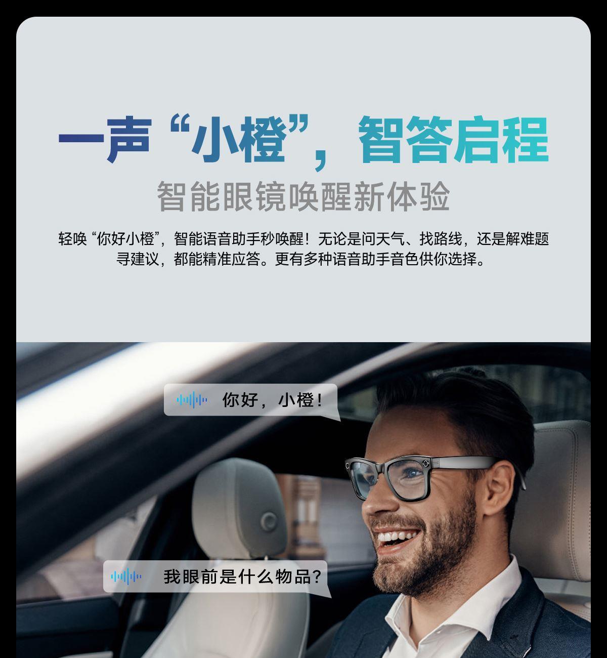 产品功能:高清800万摄像头(插值像素3200万),Ai语音唤醒,AI拍照识物,AI智能问答交互 、AI智能翻译,高清拍照和摄像录像(带防抖功能),录音,WIFI传图到手机(照片视频录音),滑动调节音量 ,佩戴检测,双麦克风降噪,通话降噪,智能语音助手、蓝牙通话、音乐播放(切换、暂停音乐欣赏)、续航持久、双物理按键+滑动触摸便捷操作、42g轻质整机重量佩戴舒适、可配置墨镜、蓝光、变色、近视等多种镜片,IP65防尘防水(点胶防水工艺),优化发热散热架构; APP语言:简体中文、繁体中文、乌克兰文、乌尔都文、俄文、克罗地亚文、匈牙利文、印地文、印度尼西亚文、土耳其文、希伯来文、希腊文、德文、意大利文、捷克语、斯洛伐克文、斯洛文尼亚文、日文、法语、波兰文、泰文、罗马尼亚文、英语、荷兰文、葡萄牙文、西班牙文、越南文、阿拉伯文、韩文、马来文