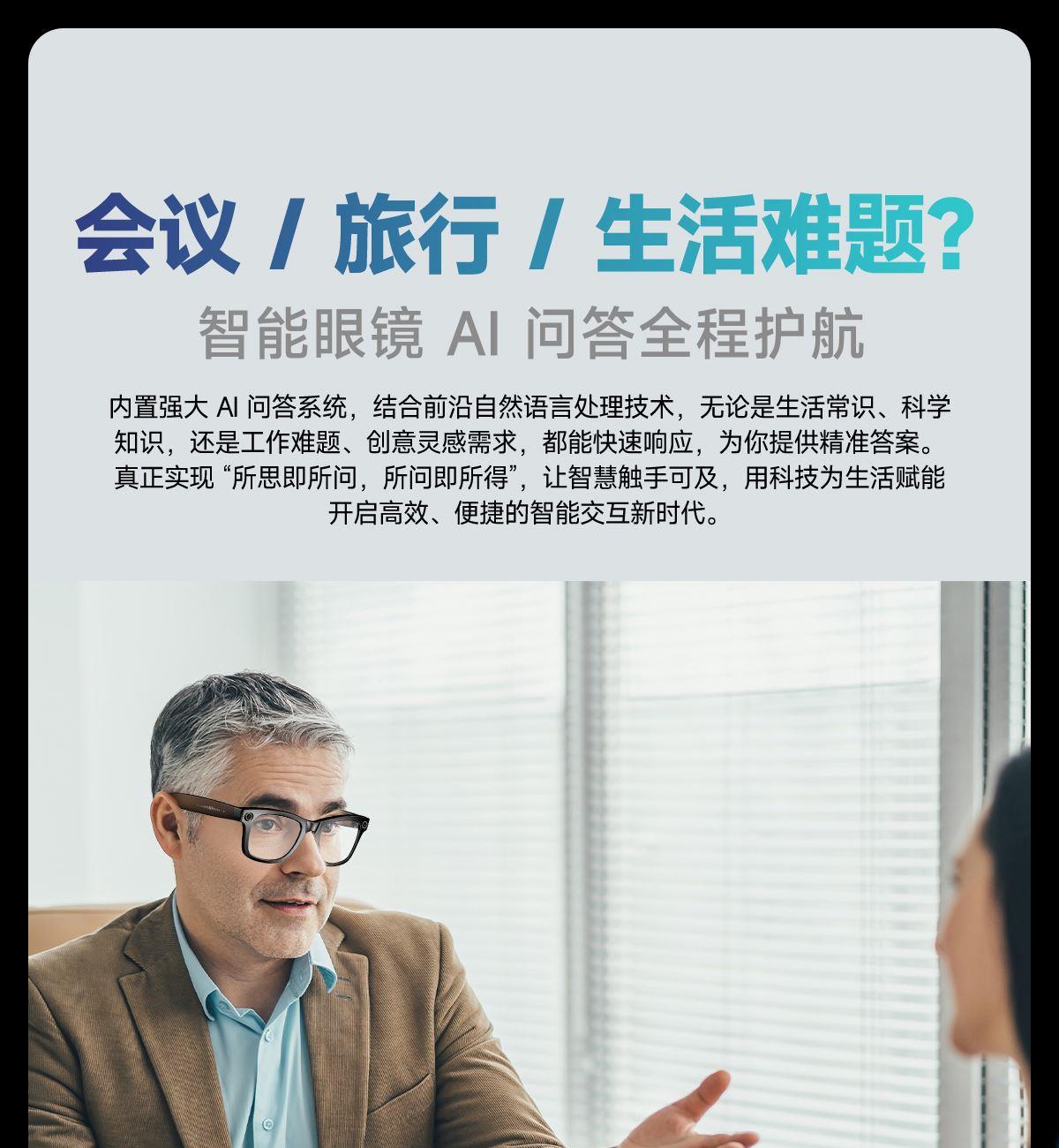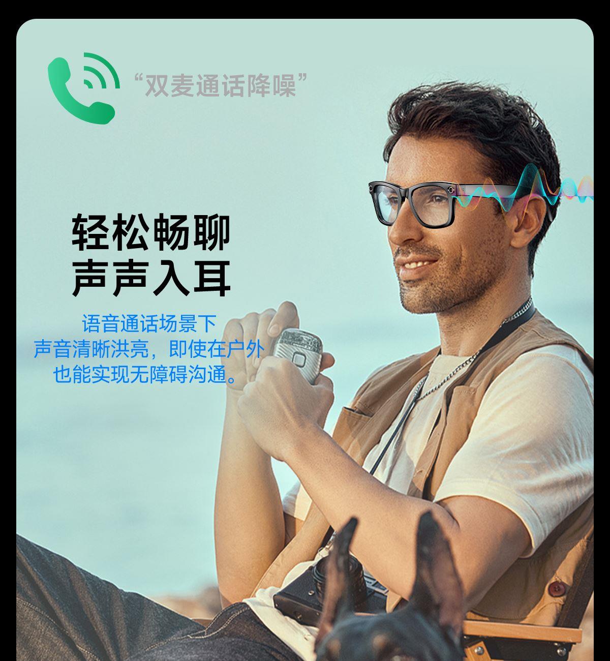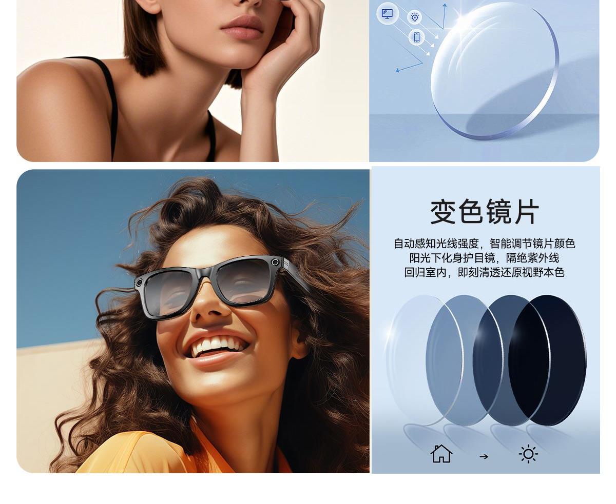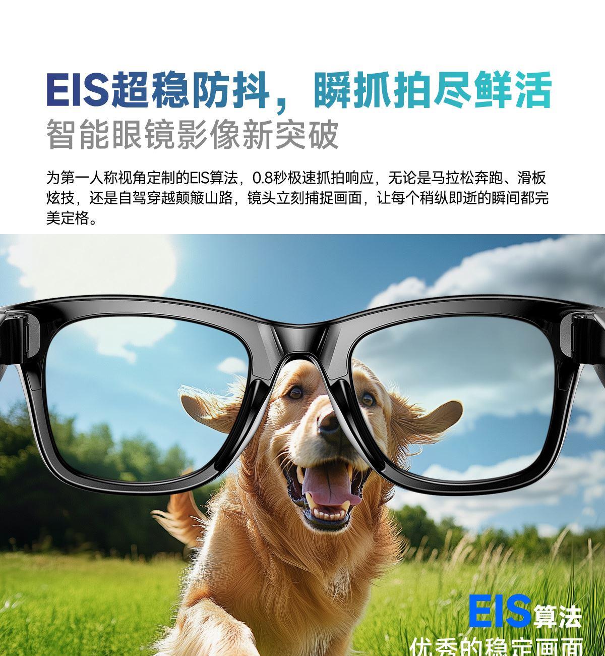 产品功能:高清800万摄像头(插值像素3200万),Ai语音唤醒,AI拍照识物,AI智能问答交互 、AI智能翻译,高清拍照和摄像录像(带防抖功能),录音,WIFI传图到手机(照片视频录音),滑动调节音量 ,佩戴检测,双麦克风降噪,通话降噪,智能语音助手、蓝牙通话、音乐播放(切换、暂停音乐欣赏)、续航持久、双物理按键+滑动触摸便捷操作、42g轻质整机重量佩戴舒适、可配置墨镜、蓝光、变色、近视等多种镜片,IP65防尘防水(点胶防水工艺),优化发热散热架构; APP语言:简体中文、繁体中文、乌克兰文、乌尔都文、俄文、克罗地亚文、匈牙利文、印地文、印度尼西亚文、土耳其文、希伯来文、希腊文、德文、意大利文、捷克语、斯洛伐克文、斯洛文尼亚文、日文、法语、波兰文、泰文、罗马尼亚文、英语、荷兰文、葡萄牙文、西班牙文、越南文、阿拉伯文、韩文、马来文
