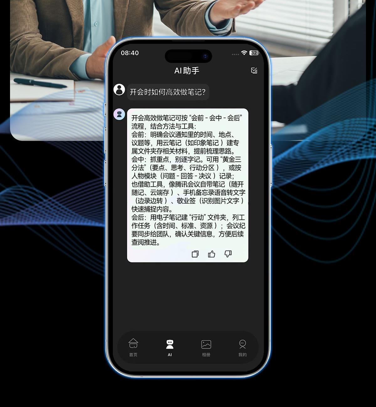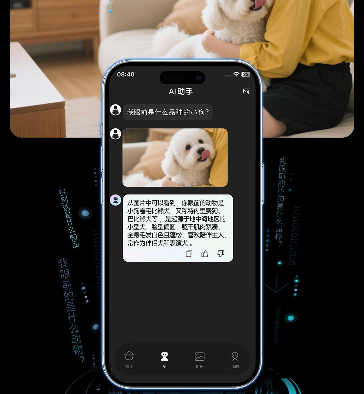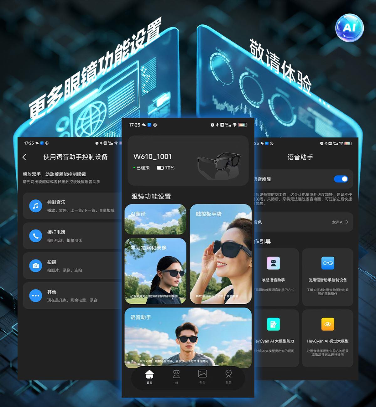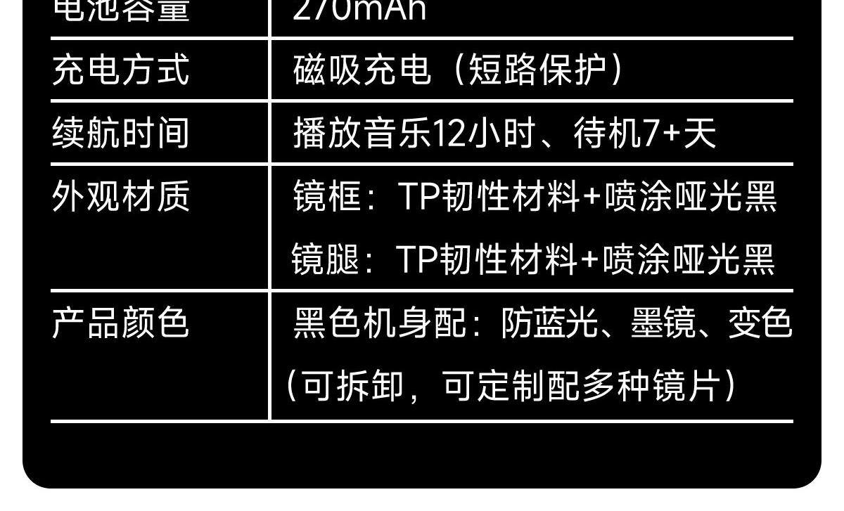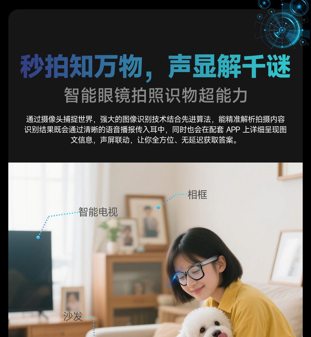 产品功能:高清800万摄像头(插值像素3200万),Ai语音唤醒,AI拍照识物,AI智能问答交互 、AI智能翻译,高清拍照和摄像录像(带防抖功能),录音,WIFI传图到手机(照片视频录音),滑动调节音量 ,佩戴检测,双麦克风降噪,通话降噪,智能语音助手、蓝牙通话、音乐播放(切换、暂停音乐欣赏)、续航持久、双物理按键+滑动触摸便捷操作、42g轻质整机重量佩戴舒适、可配置墨镜、蓝光、变色、近视等多种镜片,IP65防尘防水(点胶防水工艺),优化发热散热架构; APP语言:简体中文、繁体中文、乌克兰文、乌尔都文、俄文、克罗地亚文、匈牙利文、印地文、印度尼西亚文、土耳其文、希伯来文、希腊文、德文、意大利文、捷克语、斯洛伐克文、斯洛文尼亚文、日文、法语、波兰文、泰文、罗马尼亚文、英语、荷兰文、葡萄牙文、西班牙文、越南文、阿拉伯文、韩文、马来文