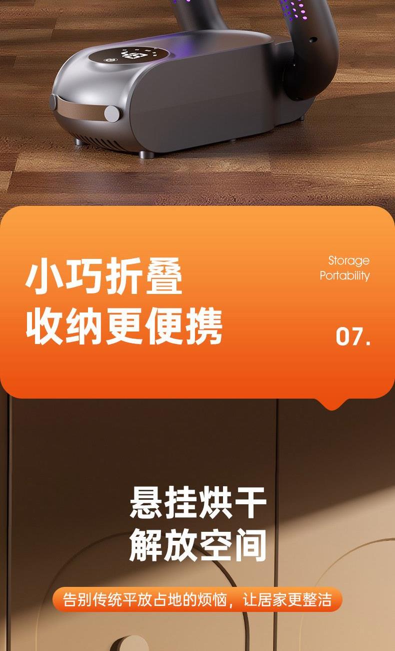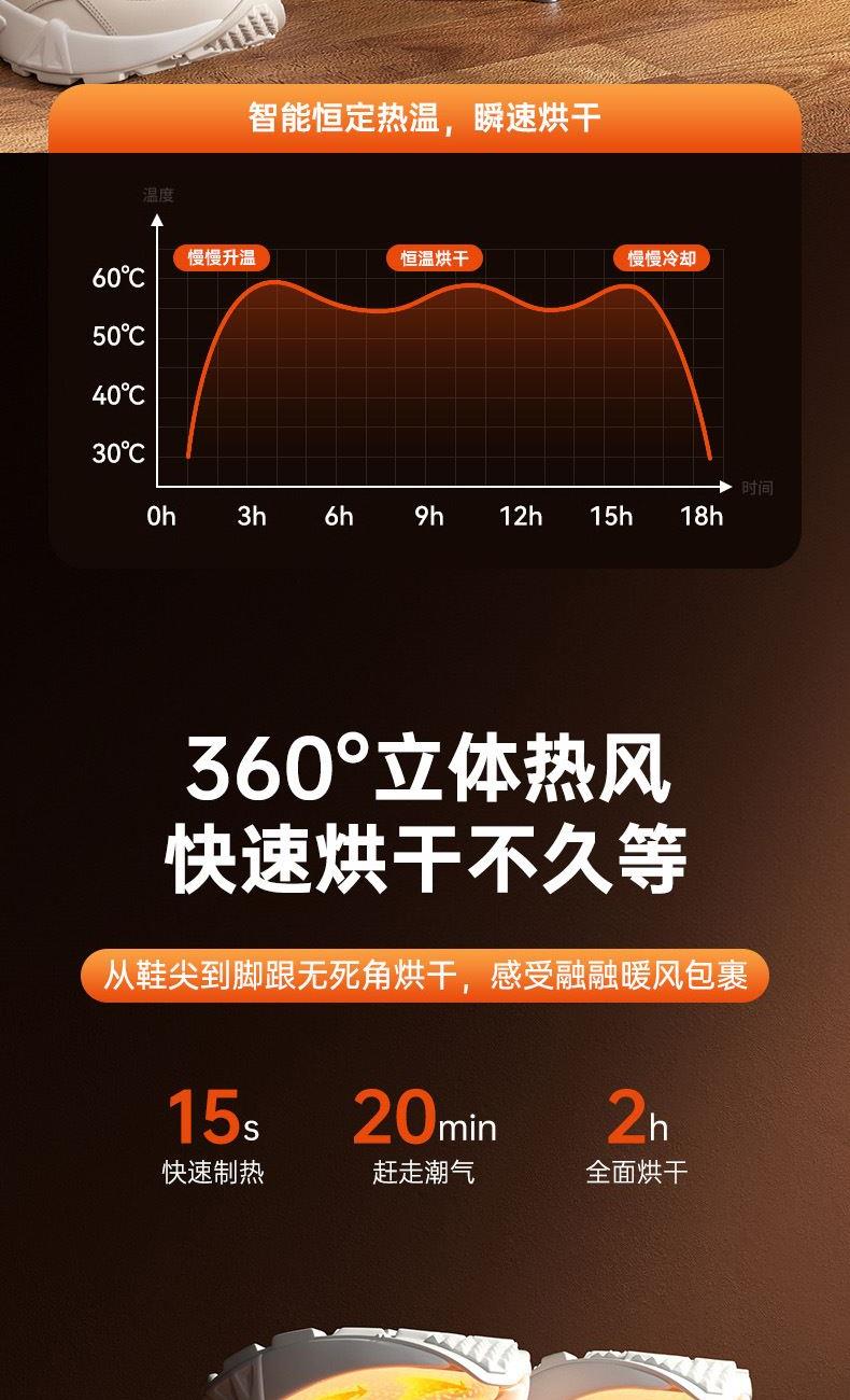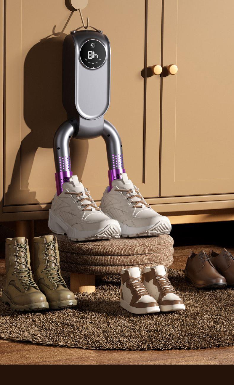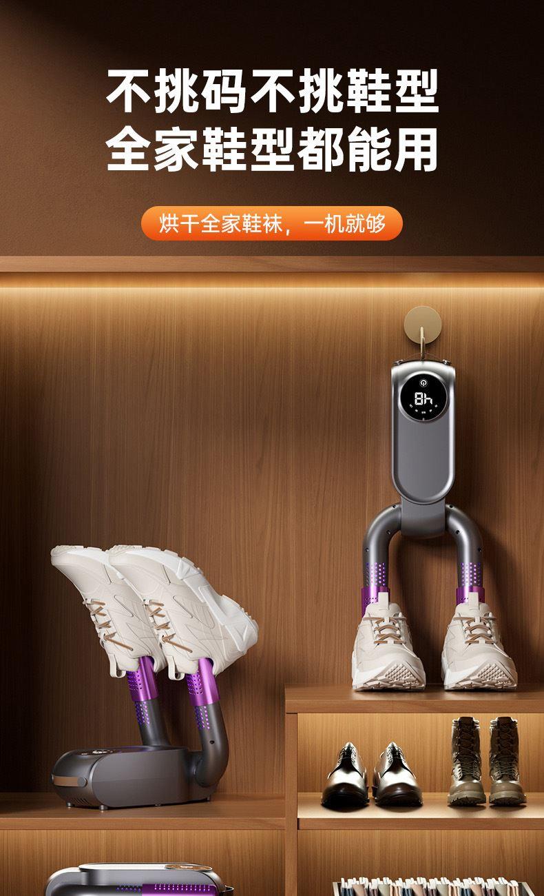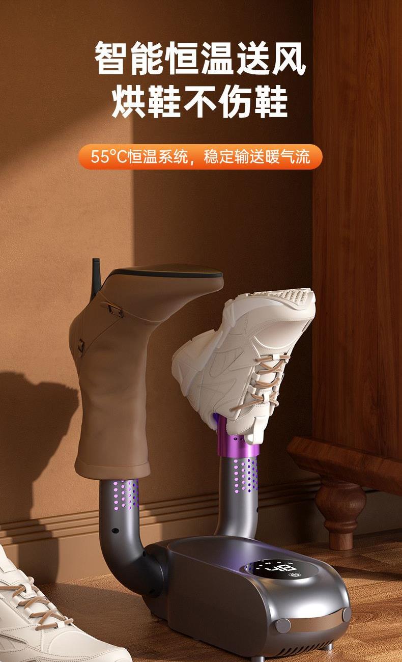 颜色:白色、灰紫色 供电方式:220V直插电 额定功率:150W 主机包装:18.3*8.8*27.5cm/570g 外箱尺寸:57.5*47*57.5cm/30台/18.1kg 产品标配:彩盒、主机、说明书 可折叠式出风口,360度立体热风烘干 双核PTC发热,智能恒温,烘干不伤鞋 UV紫光消菌,除臭净味二合一 2小时定时烘干