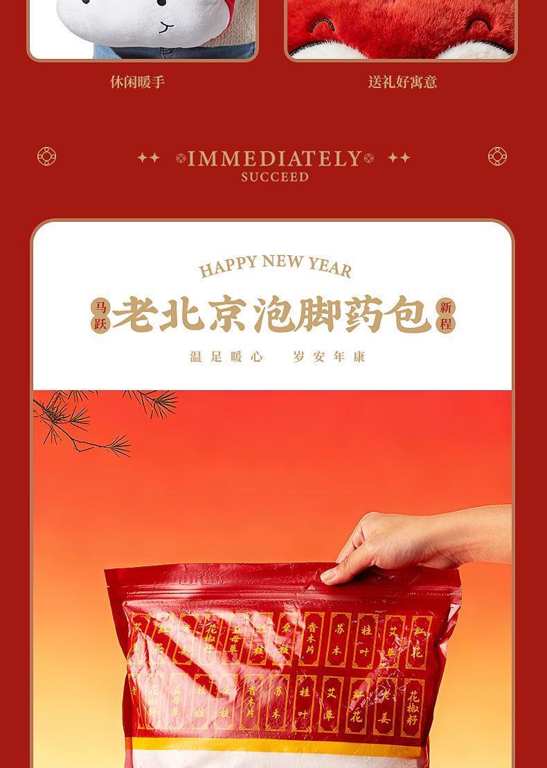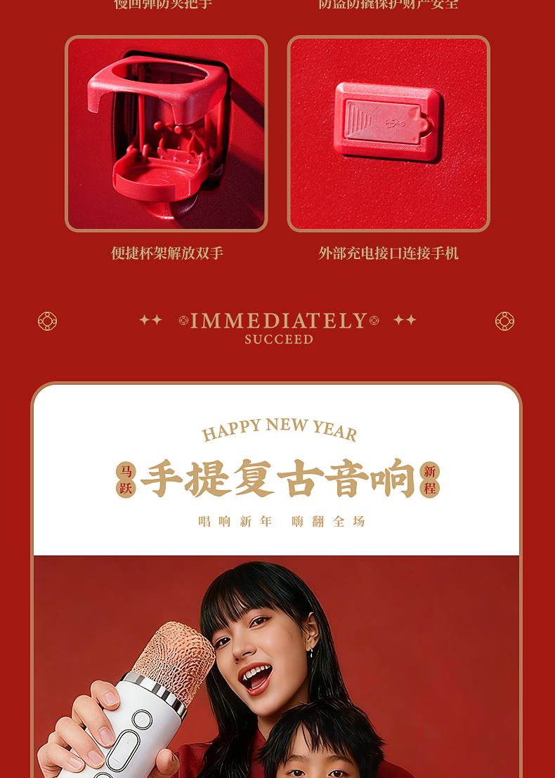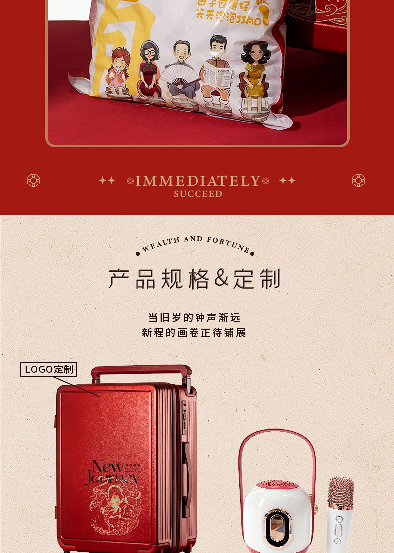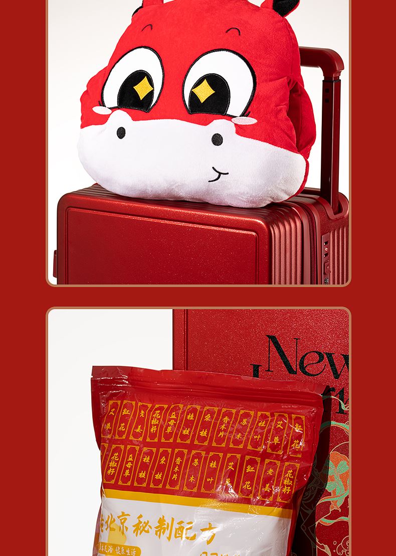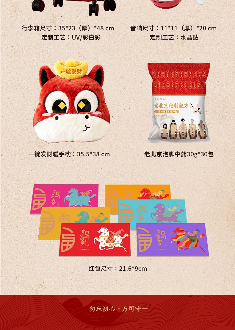 产品配置:20寸行李箱、多功能蓝牙音响加氛围灯加唛、一锭发财可爱抱枕、十八味药材泡脚包30小包、马年大吉红包*6个
