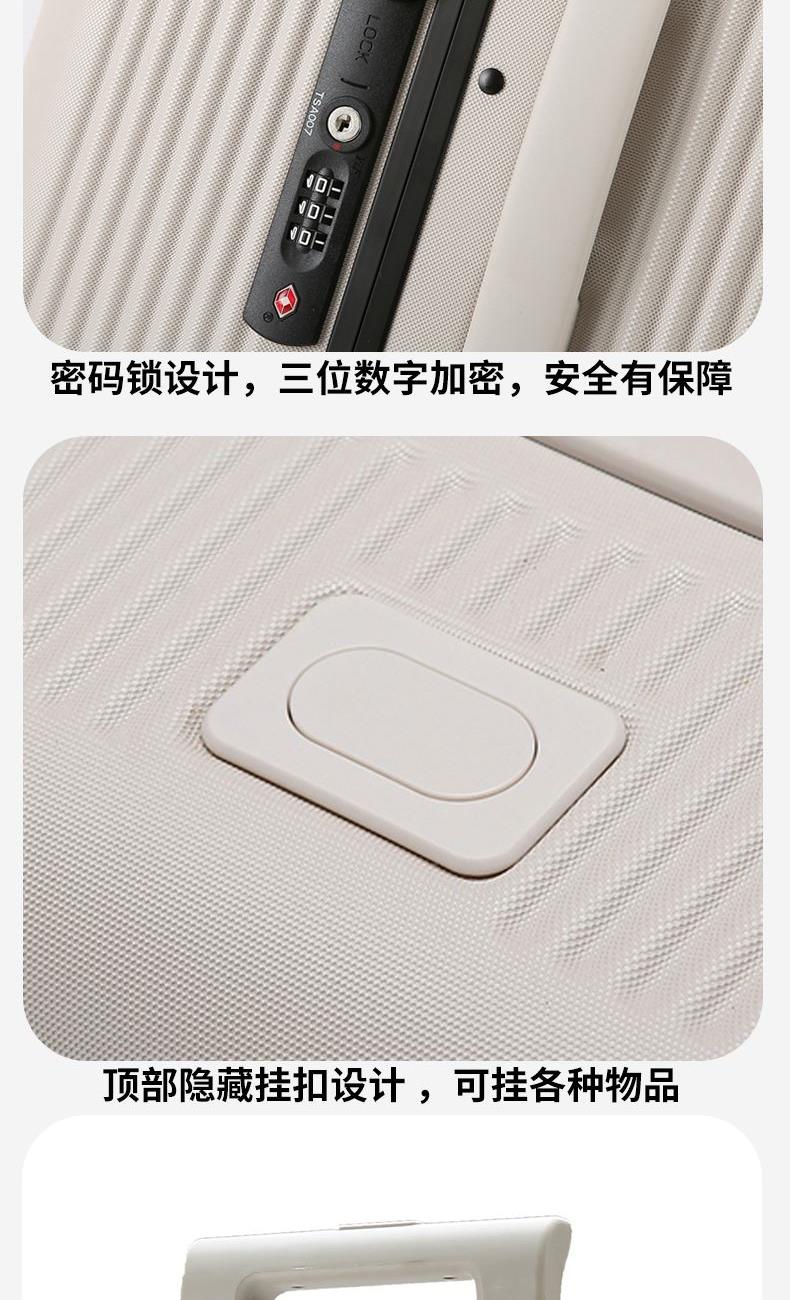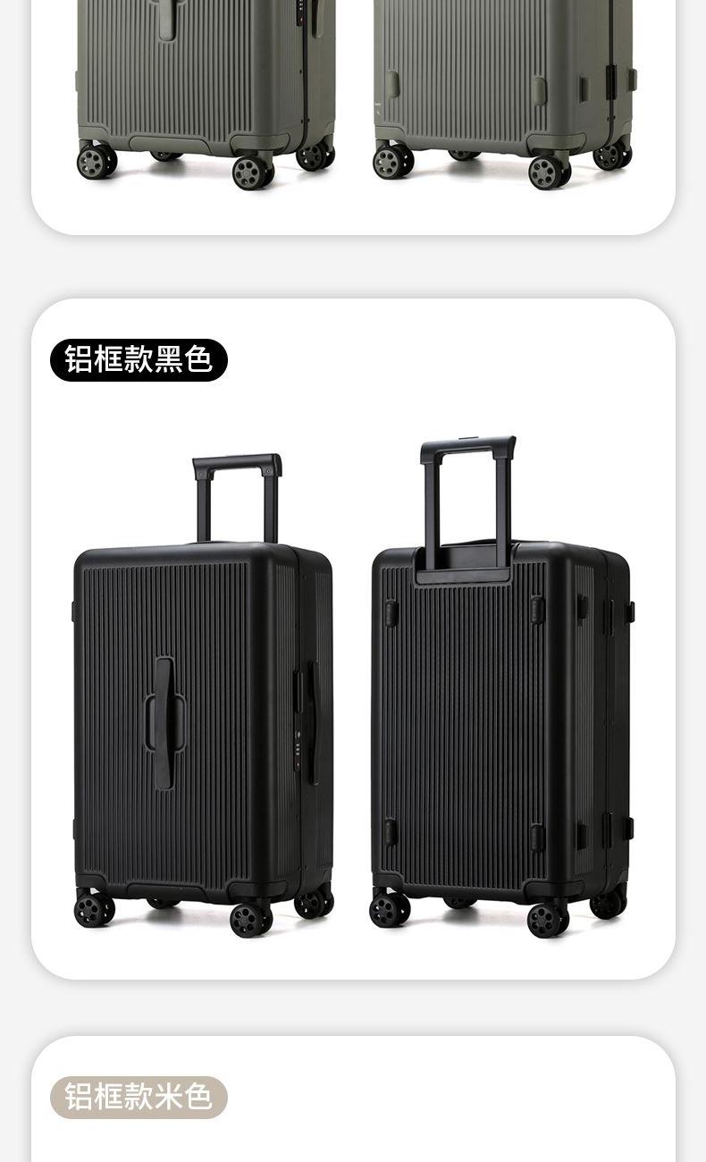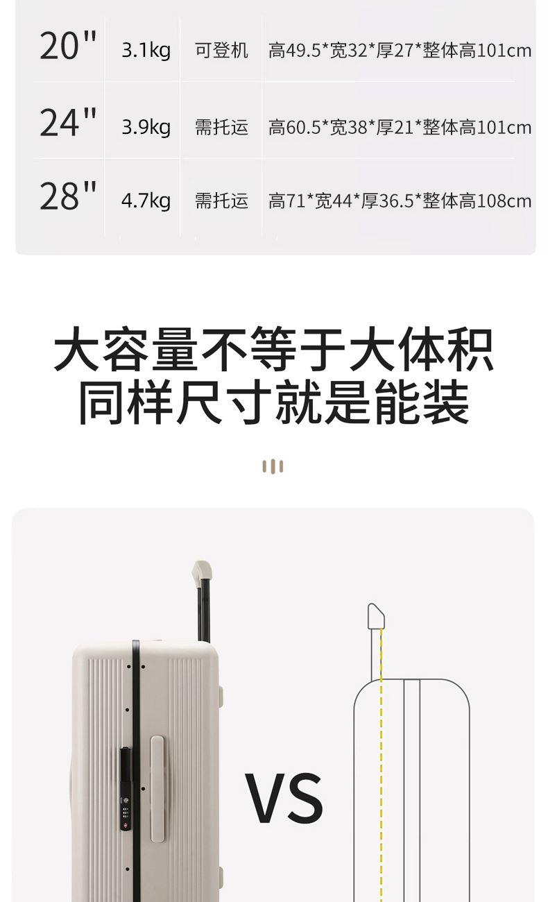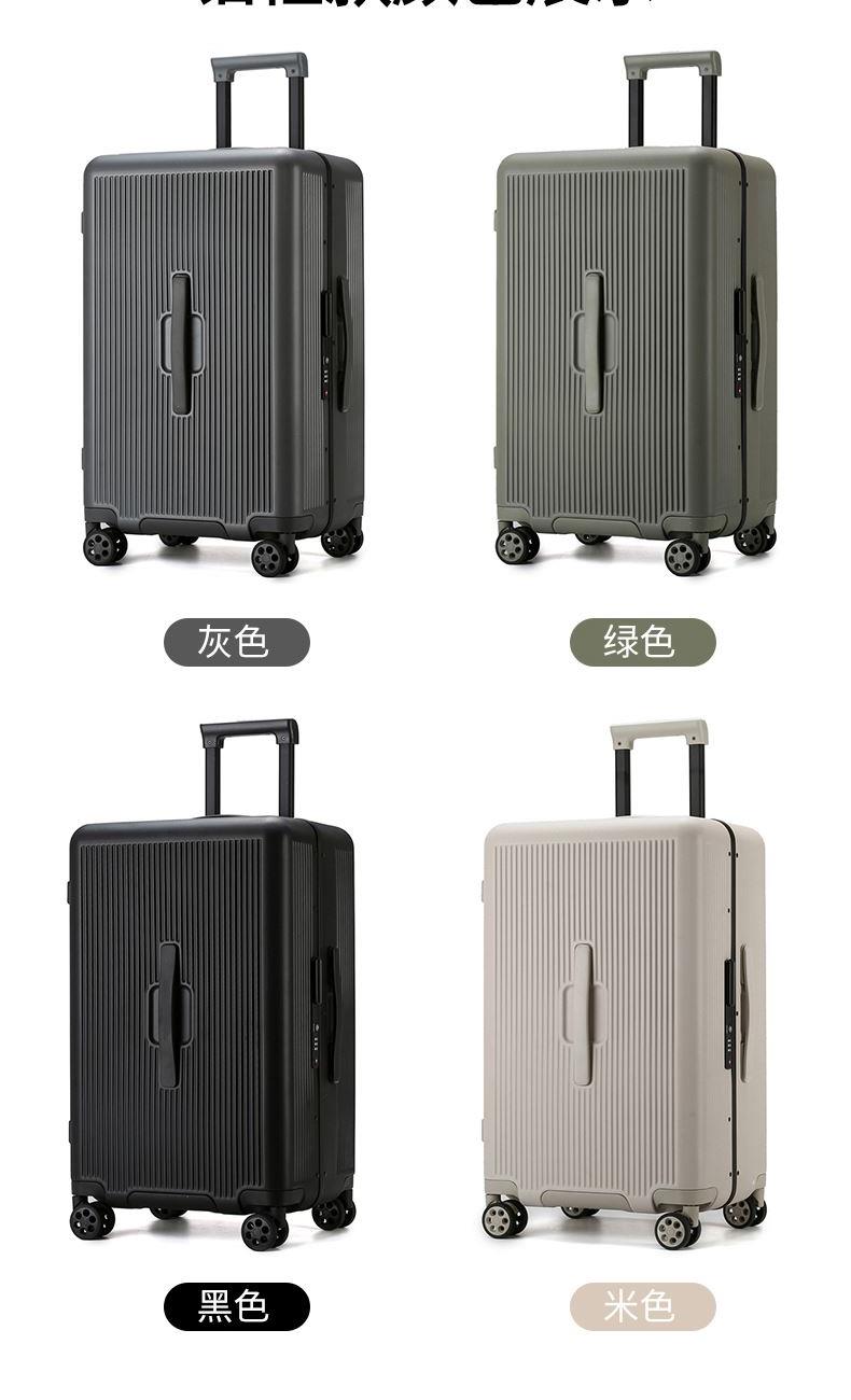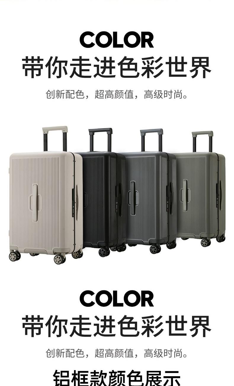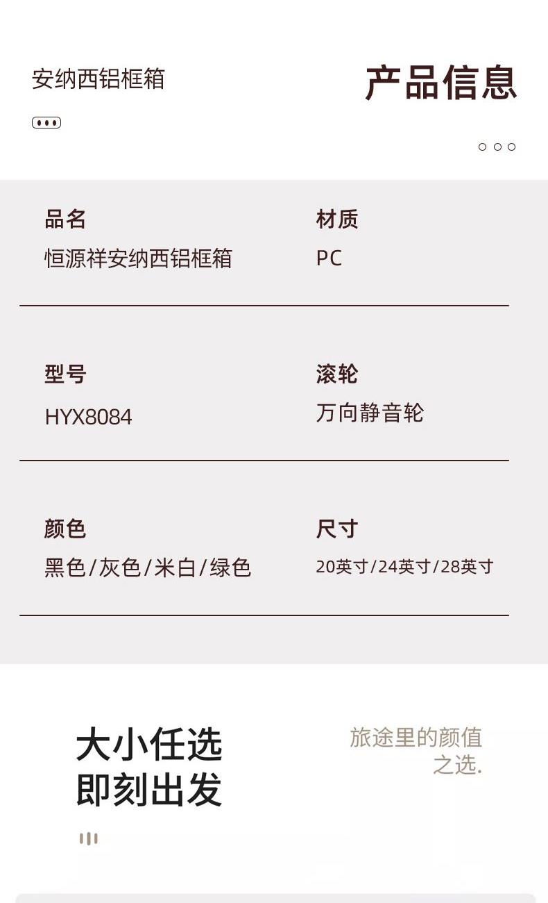 产品型号:HYX8084-28 产品重量:4.7kg 产品规格:28英寸 产品颜色:黑色/灰色/米白/绿色 产品卖点:德国拜耳PC材质,质地轻盈,高耐热、抗冲击、阻燃、刚硬、柔韧(可踩、摔不变形),犹如护盾般保护着箱内物品; 优质触感耐用提手,柔软触感,温柔接触; 全配色耐磨万向静音轮,运用跑车车轮的设计原理,采用静音材质包裹,360度自由旋转,降噪减震灵动自如,耐磨高弹性TPE材料,触感柔软,负重与减震能力俱佳;; 全铝合金拉杆,航空铝材,美观耐用; 怡丰海关密码锁,标准海关开箱检查锁具; 采用苹果CNC边框工艺,贴合箱体的U型金属窄边框架,安全稳固经久耐用。