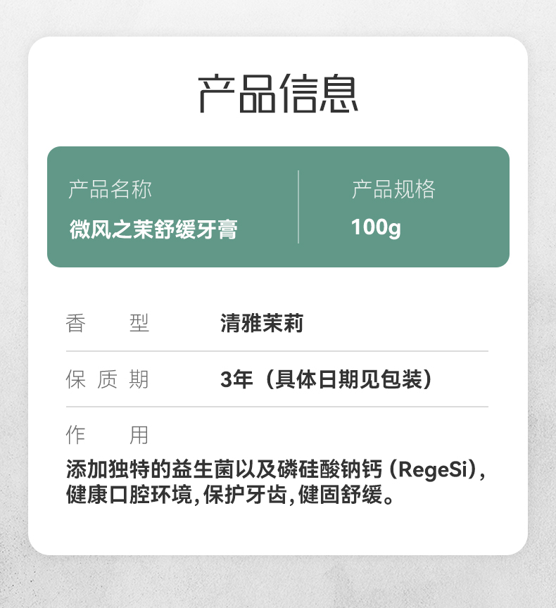 容量:100g 型号:YG-SH100-1 1.呵护牙齿,茉莉香型,无水益生菌配方,热感牙膏。 2.成分-磷硅酸钙,刷牙时释放钙离子、磷离子可进入牙本质键合封堵均匀填补牙齿表面孔洞,修护牙釉促进牙本质再矿化。 3.增加口腔益生菌(乳酸杆菌),通过共凝集作用物理性移除附着于口腔内的坏菌减少牙菌滋生维护口腔环境平衡。 4.富含水合硅石,更适合易受刺激牙齿使用的摩擦剂细腻温和,使牙齿更光滑清洁牙齿的同时,减少磨损