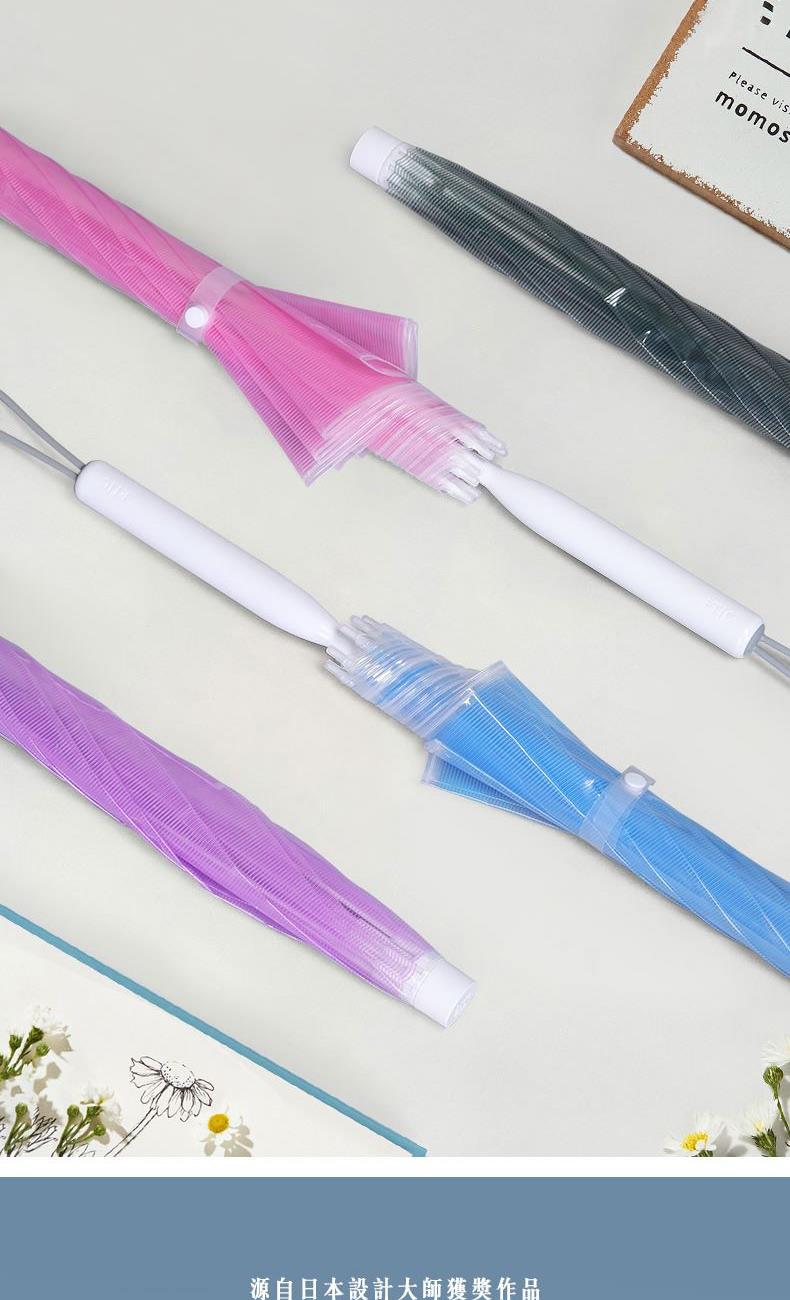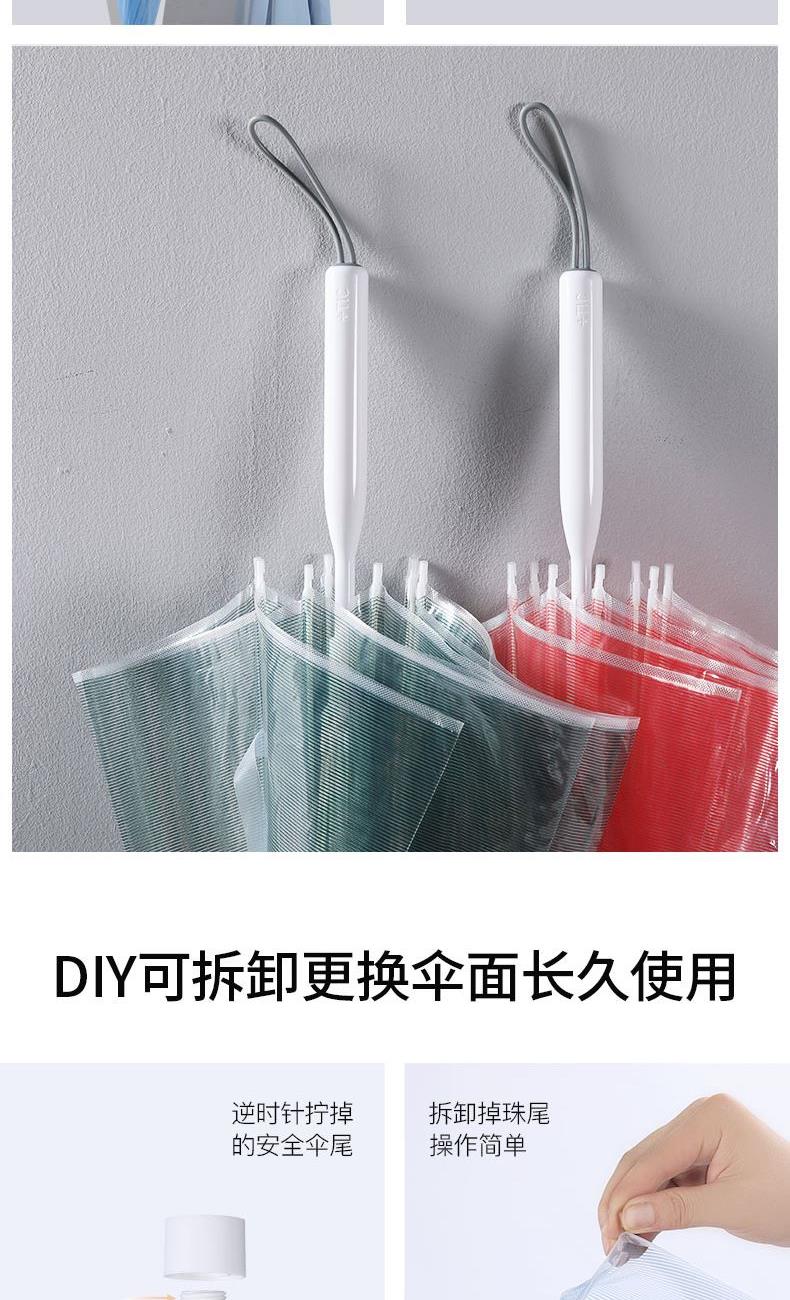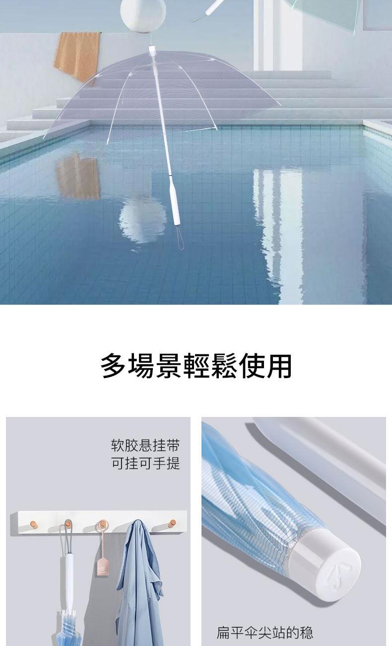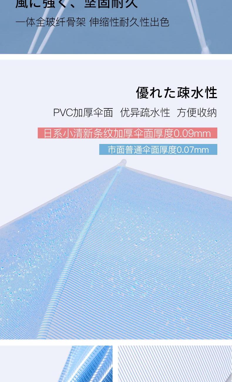 1、伞面加厚,普通PVC伞面0.07mm,我们的是0.09mm, 伞面印刷了细条纹,保持了透明伞的透度,日式小清新感觉。 2、软胶悬挂带,舒适方便,白瓷感钢漆烤漆 ,高颜值高品质体现。 3、透明伞的亮点就是雨天用他太美,拍照自拍道具神器。