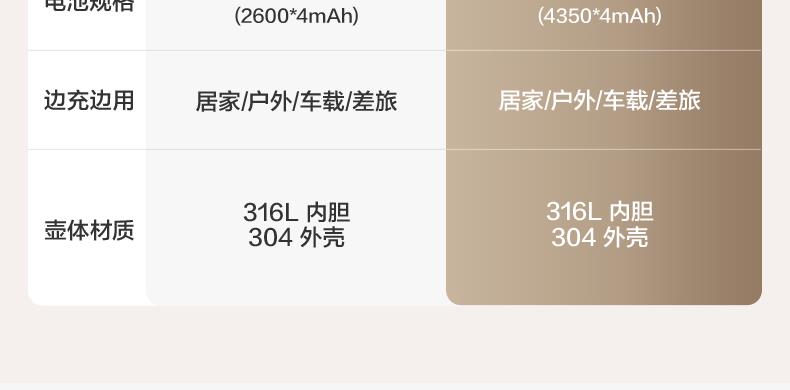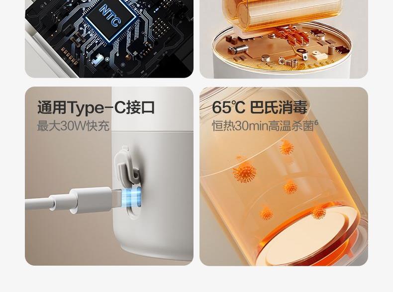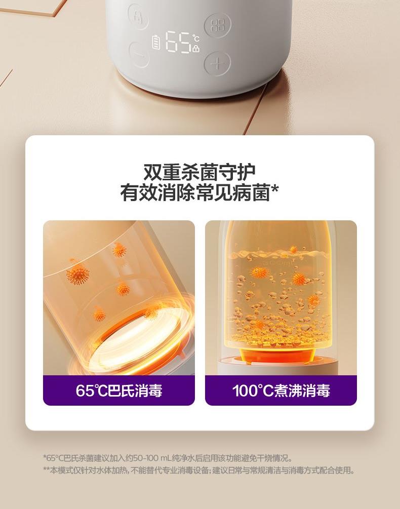 主要材质:PP、316不锈钢 电池规格:14.4V⎓2600mAh 充电电压/电流:5V⎓2A9V⎓2A15V⎓2A20V⎓1.5A 额定功率:120W 无线恒温加热,出行冲奶方便,档温度选择,更匹配多种奶粉冲调。 双杯盖,持久保温,饮水方便,童锁防误触 安全材质: 杯盖:内盖PP、外盖PP+SUS316L内胆 杯身:SUS316L内胆、SUS304外壳 记忆功能,可减少重复设定,支持65°C巴氏消毒 NTC感温,35°~60°C双模式调节:一度一调、5度一档调节(35℃、40℃、45℃、50℃、55℃、60℃)多档温度选择,更匹配多种奶粉冲调 边充边用:支持(备注:电量低于50%不能边充边用)