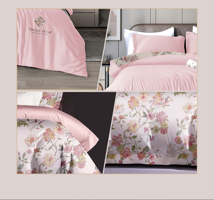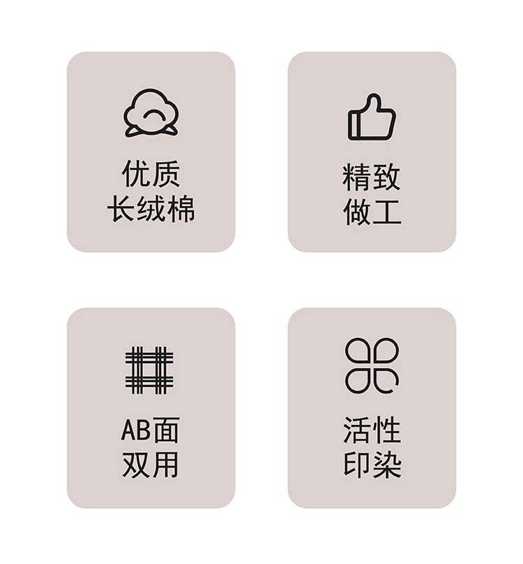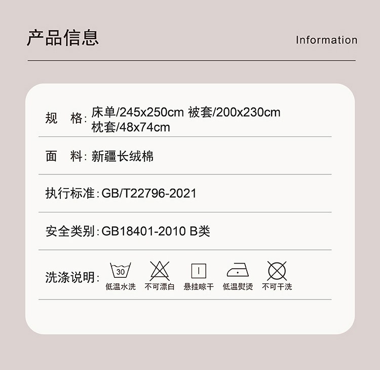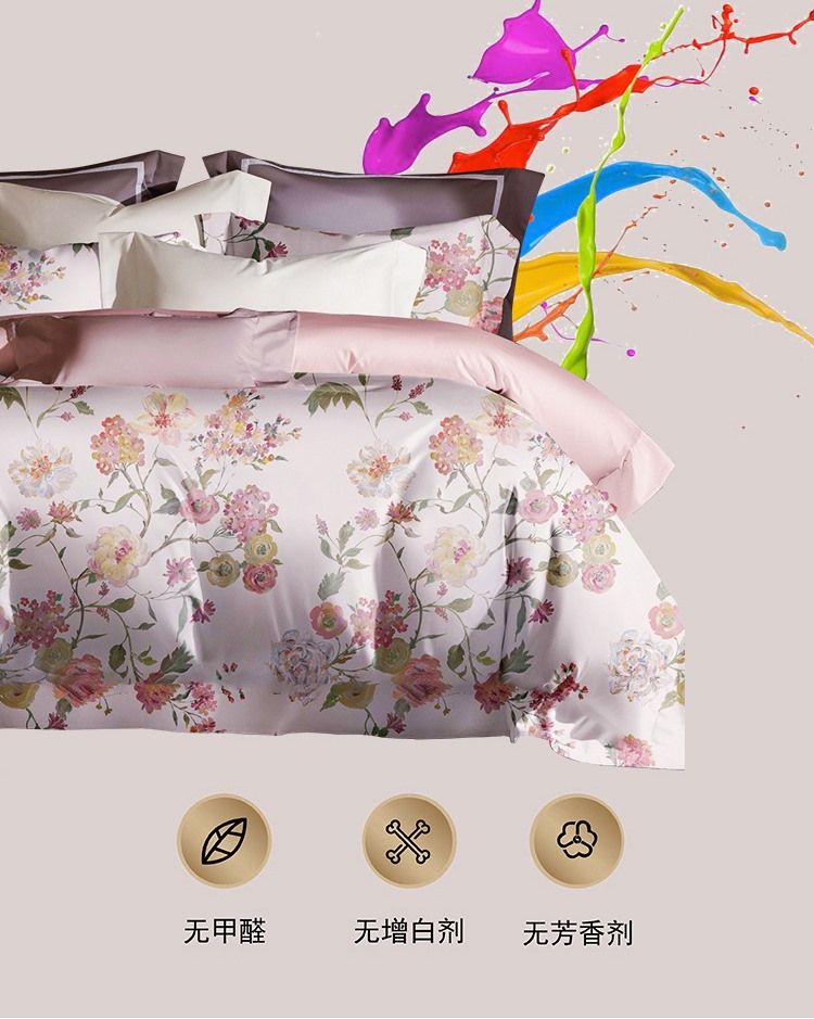 床单:245x250cm 被套:200x230cm 枕套:48x74cm 【面 料】新疆长绒棉 A版:100支长绒棉印花 B版:80支长绒棉绣花 产品特点: 1.面料选用优质长绒棉,触感丝滑,亲肤舒适; 2.AB双面用设计,A面采用100支长绒棉中式印花,高贵大气;B面采用80支长绒棉纯色绣花设计,层次立体; 3.活性印染工艺,色彩绚丽,色牢度高,久洗如新; 4.静谧的色彩、精致的工艺细节,展现典雅气质,为居家生活增添雍容雅致