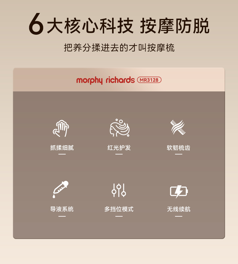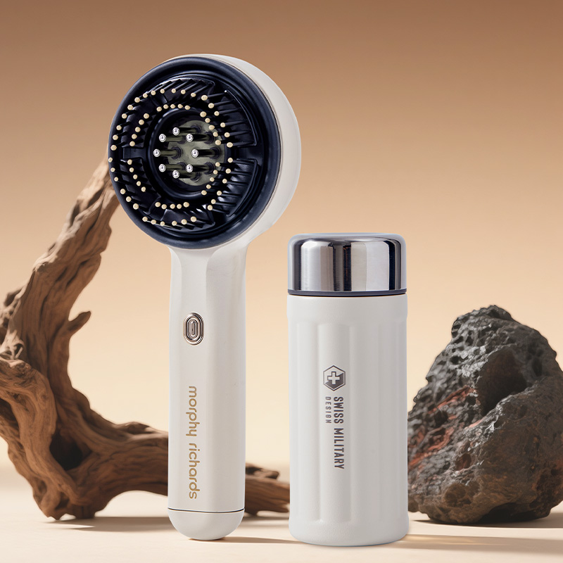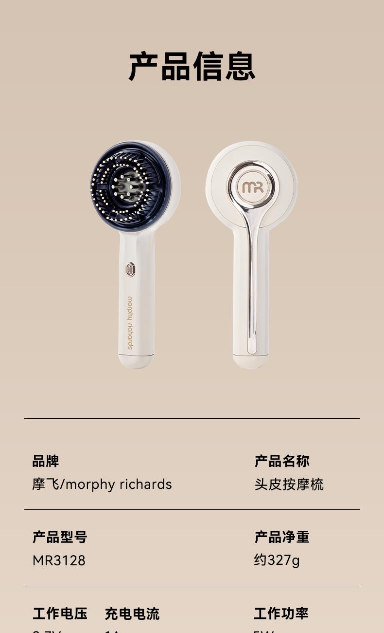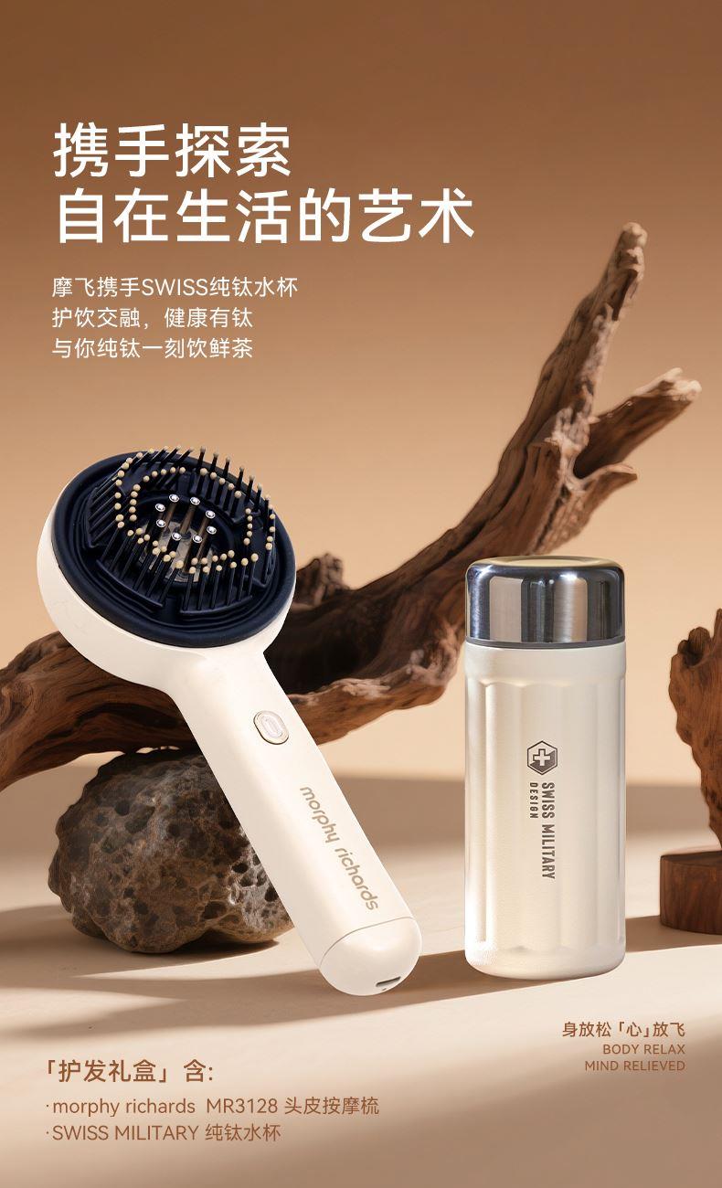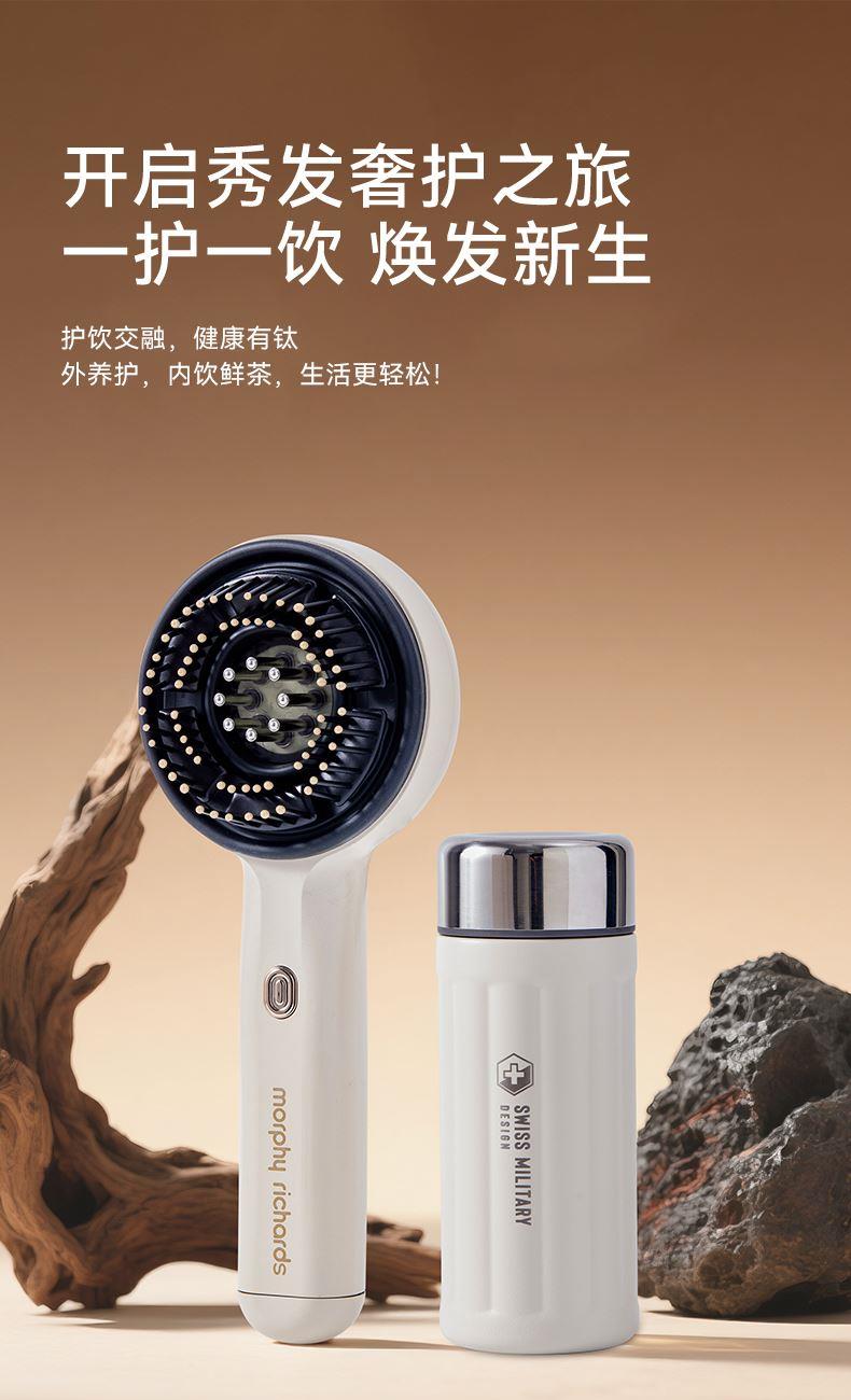 69码 6975660321281(按摩梳)、6977576670699 (保温杯) 型号 MR3128TB1120-9 产地 浙江温州(按摩梳) 浙江杭州(保温杯) 净重 250g(按摩梳)160g(保温杯) 毛重 905g 包装尺寸 21.5X25.5X7cm(彩盒) 大箱尺寸 42*48*55cm 续航:约12个循环(开机默认模式) 充电时间:≈120min 按摩梳材质:ABS+PP+硅胶、保温杯材质: 覆钛 按摩梳工作功率:10W 按摩梳充电接口:Type-C 按摩梳电池容量:1400毫安 按摩梳配件:主机,充电线,收纳袋,说明书 执行标准:GB4706.1-2005/GB4706.10-2008 卖点: 摩飞头皮按摩梳MR3128 “真抓揉”开穴舒筋,解压助眠 红光光波理疗,呵护头皮 圆润梳齿,按摩不伤头皮,蓬松顺发 边梳边导液,营养直达头皮,高效吸收 大容量长续航,可使用约10天 流线型握把,轻巧易握,小巧收纳 瑞士军工琉森水波口袋杯TB1120-9 钛晶技术380℃以上高温锤炼145道匠心工序 覆纯钛内胆,无惧酸碱腐蚀,保鲜保味 表面仿钛晶工艺,0重金属健康环保 长效锁温,6-12小时保温保冷 200ml口袋尺寸,小巧便携,易携带