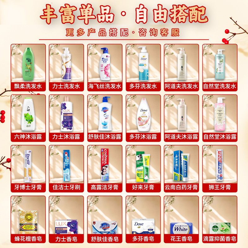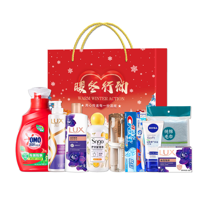 礼盒尺寸: 34*8.5*27cm 包装尺寸:69*37.5*56.5CM 产品配置:(香型随机) 力士洗发水(400ml) 力士沐浴露(350ml) 力士香皂(105g) 佳洁士牙膏(90g) 三笑牙刷 透明洗漱杯(旅行便携式) 奥妙洗衣液(950g) 妮维雅多效润手霜(50g) SNGO护衣留香珠(220g) 精美礼盒
