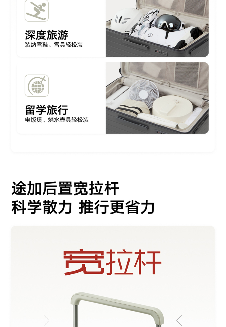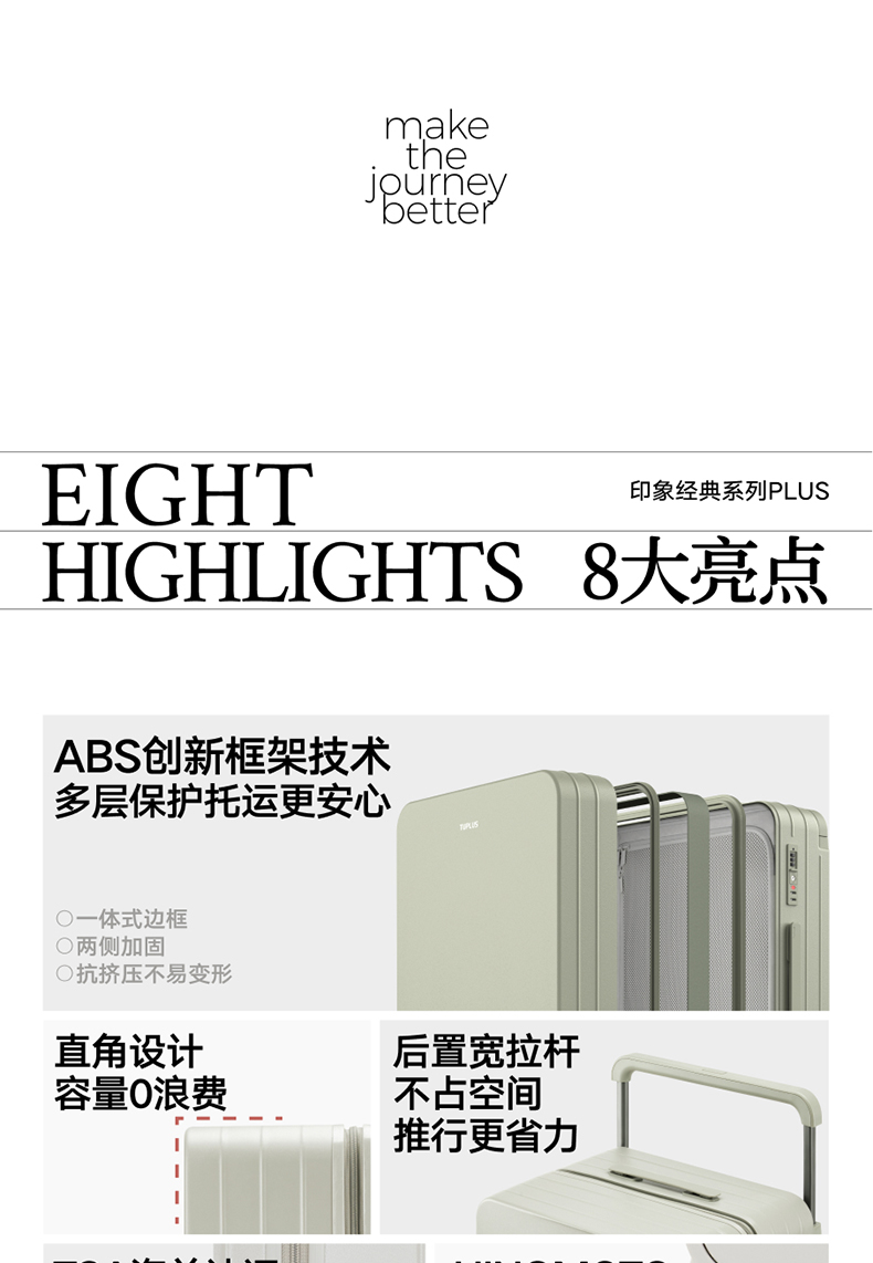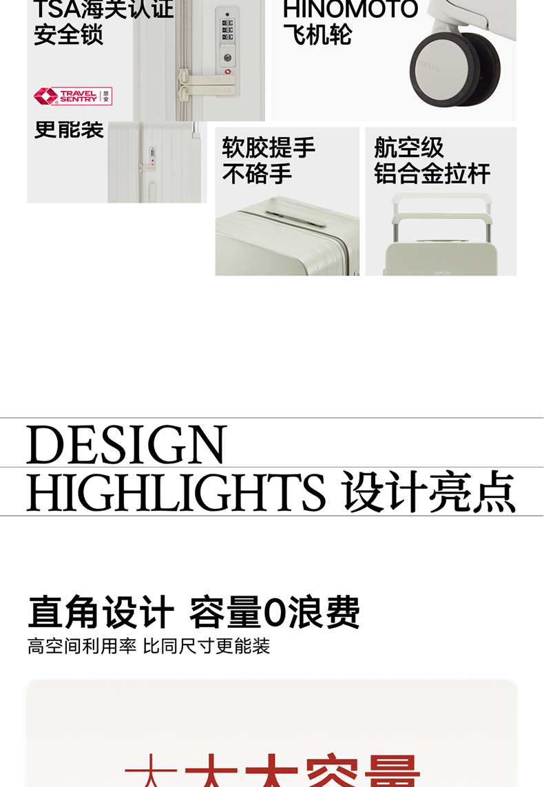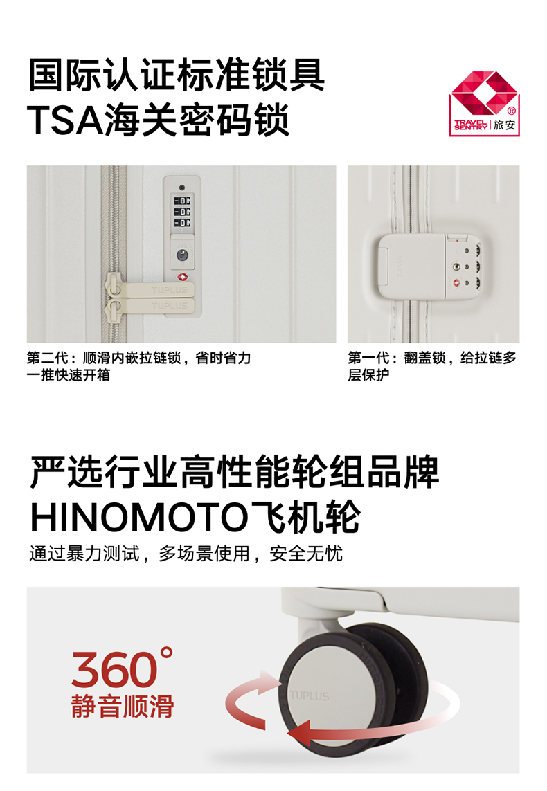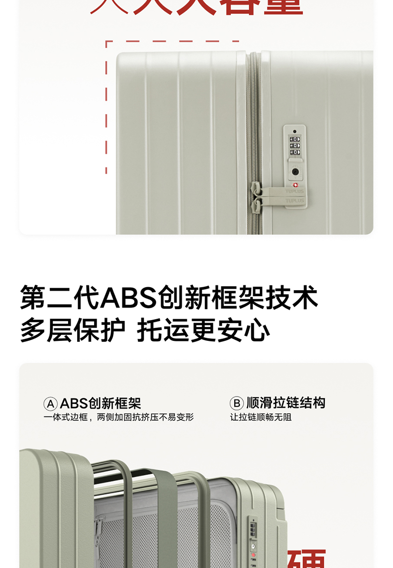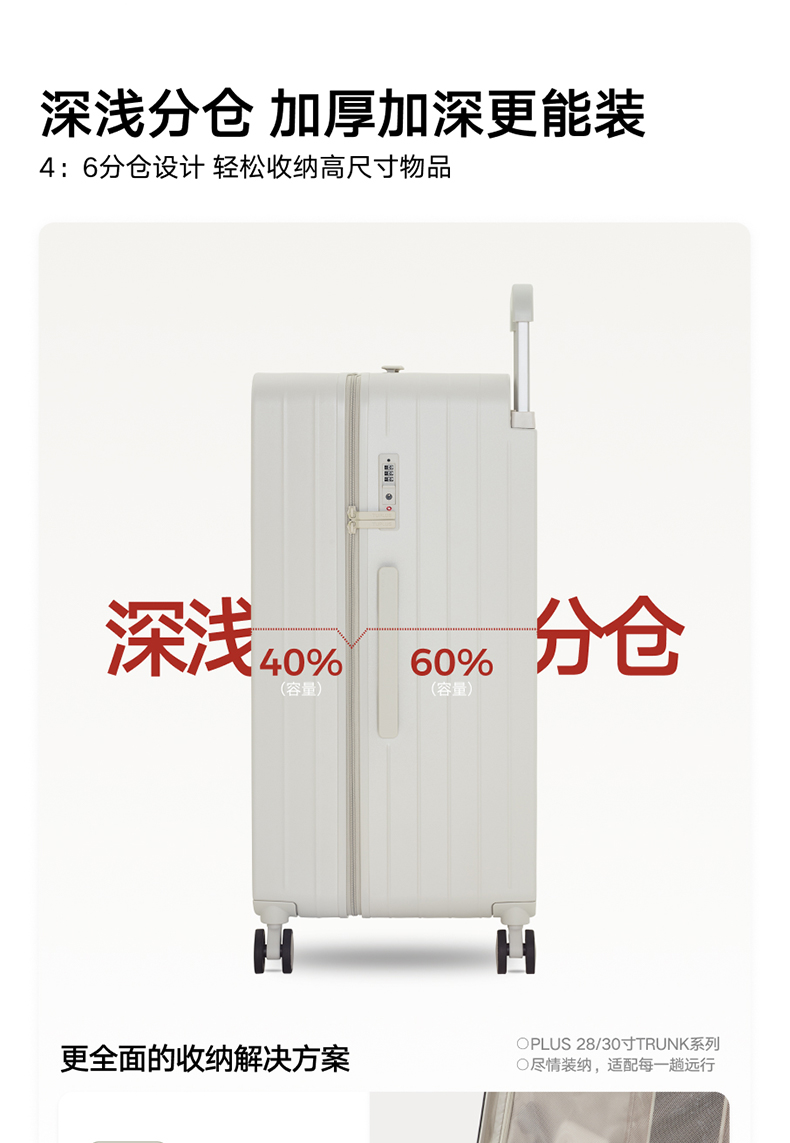 ABS创新框架技术多层保护托运更安心 O一体式边框 O两侧加固 O抗挤压不易变形 直角设计容量0浪费 安全锁 TSA海关认证 EEAM! 1 深浅分仓加厚加深更能装 后置宽拉杆不占紂志空间推行更省力 软胶提手不硌手 O30寸特有 HINOMOTO双轴飞机轮 航空级铝合金拉杆