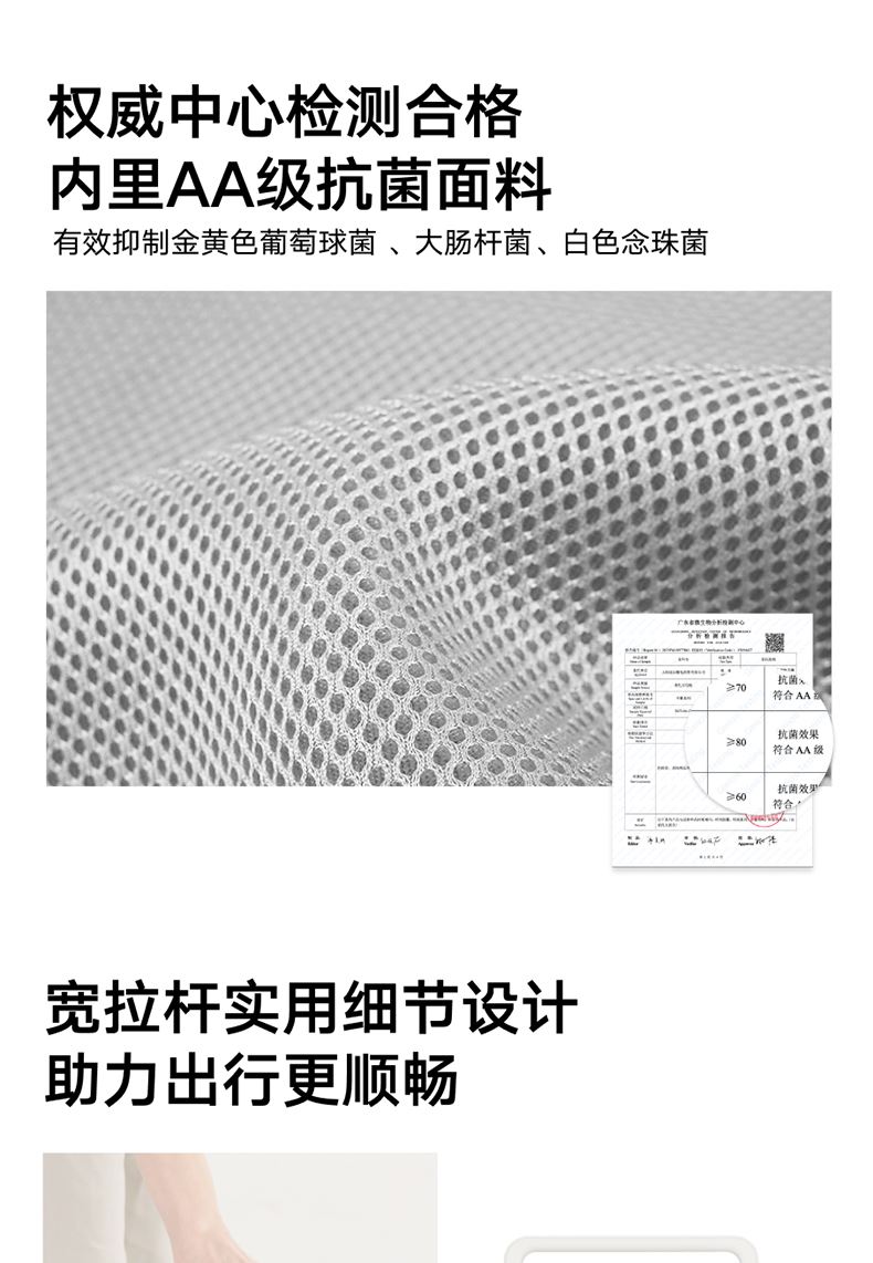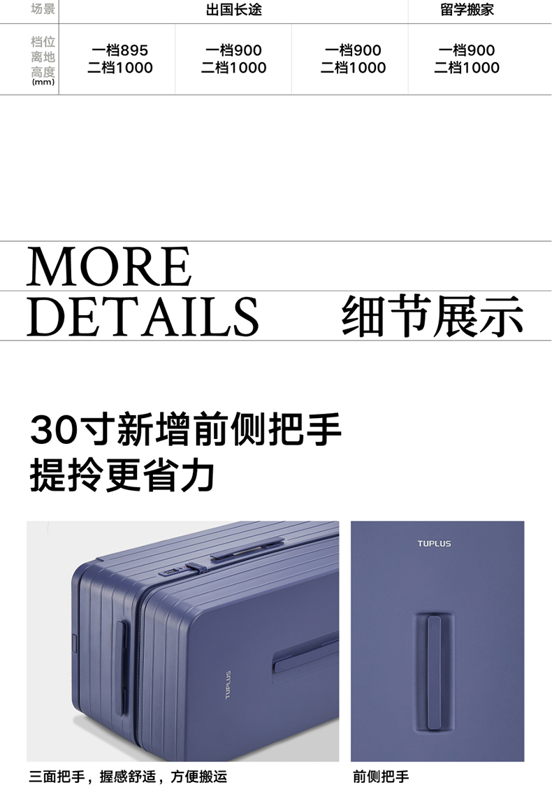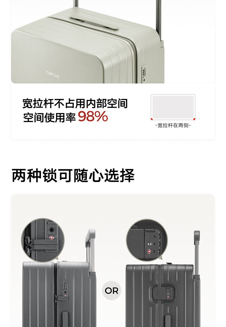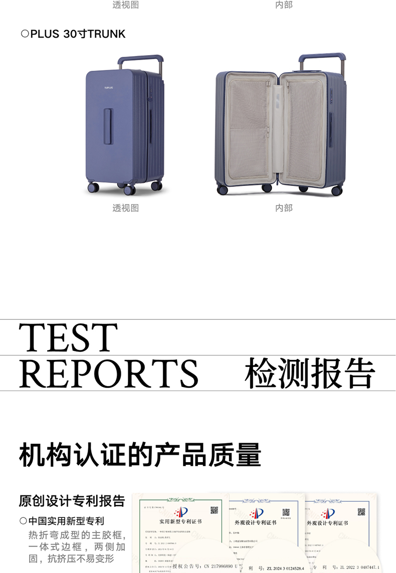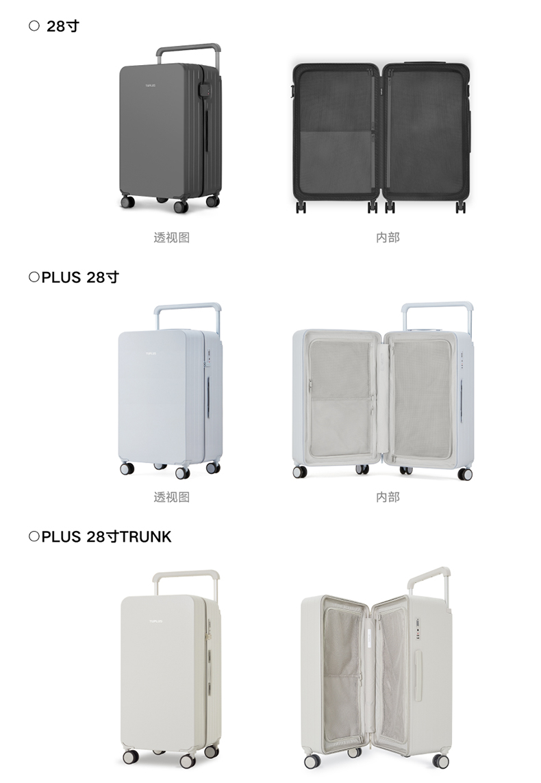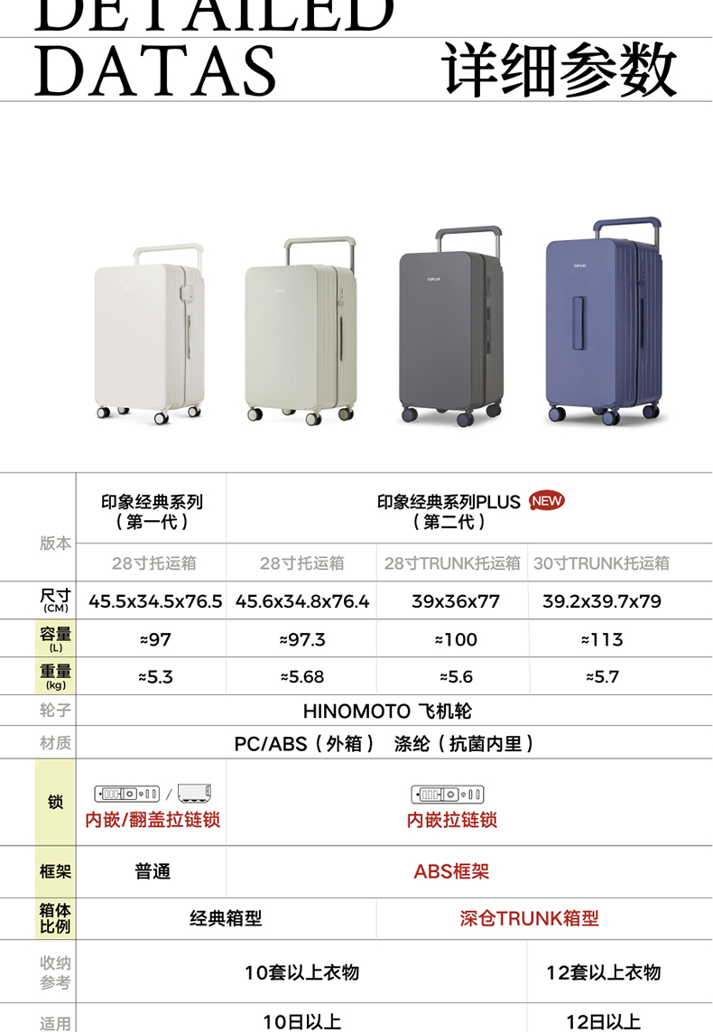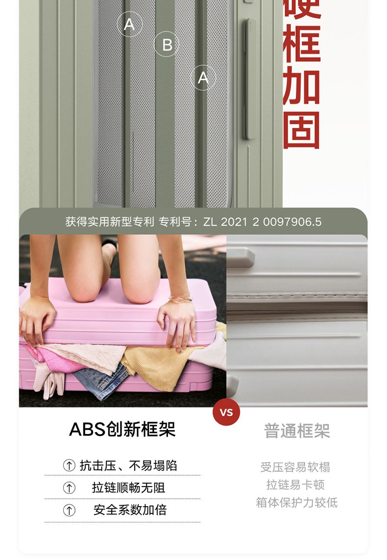 ABS创新框架技术多层保护托运更安心 O一体式边框 O两侧加固 O抗挤压不易变形 直角设计容量0浪费 安全锁 TSA海关认证 EEAM! 1 深浅分仓加厚加深更能装 后置宽拉杆不占紂志空间推行更省力 软胶提手不硌手 O30寸特有 HINOMOTO双轴飞机轮 航空级铝合金拉杆
