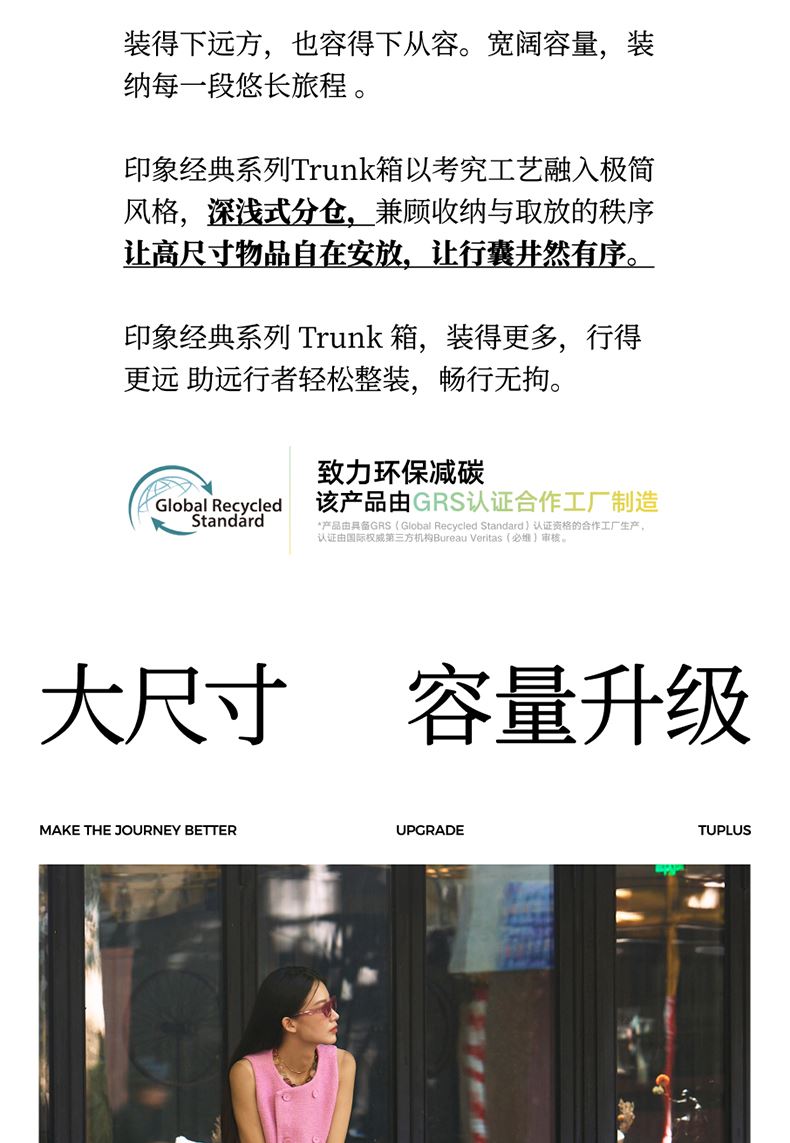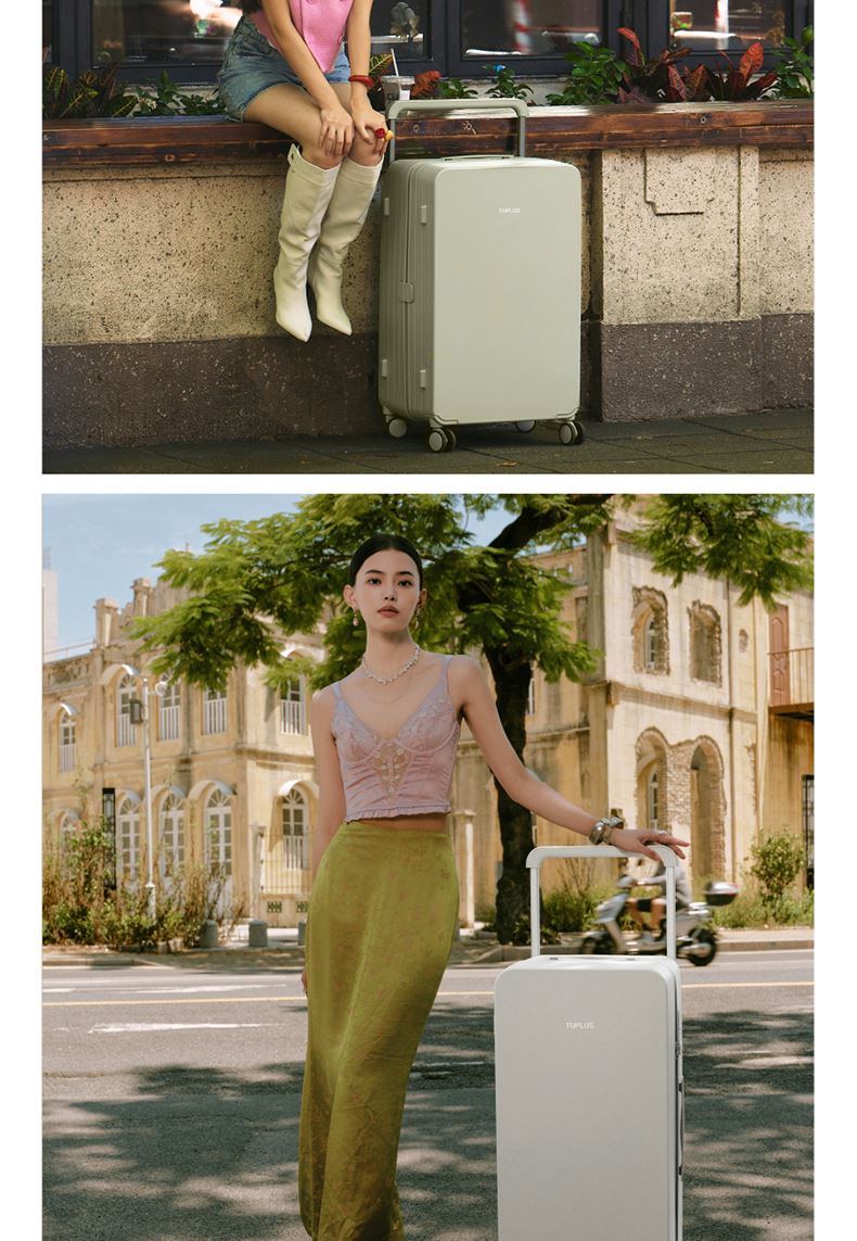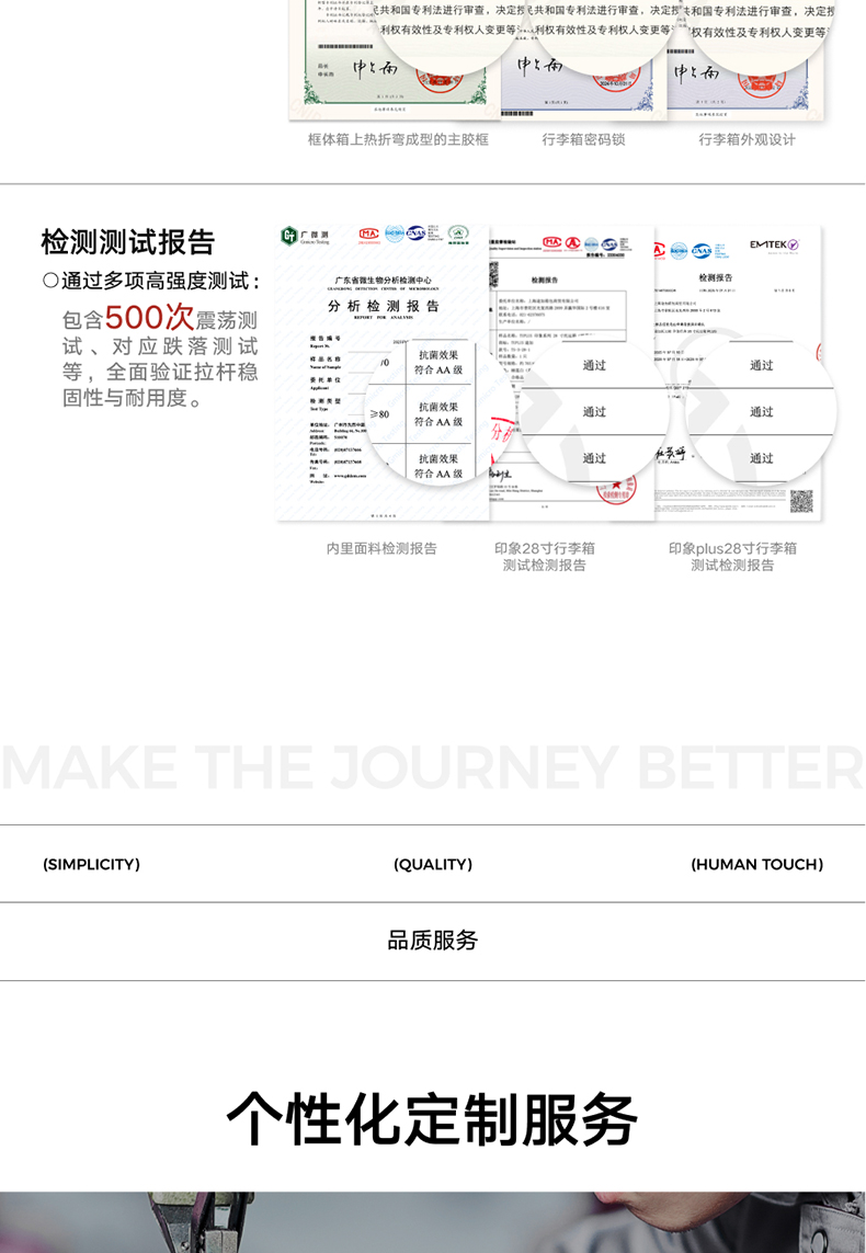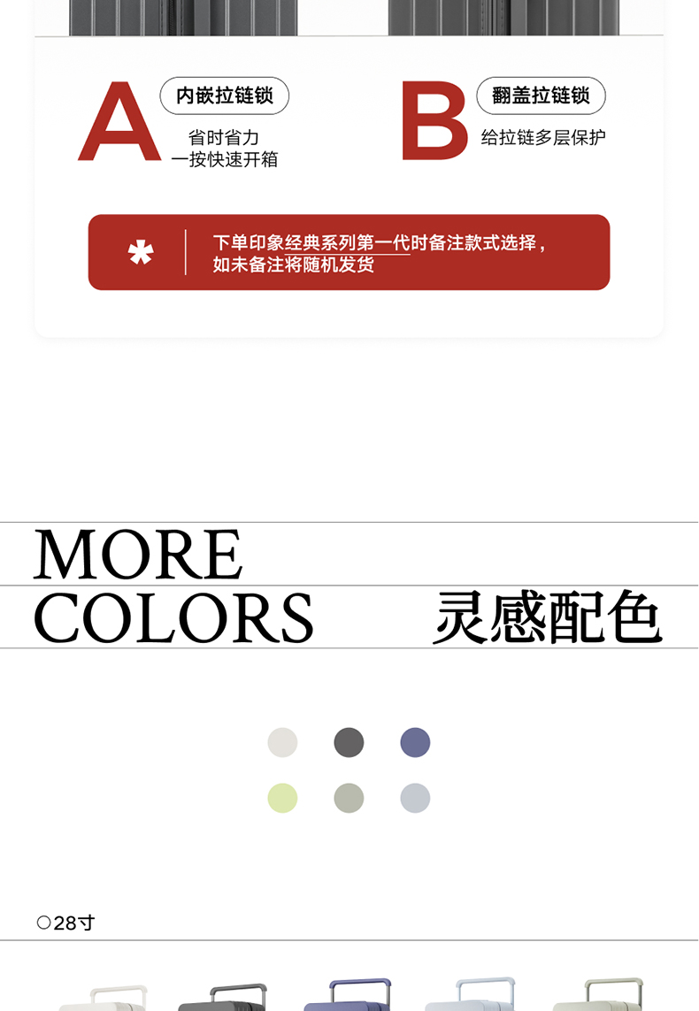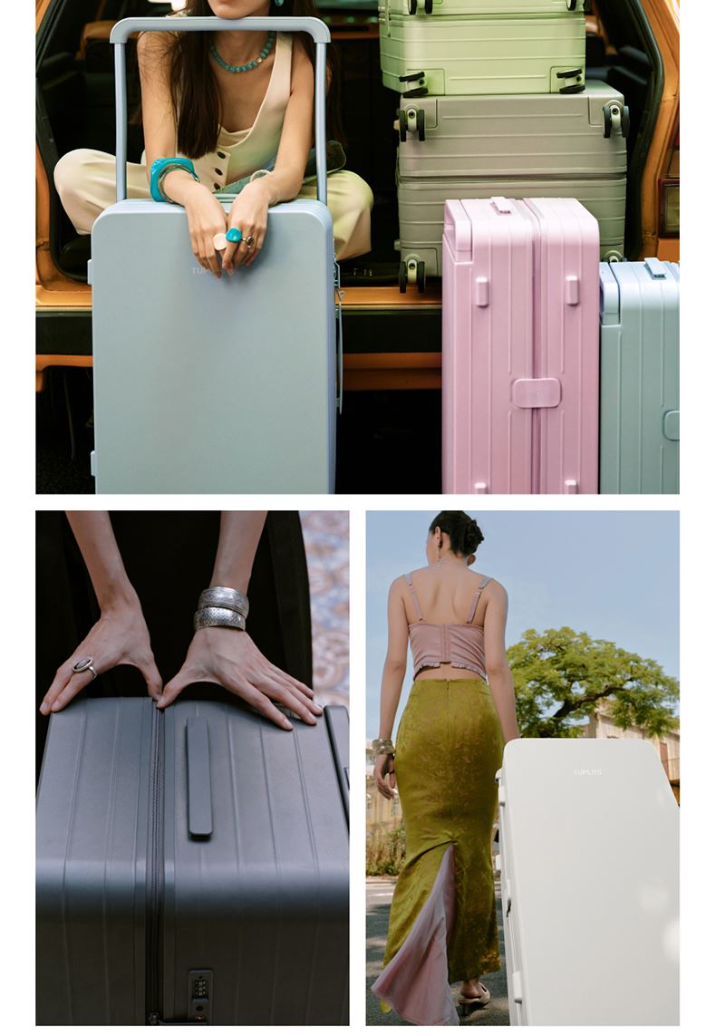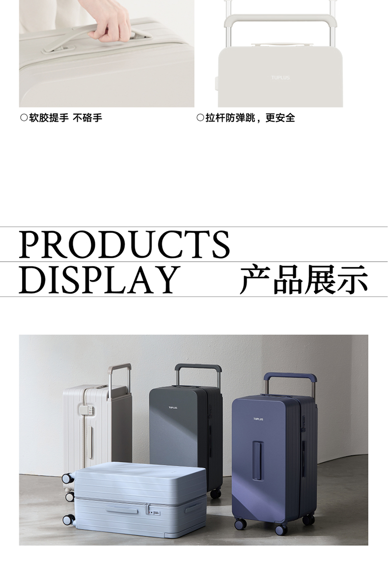 ABS创新框架技术多层保护托运更安心 O一体式边框 O两侧加固 O抗挤压不易变形 直角设计容量0浪费 安全锁 TSA海关认证 EEAM! 1 深浅分仓加厚加深更能装 后置宽拉杆不占紂志空间推行更省力 软胶提手不硌手 O30寸特有 HINOMOTO双轴飞机轮 航空级铝合金拉杆