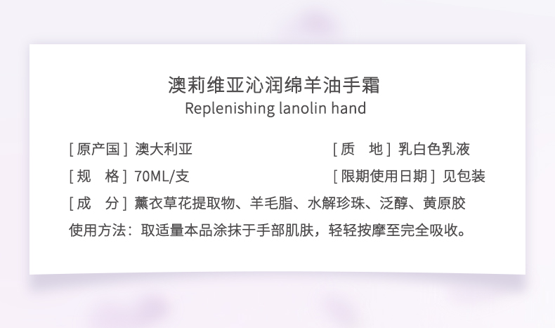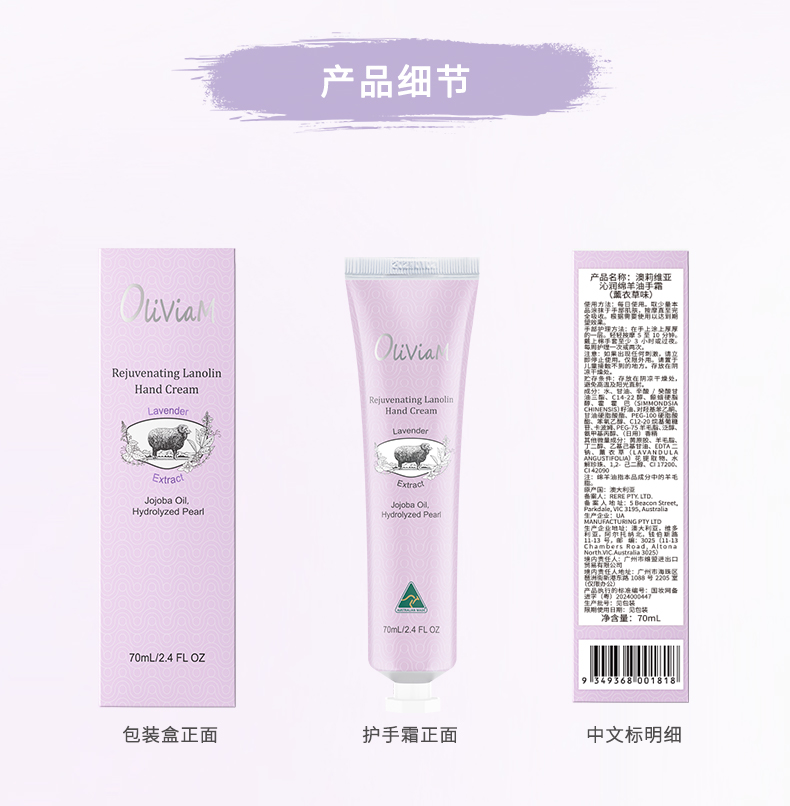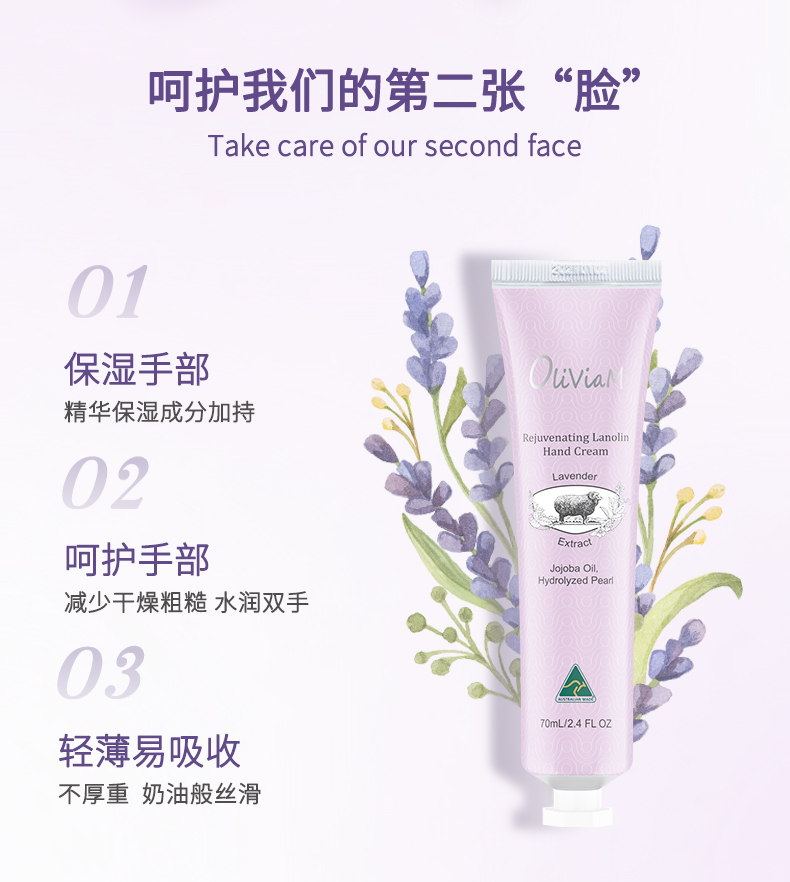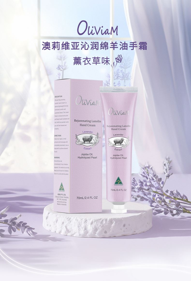 澳大利亚原装进口:OLIVIAM澳莉维亚沁润绵羊油手霜(薰衣草味) 芬芳四溢的玫瑰精华搭配保湿的绵羊油,降低手部干燥,使肌肤感到水润。 澳莉维亚个护美妆系列(澳大利亚原装进口),京东自营5W+销量,京东旗舰店,天猫旗舰店 !2025抖音小红书畅销产品.,支持一件代发!2、原装进口,品质好,