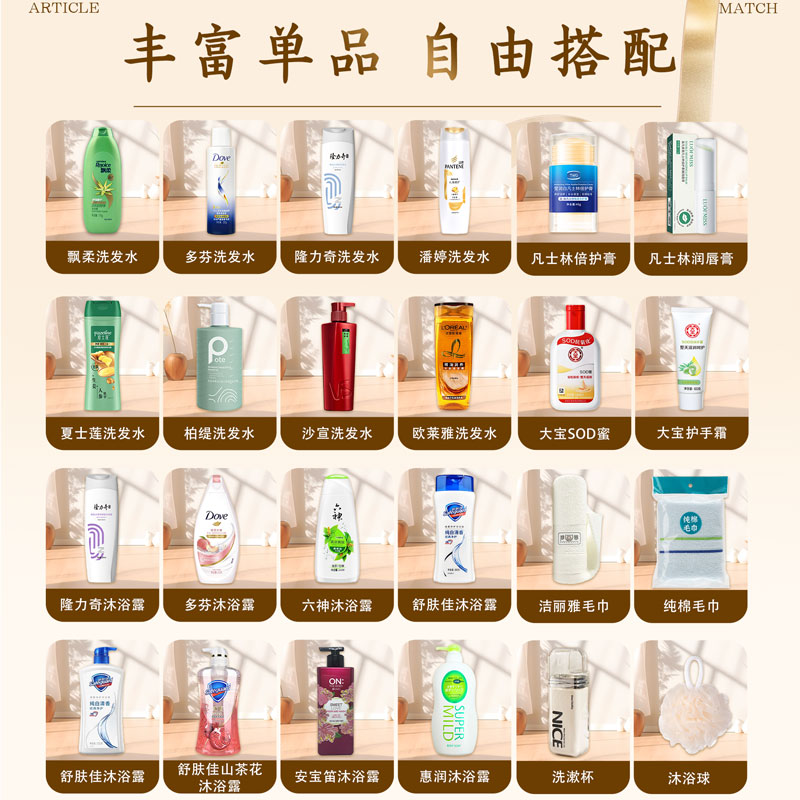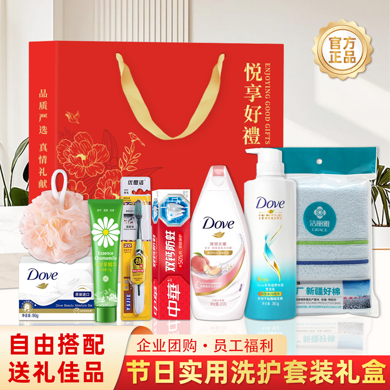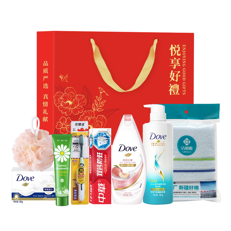 礼盒尺寸:32*8.5*24.5cm 包装尺寸:66*46.5*51CM 产品配置:(香型随机) 洋甘菊护手霜75g 多芬洗发水380ml 多芬沐浴露300ml 中华牙膏90g 多芬香皂90g 洁丽雅毛巾 优思洁牙刷 沐浴球