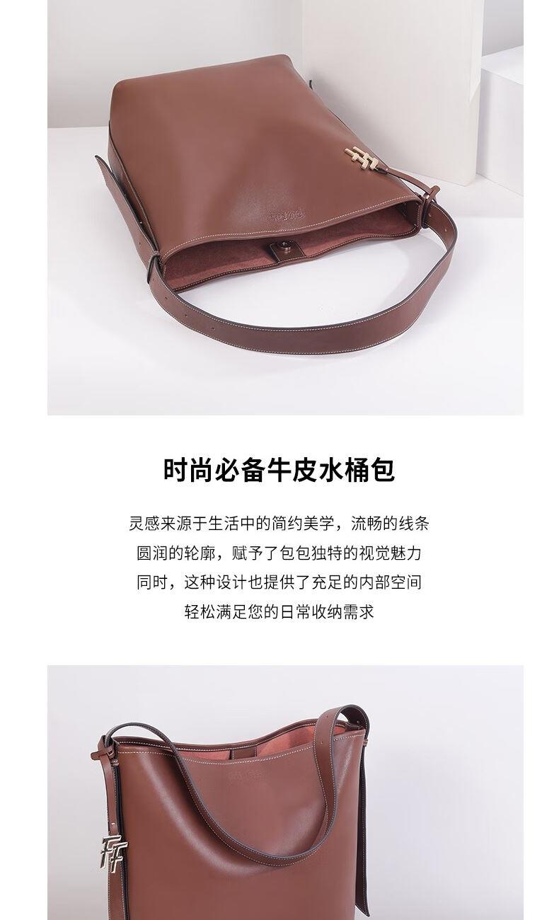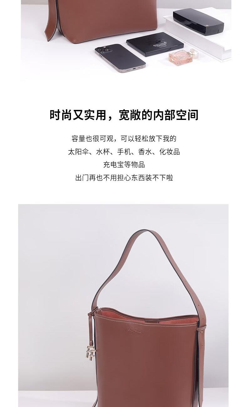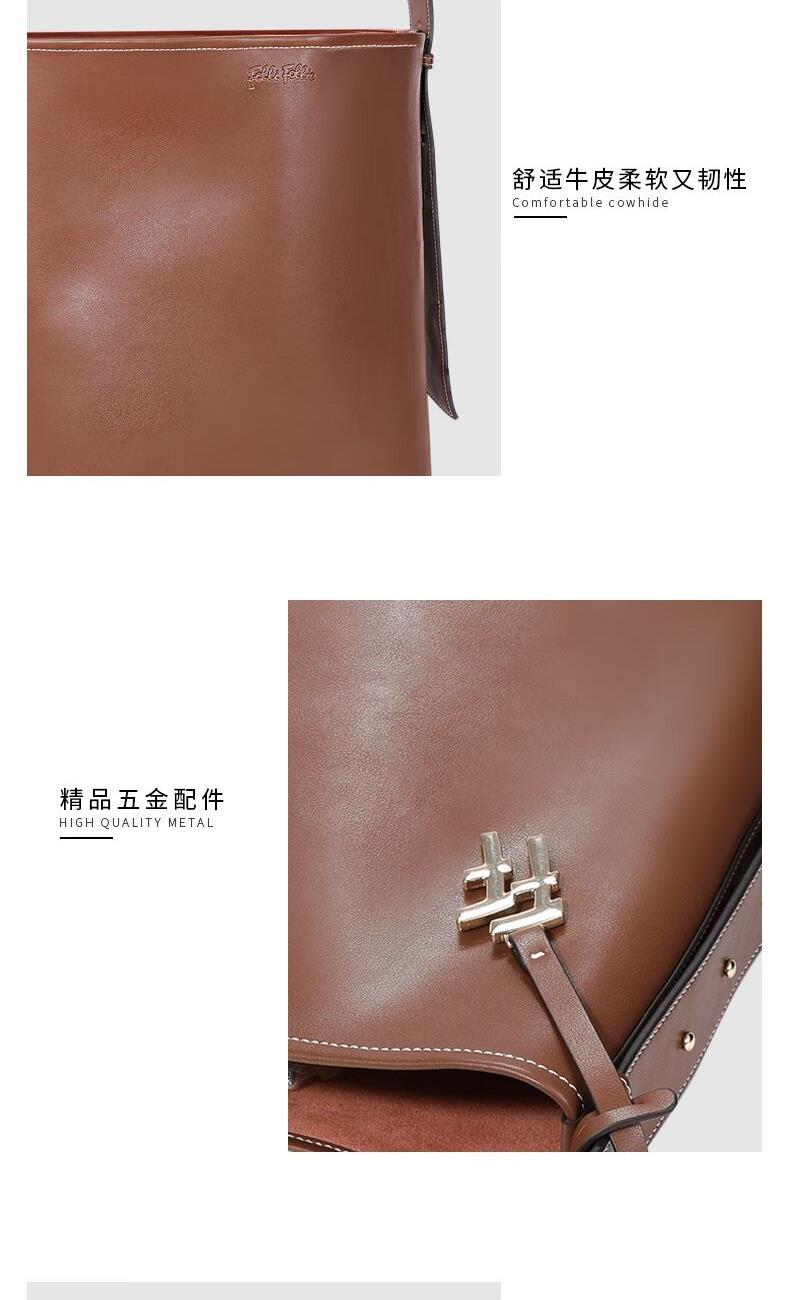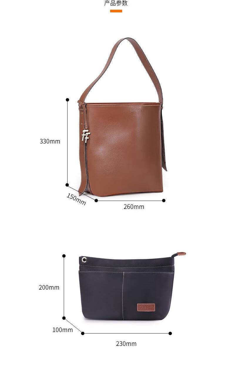 圆润的轮廓,流畅的线条,水桶包设计赋予了包包独特的视觉魅力。 每一寸皮革都经过精细处理,保留了天然的纹理和质感。 线条流畅,造型大方,容量可观,轻松容纳您的日常物品 款式:手拎/单肩 颜色:棕色 材质:牛皮(大包);织物(小包) 尺寸:330*150*260MM(大包);200*100*230MM(小包) 克重:1086g